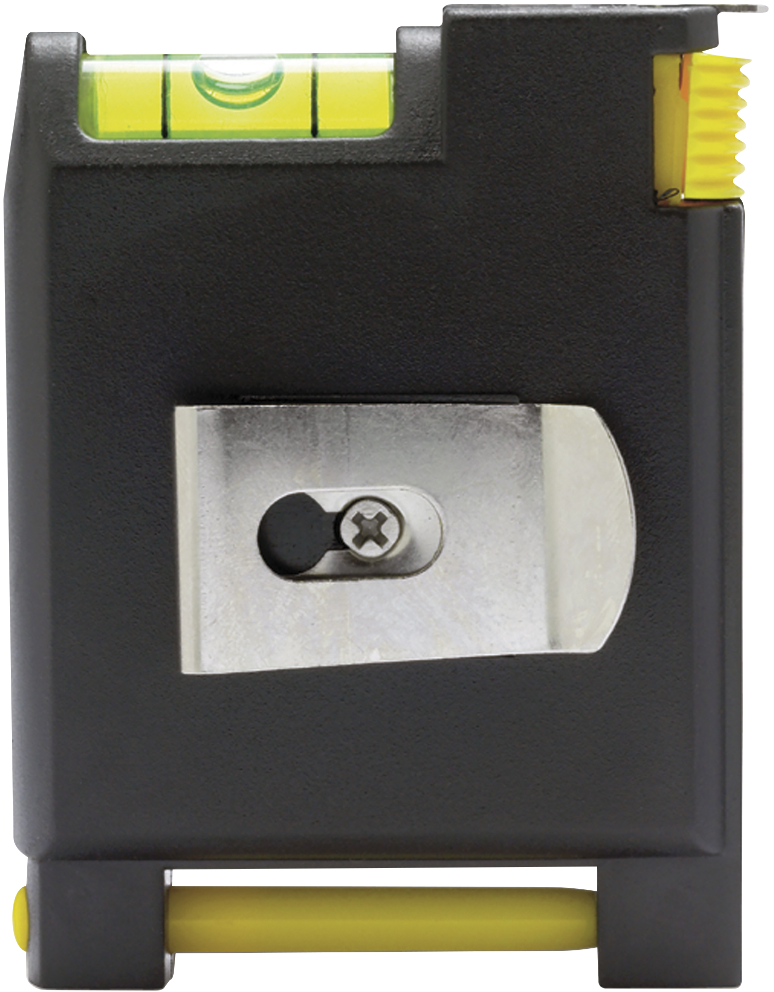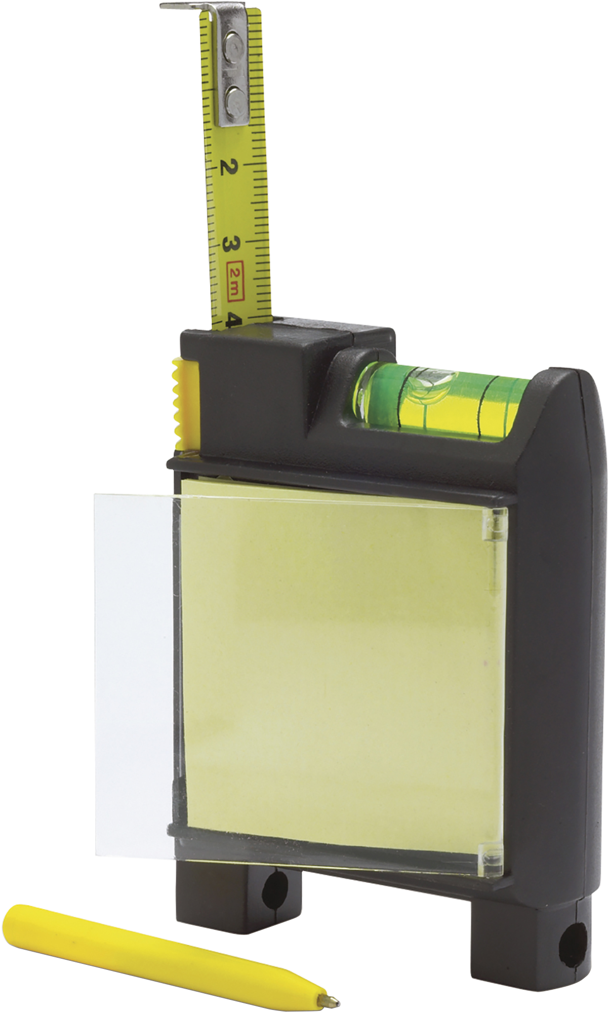 2m Tape measure with spirit level, memo pad, pen with blue ink and belt clip in a plastic casing.