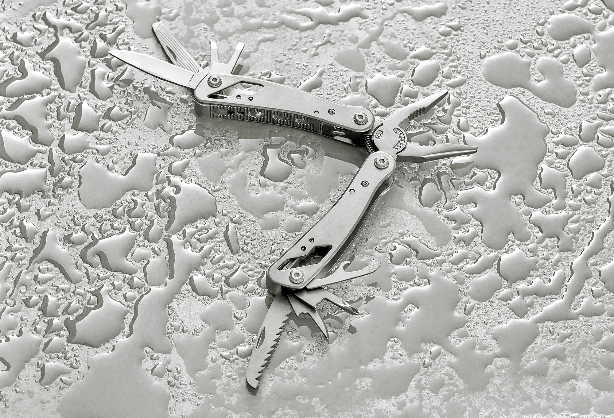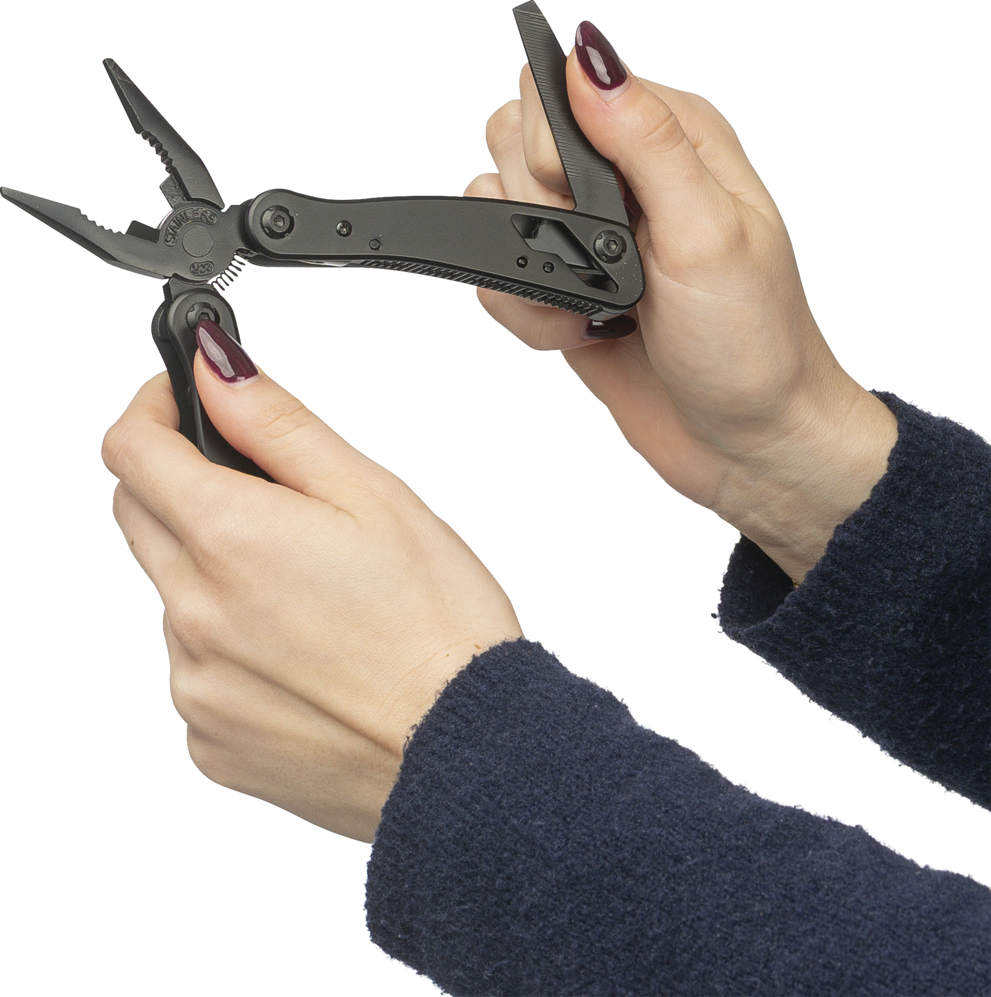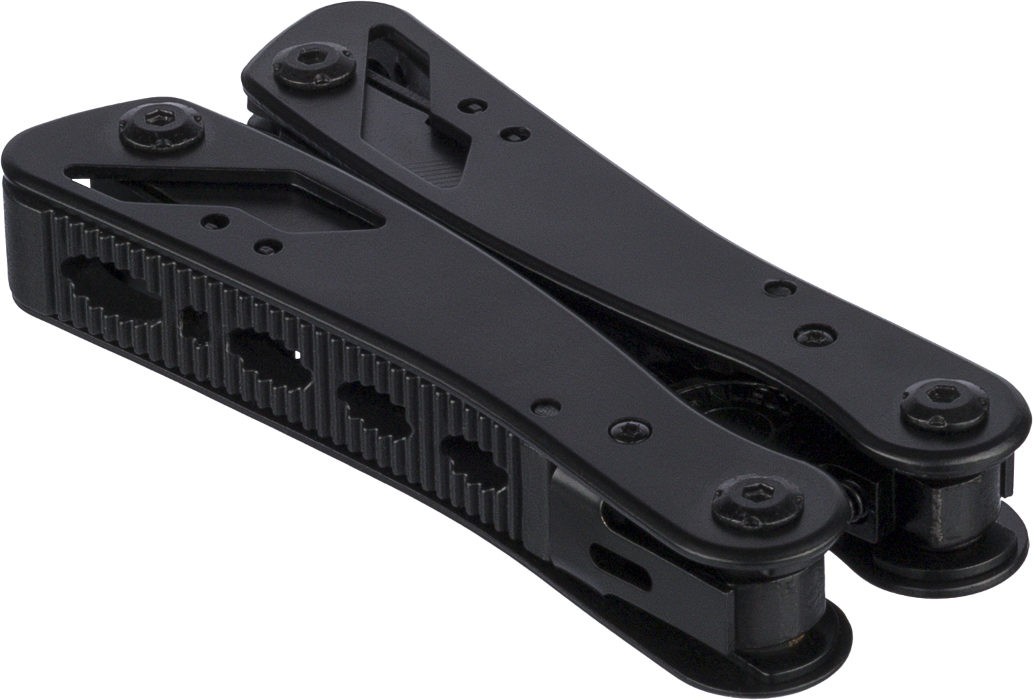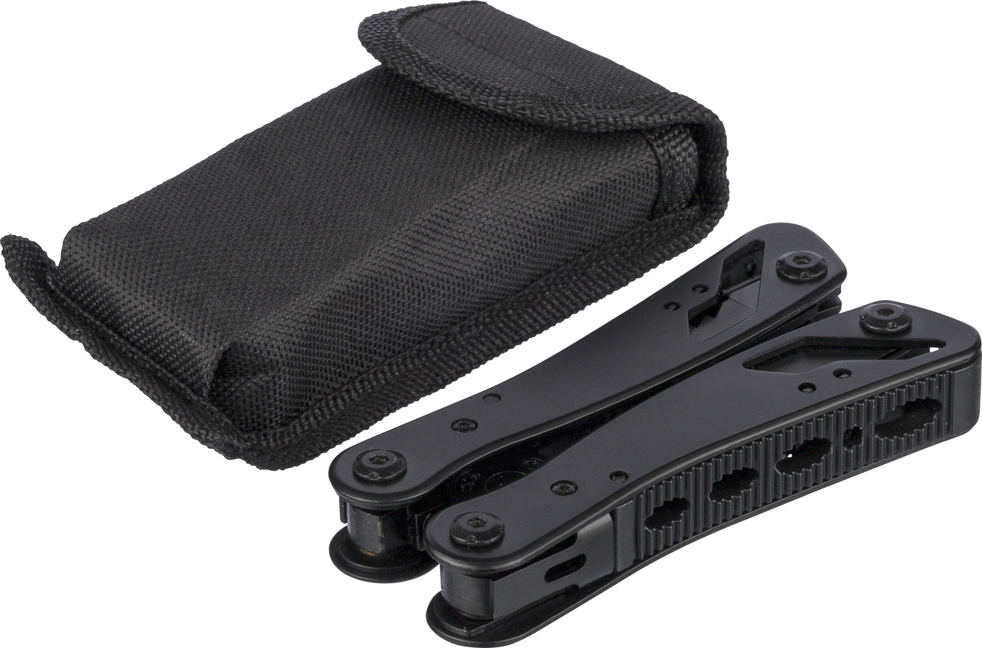 Black aluminium and stainless steel multi tool with 13 functions including knives, screwdrivers, pliers, saw, file, lever, bits, spring, loop bar, can opener, and tang. Comes with a pouch featuring a velcro belt loop and additional outer box. Individually packaged in a brown cardboard box.