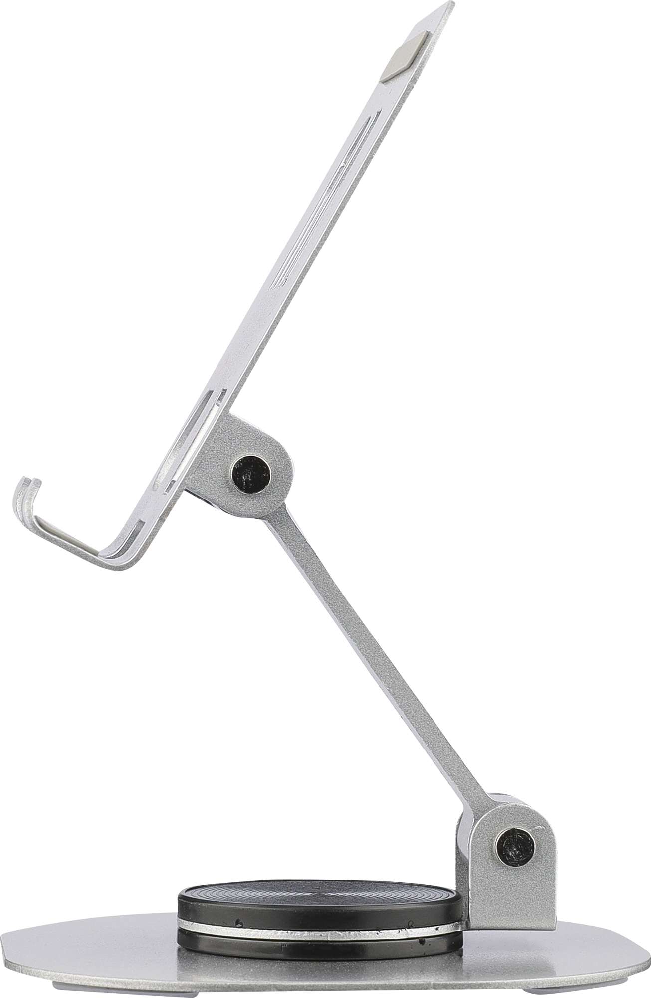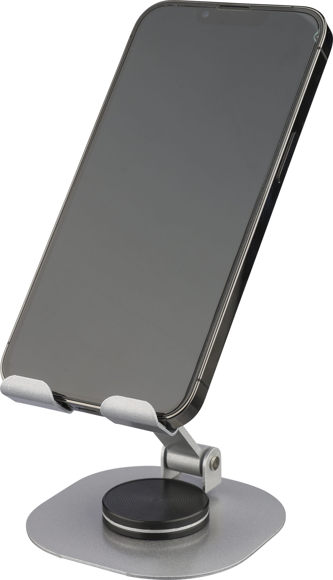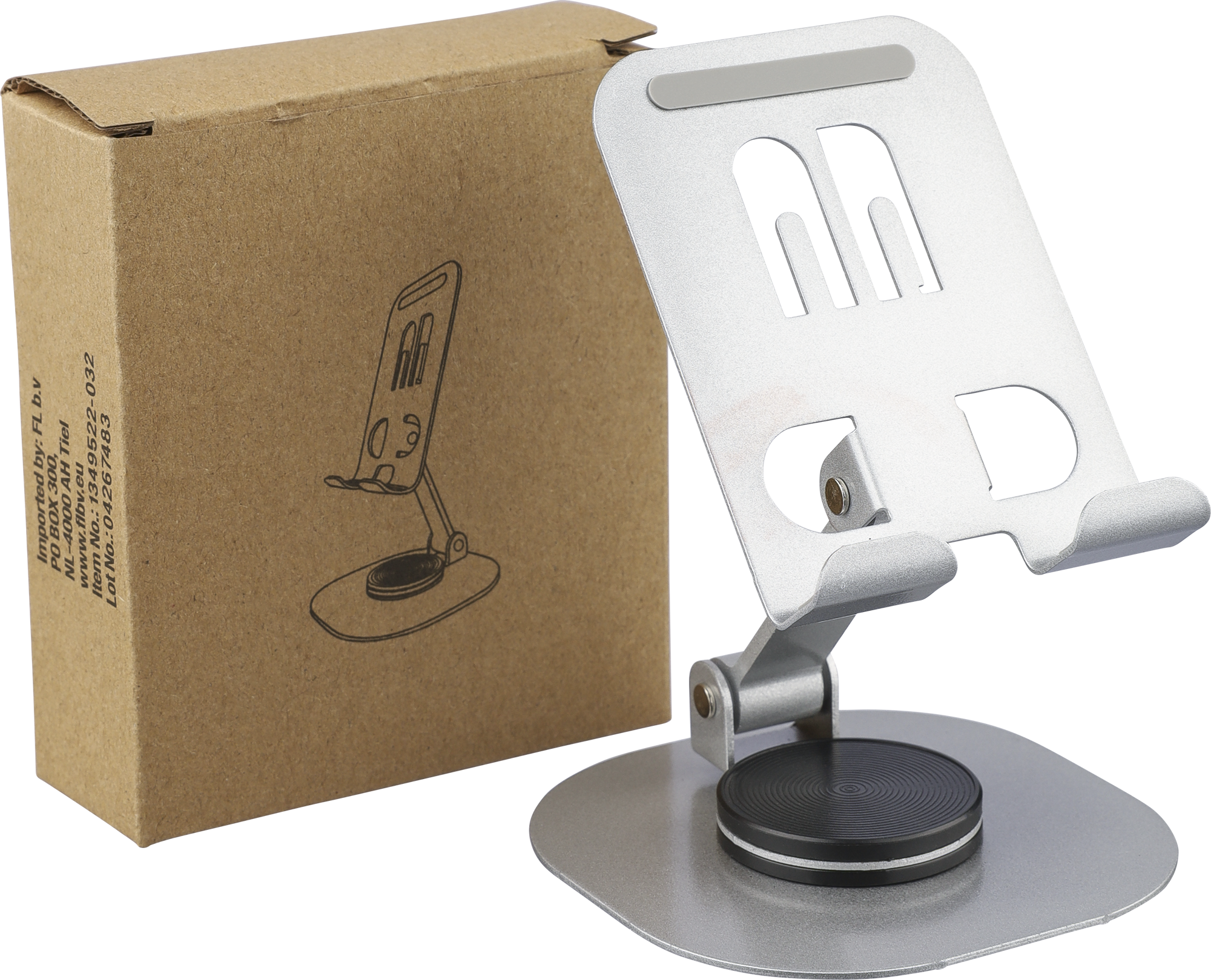 Phone stand with 360-degree rotation function. Can be fully folded flat for easy storage. Sturdy and weighty design for stable support. Individually packaged in a white box.