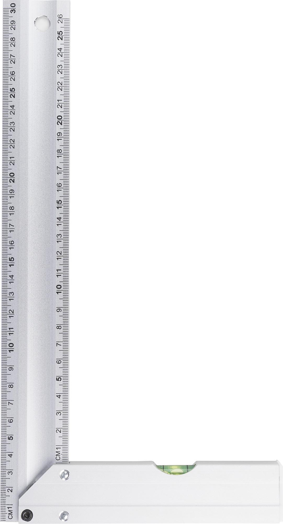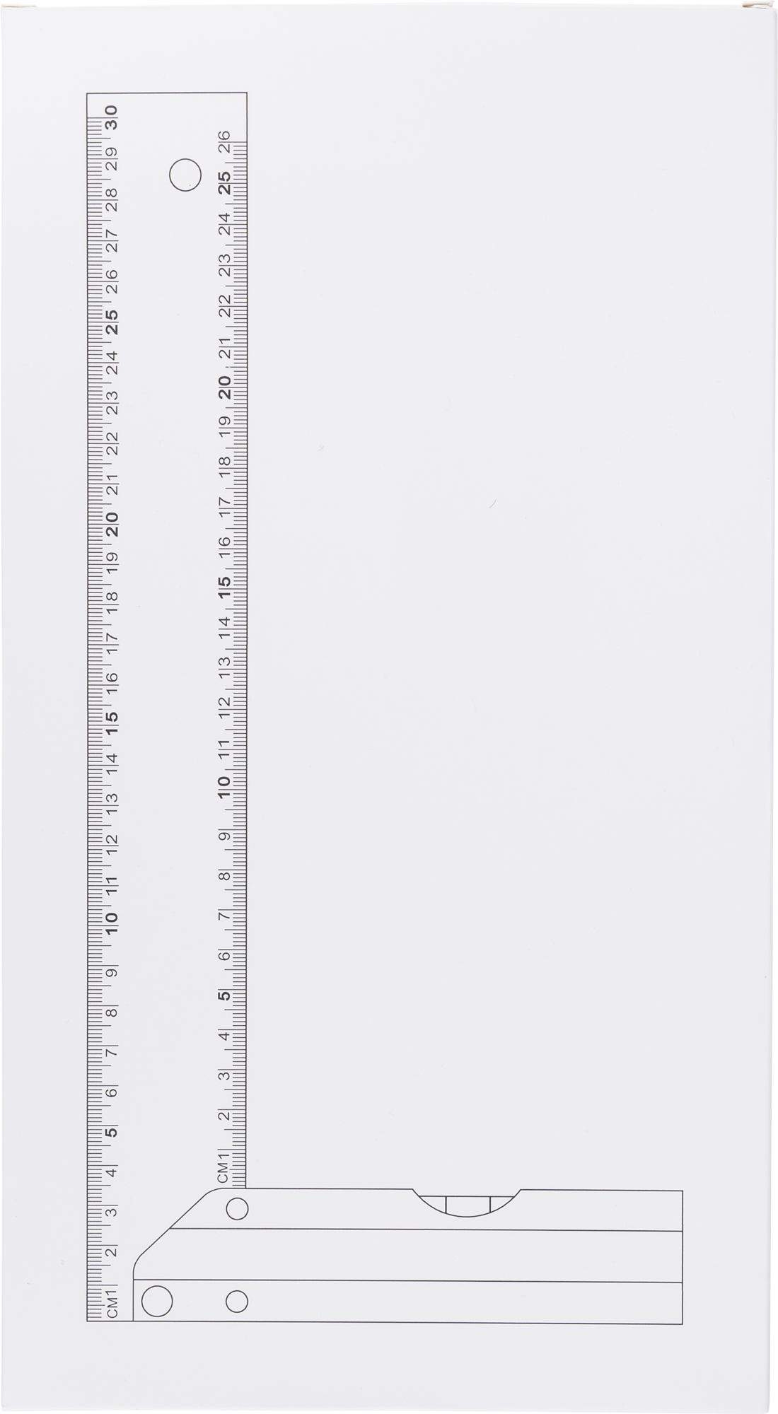 Aluminium set square with integrated spirit level. A practical design for precise measuring and levelling. Packed individually in a brown box with illustration.