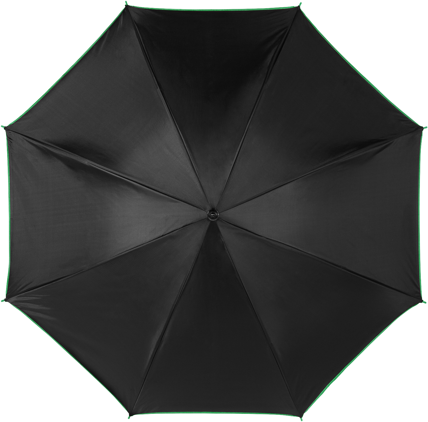 Automatic polyester umbrella (190T) with eight panels a black metal frame and curved plastic handle with Velcro closing.
