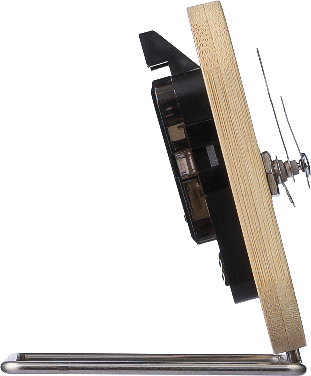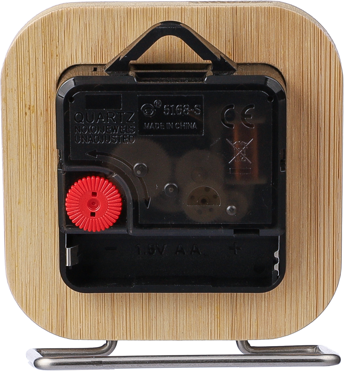 Bamboo clock with metal stand. Battery included. Individually packaged in a brown cardboard box.