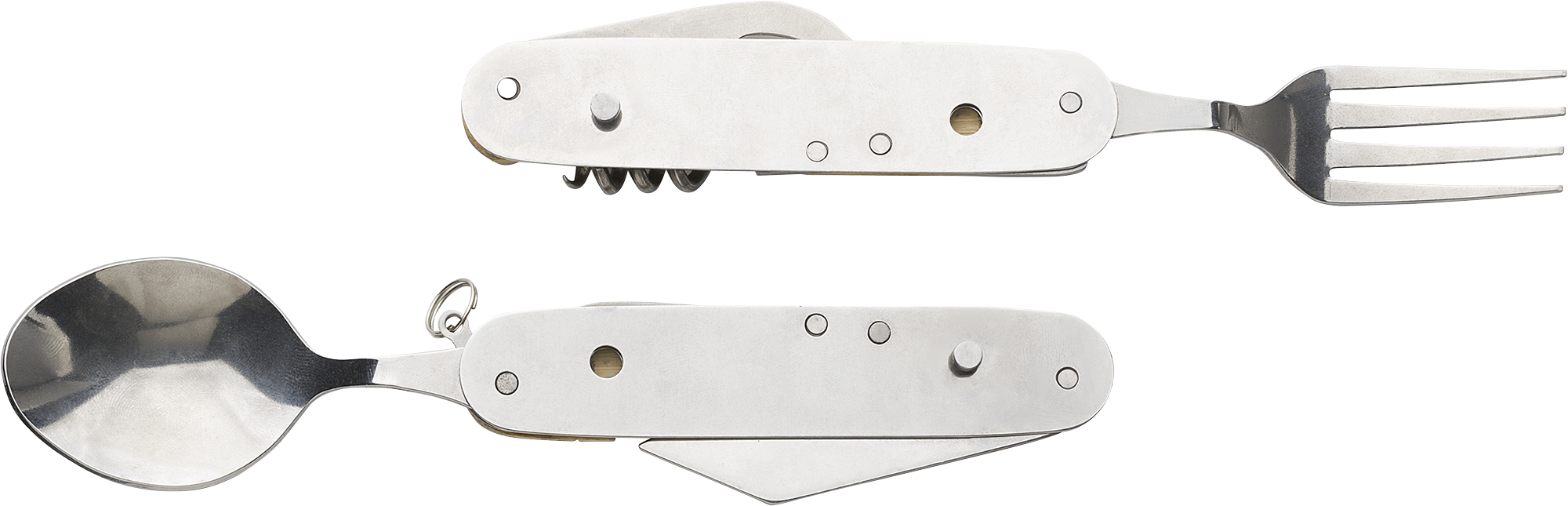 Bamboo multi-functional cutlery set (spoon, fork, knife, bottle opener, small knife). Cutlery can be separated to be used in both hands. Comes individually packaged in a brown cardboard box.