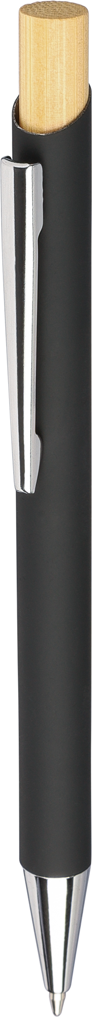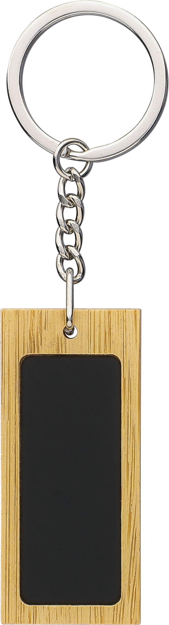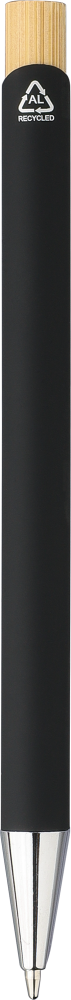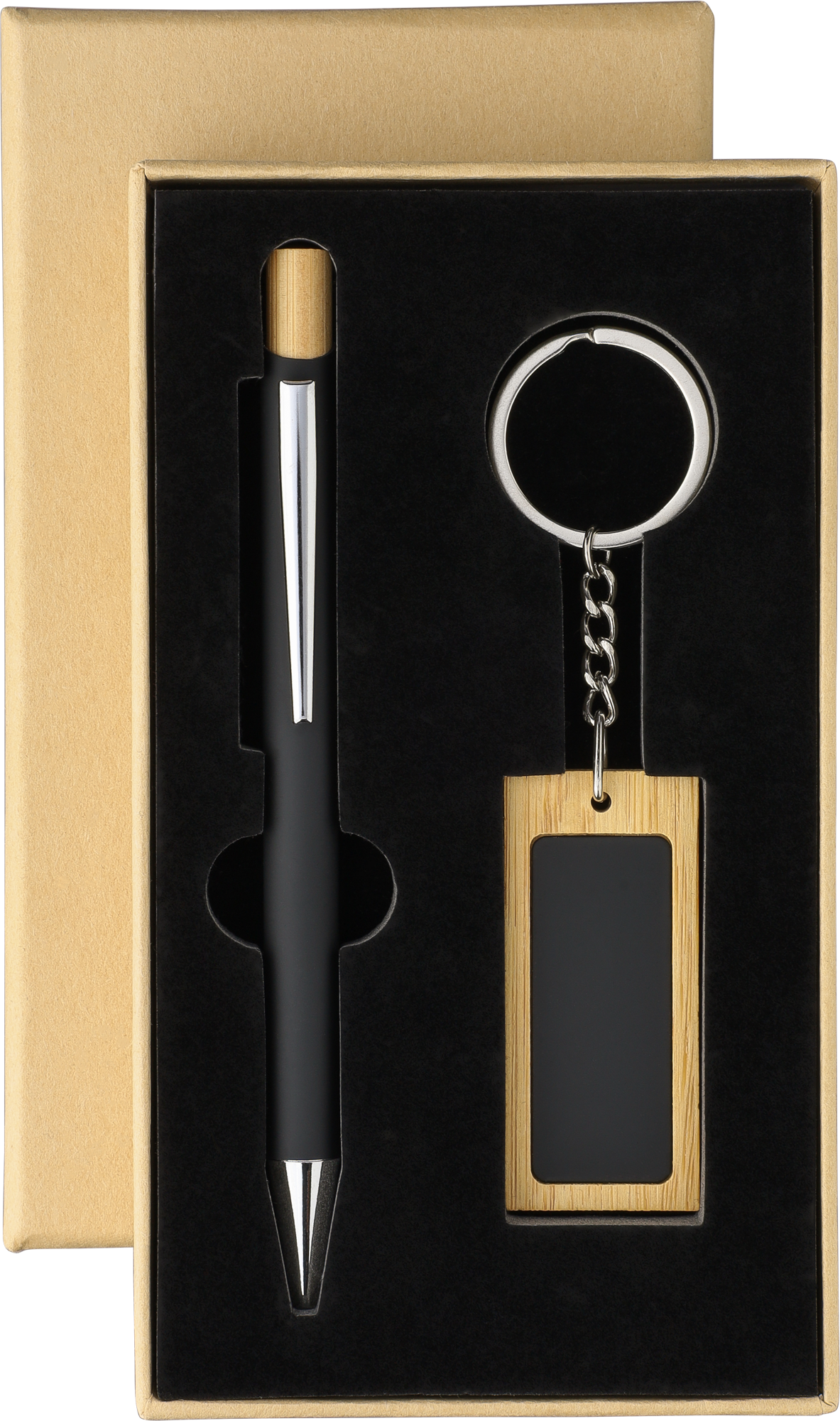 Bamboo writing set consisting of a bamboo and rubberized recycled aluminium ballpen and a bamboo and rubberized stainless steel rectangular keyring. Both items feature a mirror effect after laser engraving and include a recycled aluminium logo. Packed in a kraft paper box with velvet inlay.