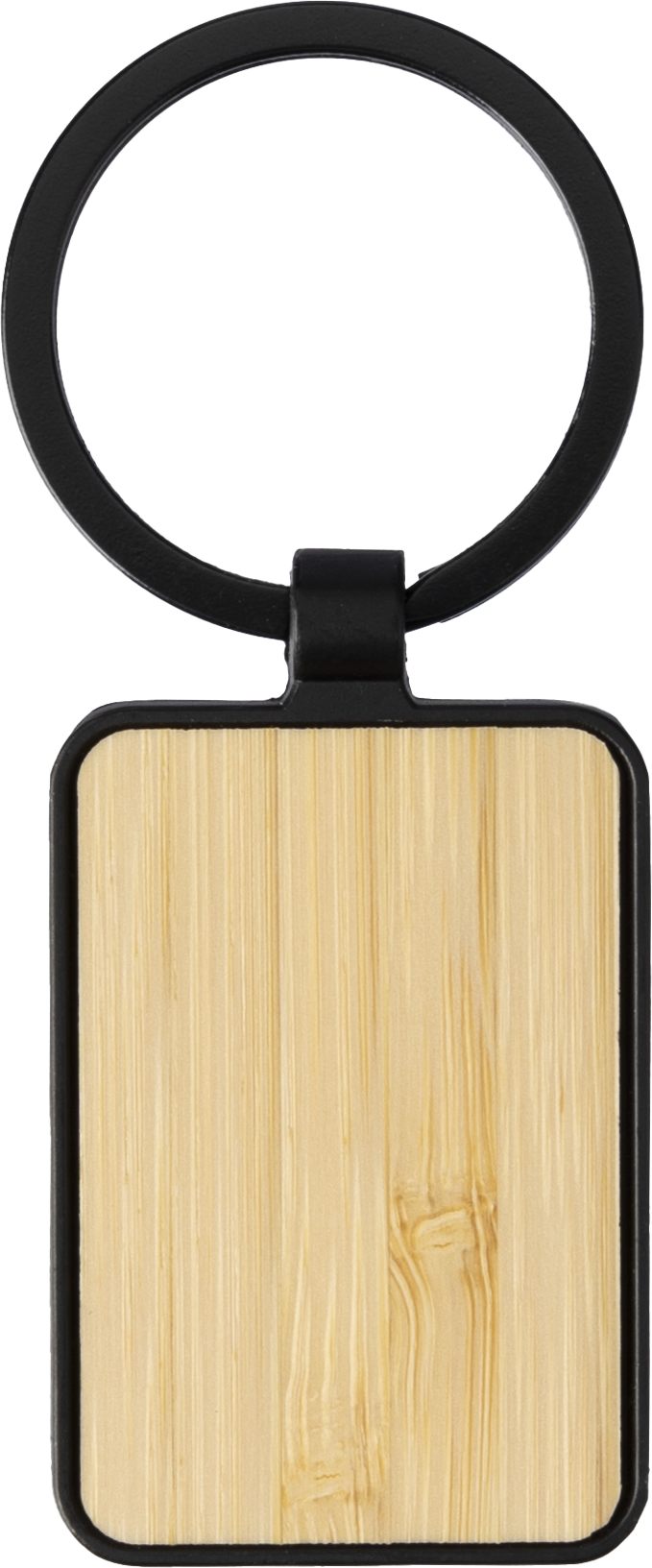 Oblong shaped bamboo and metal keyring.. Individually packaged in a brown kraft sleeve.
