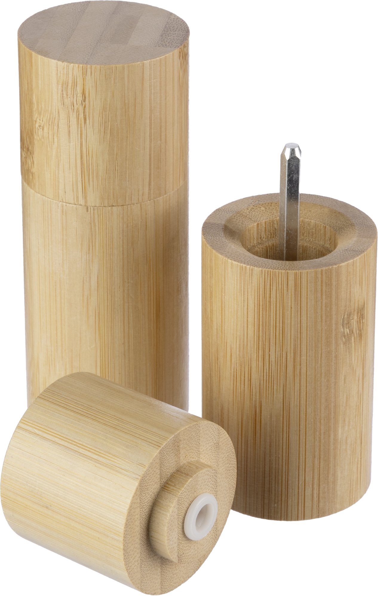 Bamboo spice mill set of two with ceramic grinder. Individually packaged in a kraft paper box.
