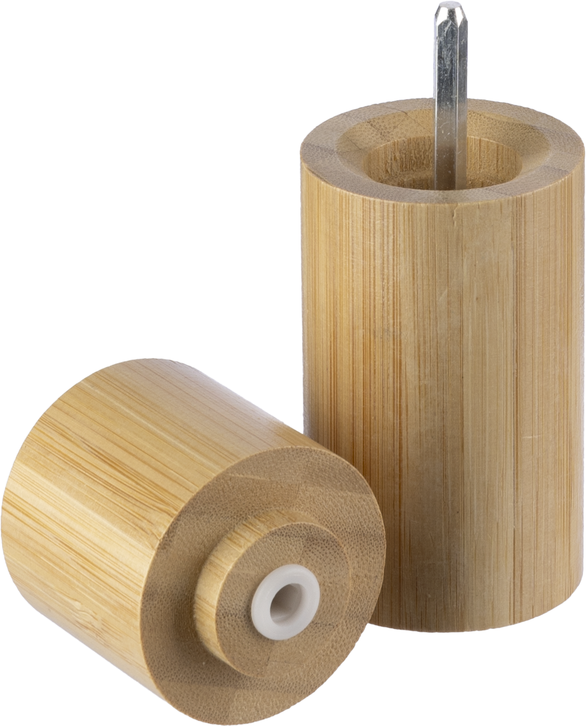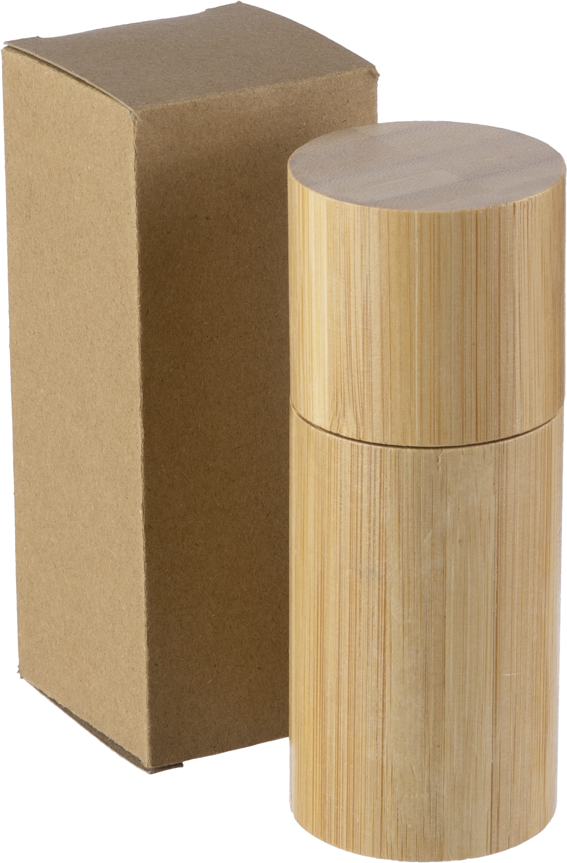 Bamboo spice mill with ceramic grinder. Individually packaged in a kraft paper box.