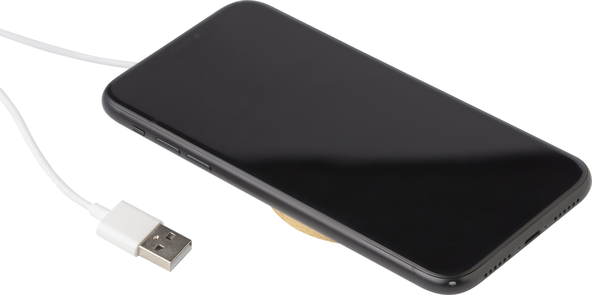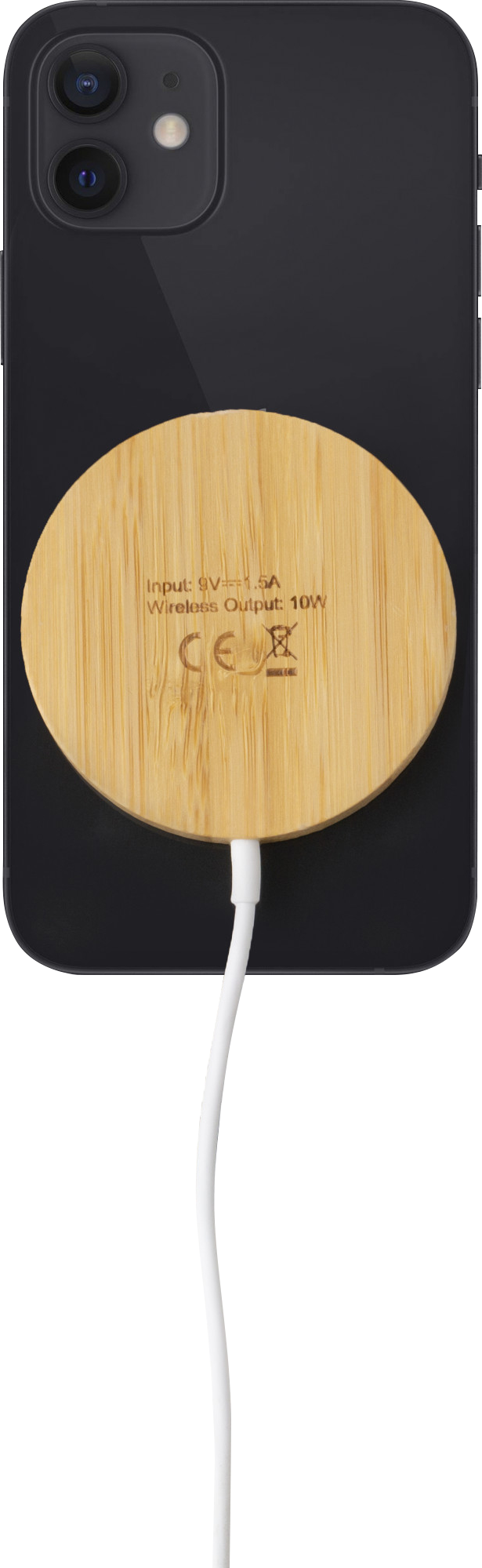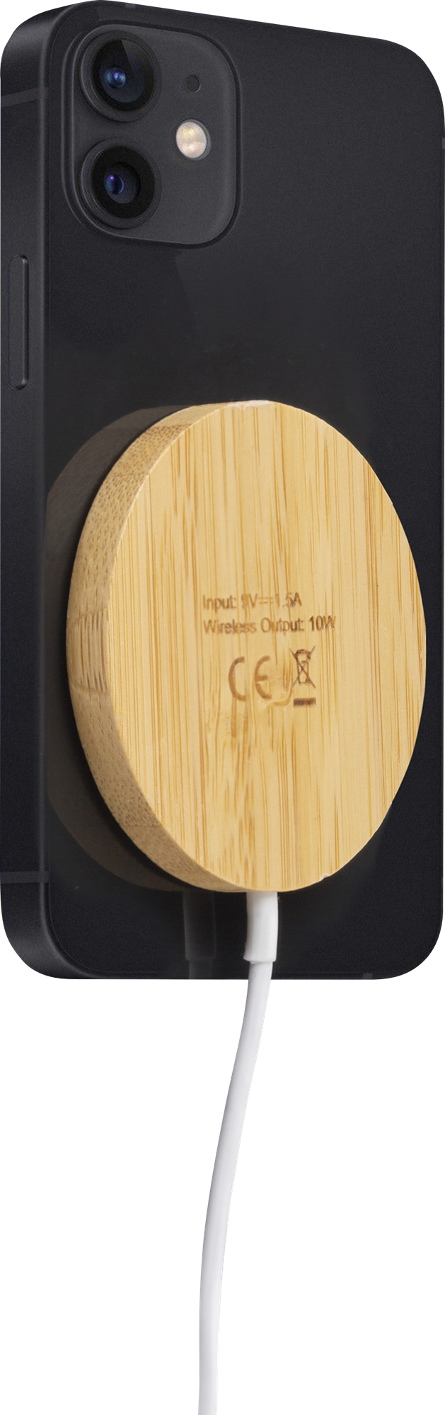 Bamboo and TPE wireless charger. Input 9V=1.5A. Wireless output 10 Watt. Including cable. Individually packaged in a kraft paper box.