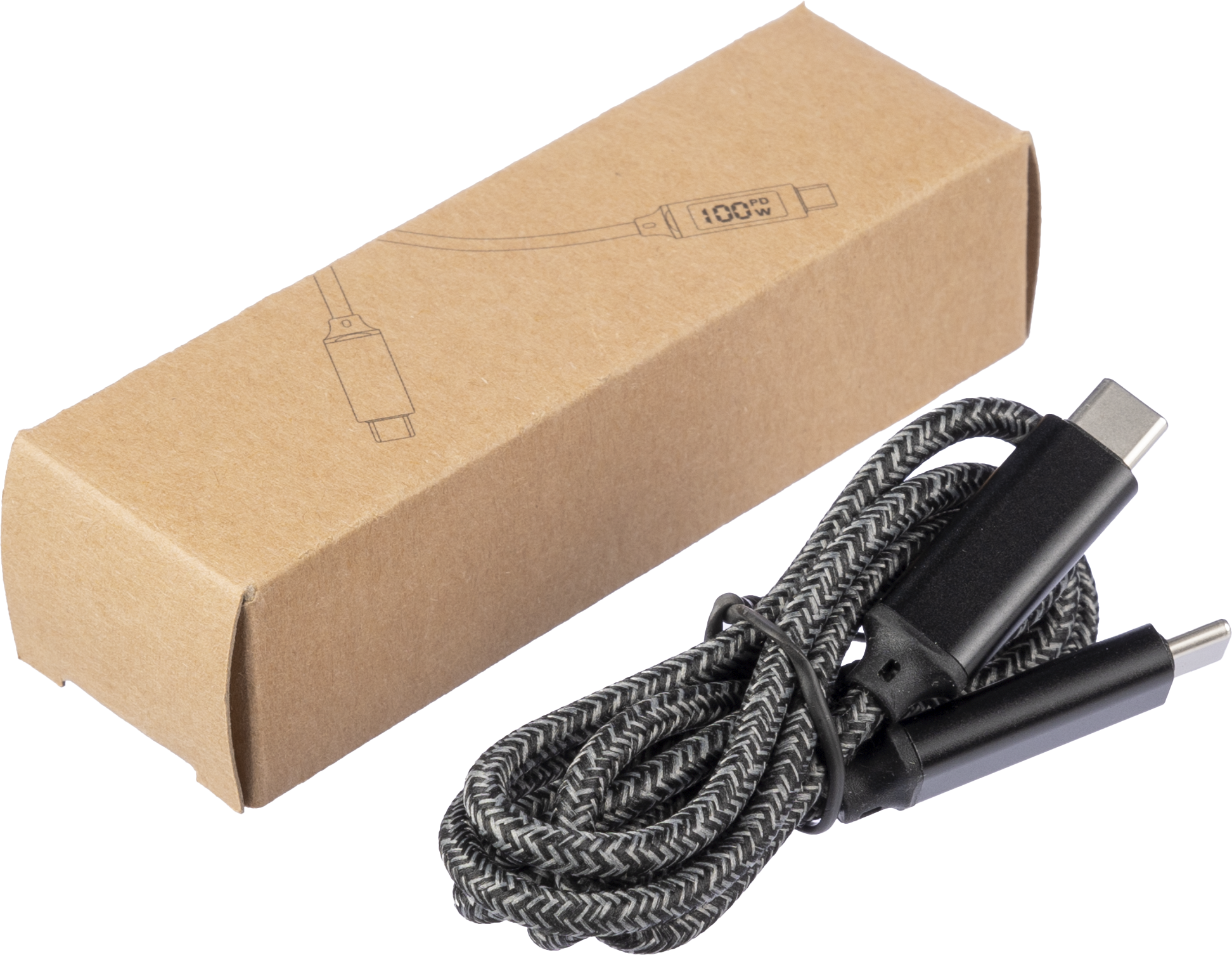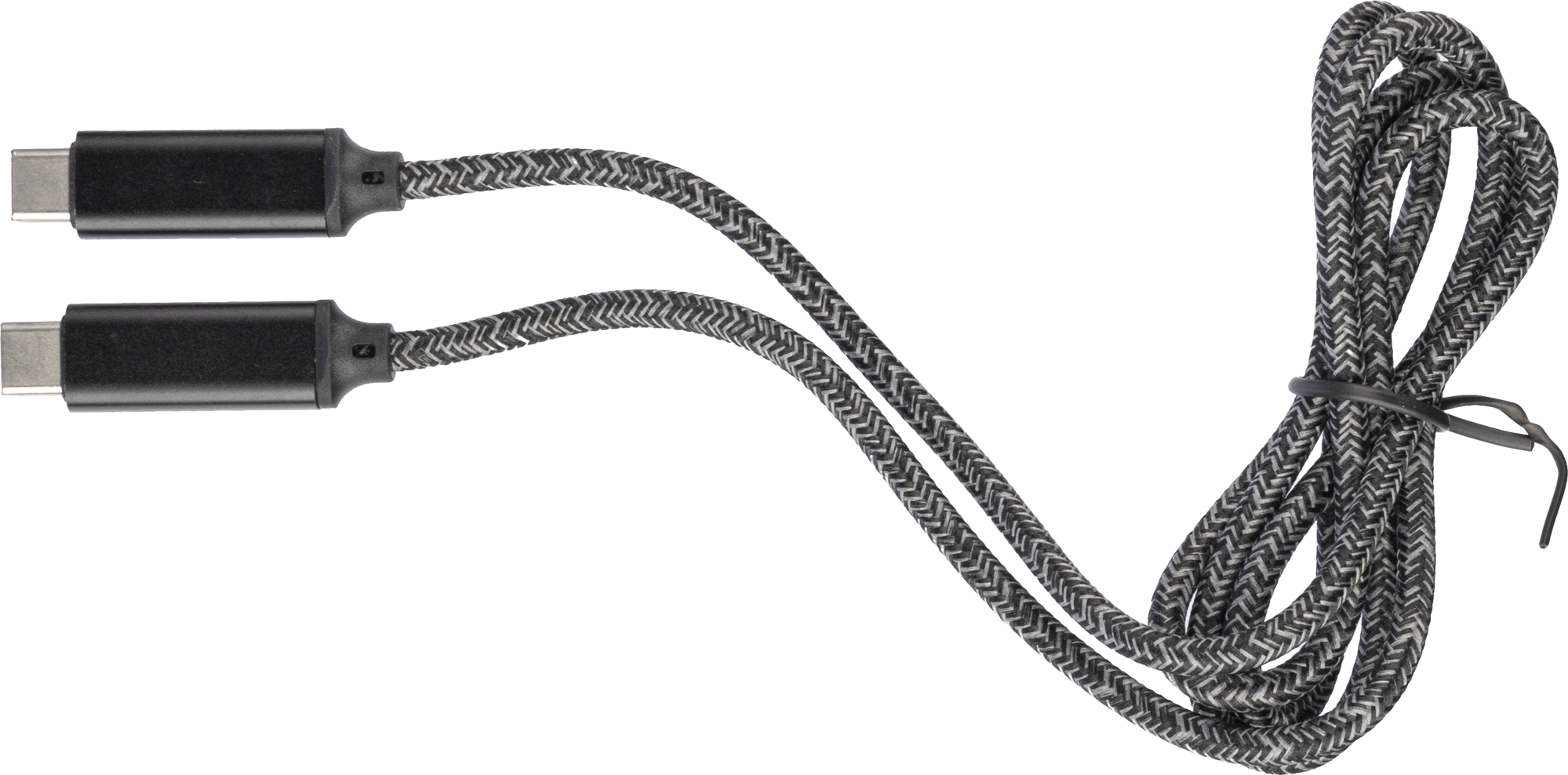 Nylon fabric charging cable with aluminium sockets. Length: 1 meter. USB-C to USB-C. Capacity: 65 W. Blue charging speed indication light on one socket. Data transfer speed 480Mbps.