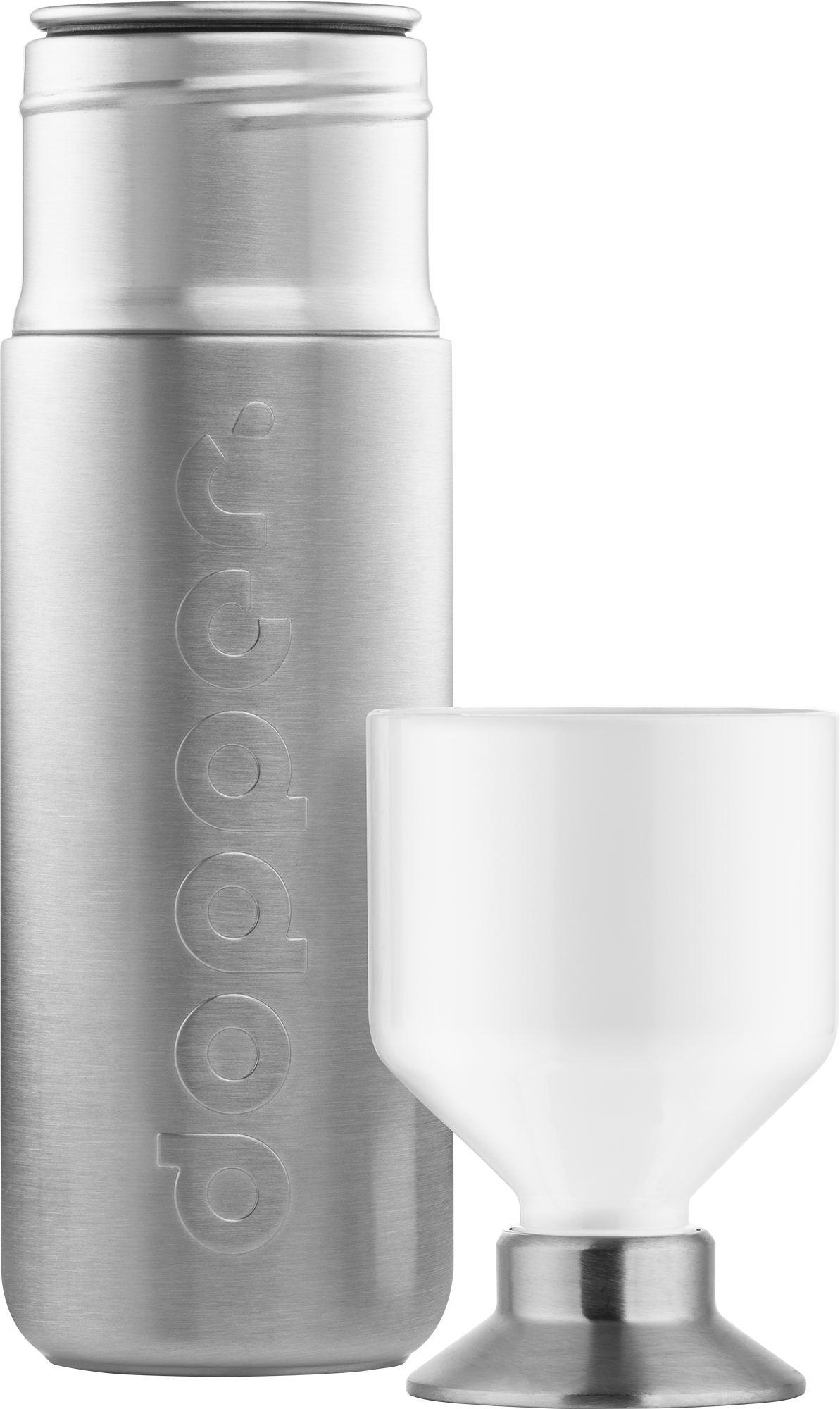 Stand strong for crystal clear waters with the Dopper Steel 1.1L. This knight in shining armour is cool and robust and fits perfectly into a sports bag. A must-have for those of you who love sports and the outdoors! This insulated bottle will keep your water, tea or coffee hot for 9 hours or cold for 24. The Dopper Steel holds 1.1L.