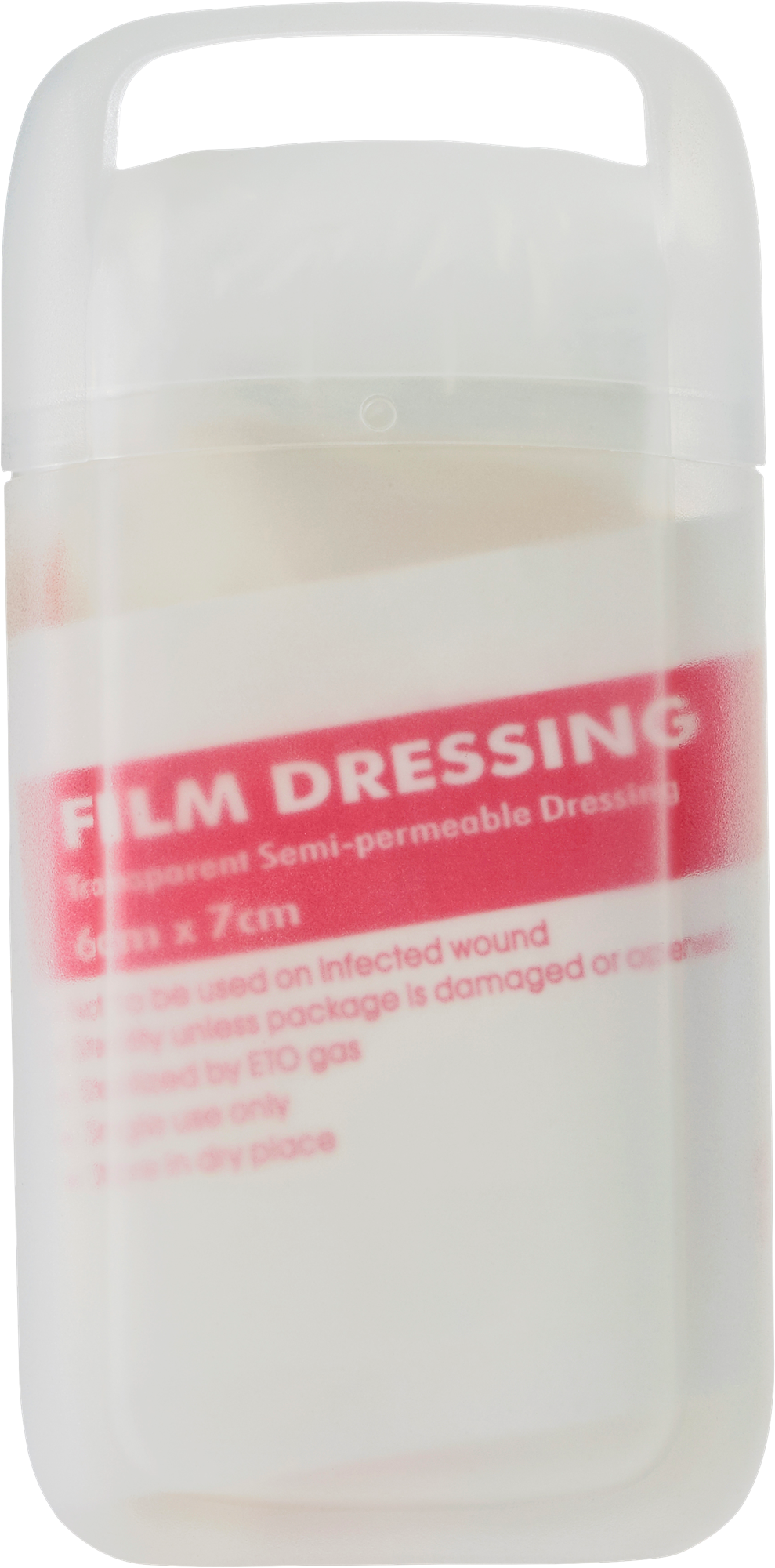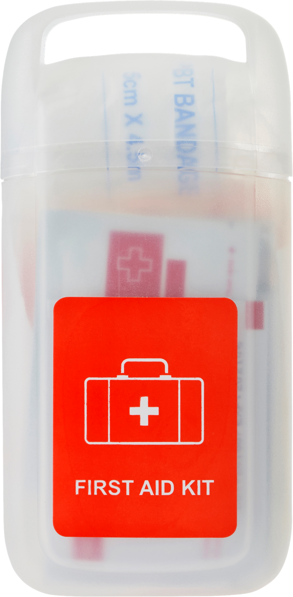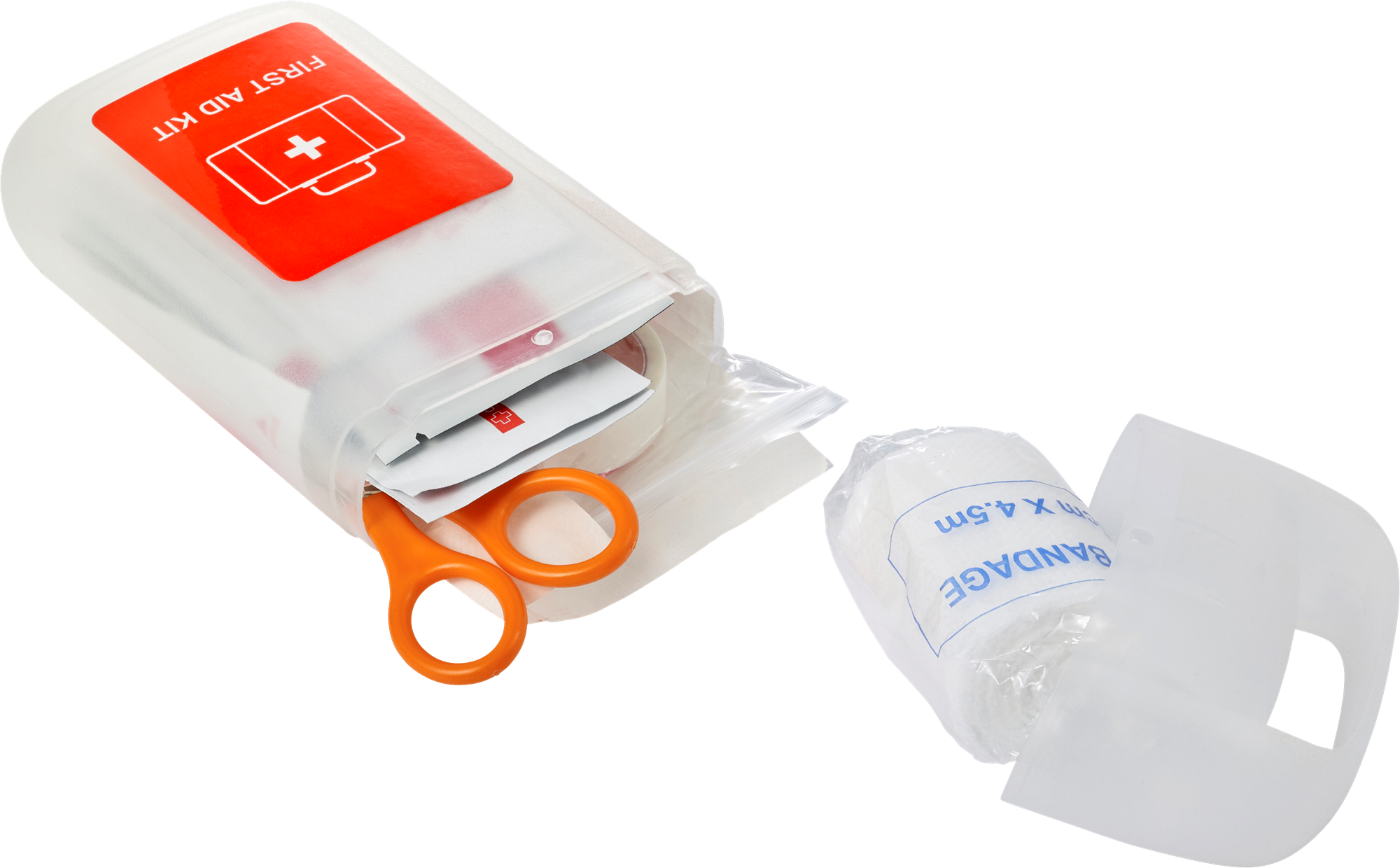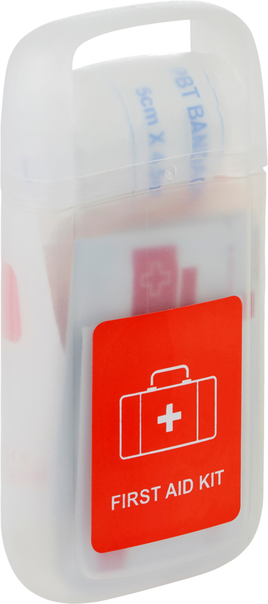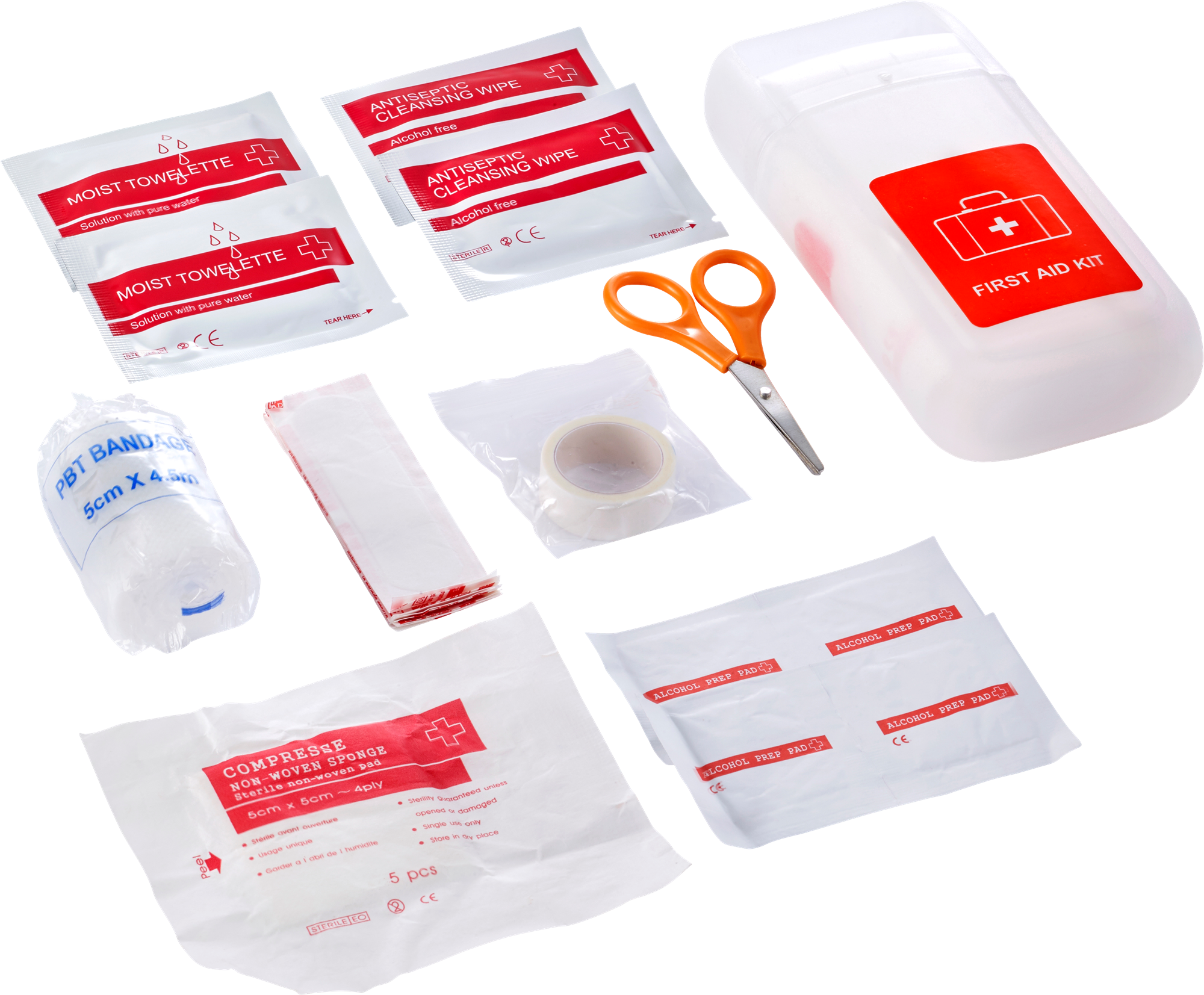First aid kit in a PP plastic transparent container. The kit includes: 1x film dressing, 1x nonwoven sponge, 5x sterile bandages, 1x PBT bandage, 4x alcohol prep pads, 2x moist towelettes, 1x anti-septic wipe, 1x tape and 1x pair of scissors.
