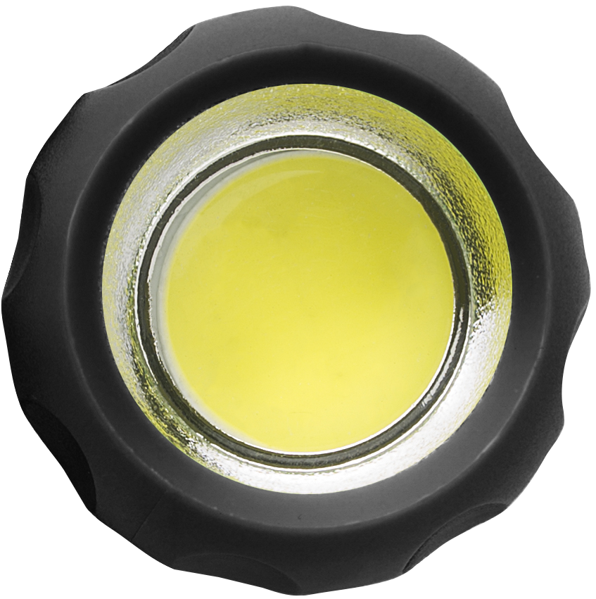 Plastic COB flashlight with wrist strap.