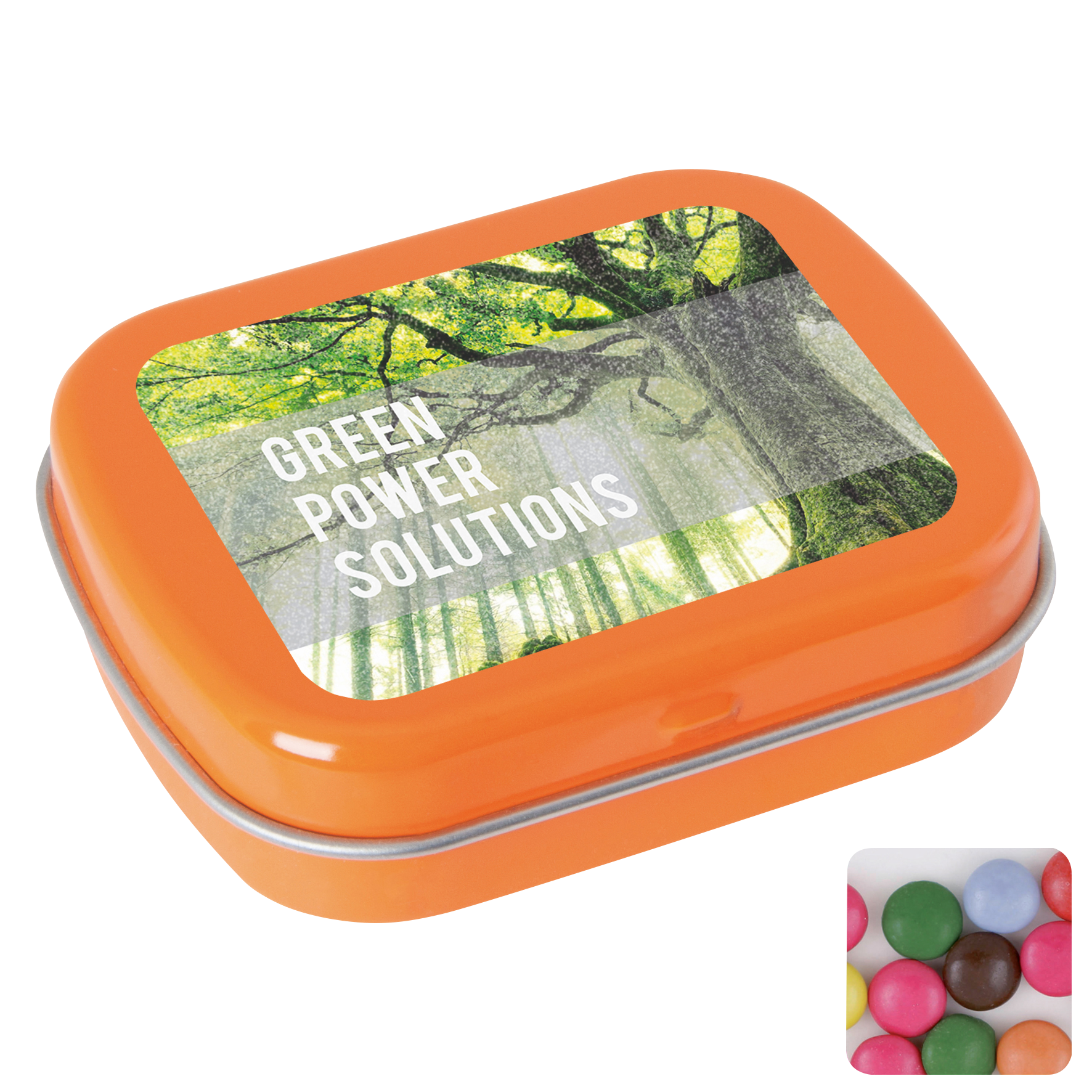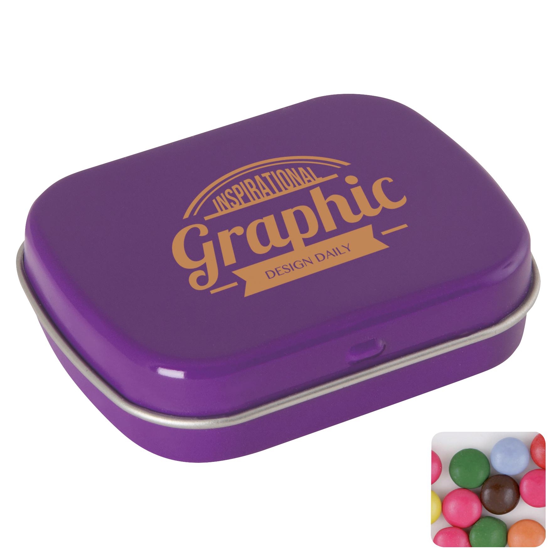 Flat hinged tin with milk choco's. Supplied with a mix of chocolate colours.