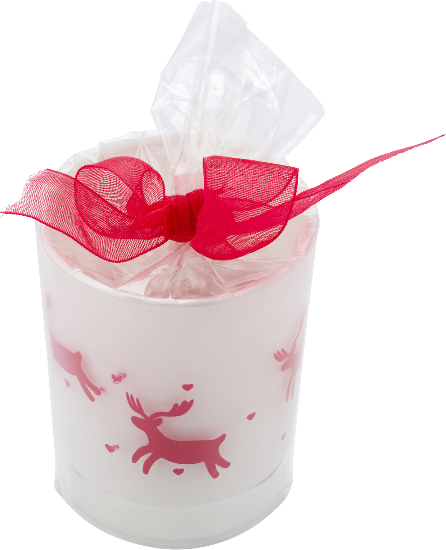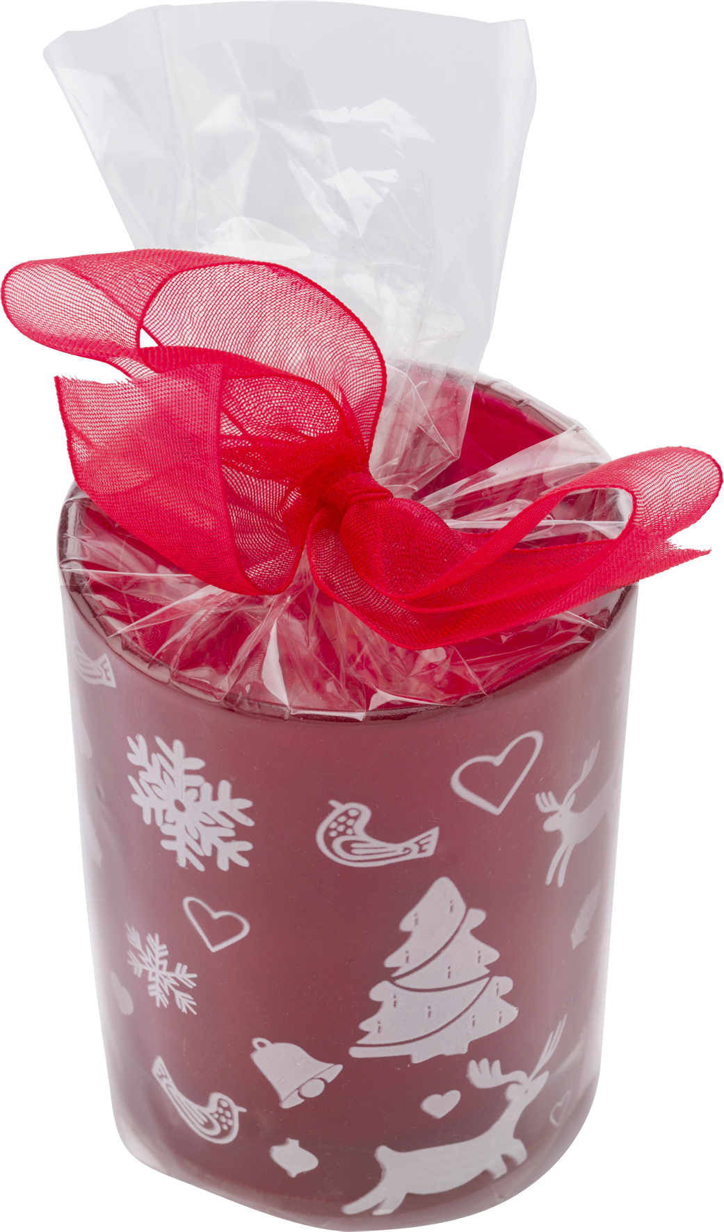 Decorated glass candle holder with tea light, wrapped in transparent foil with a red ribbon closing.