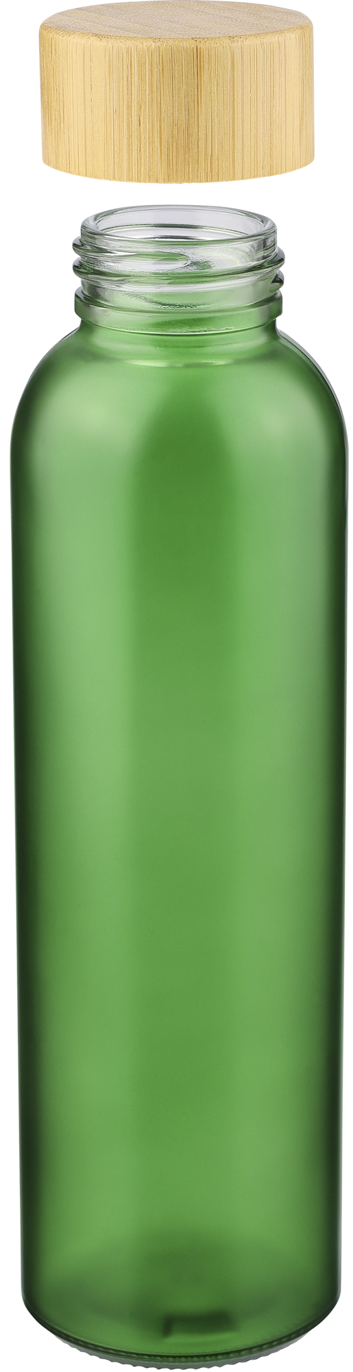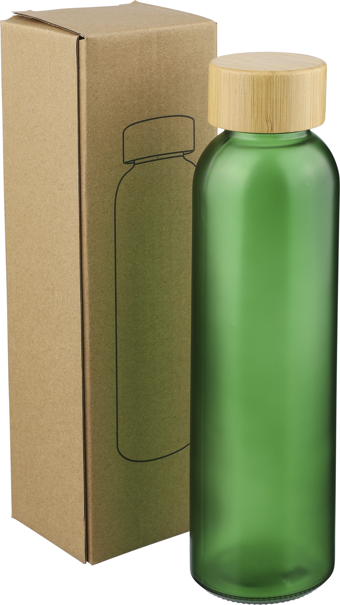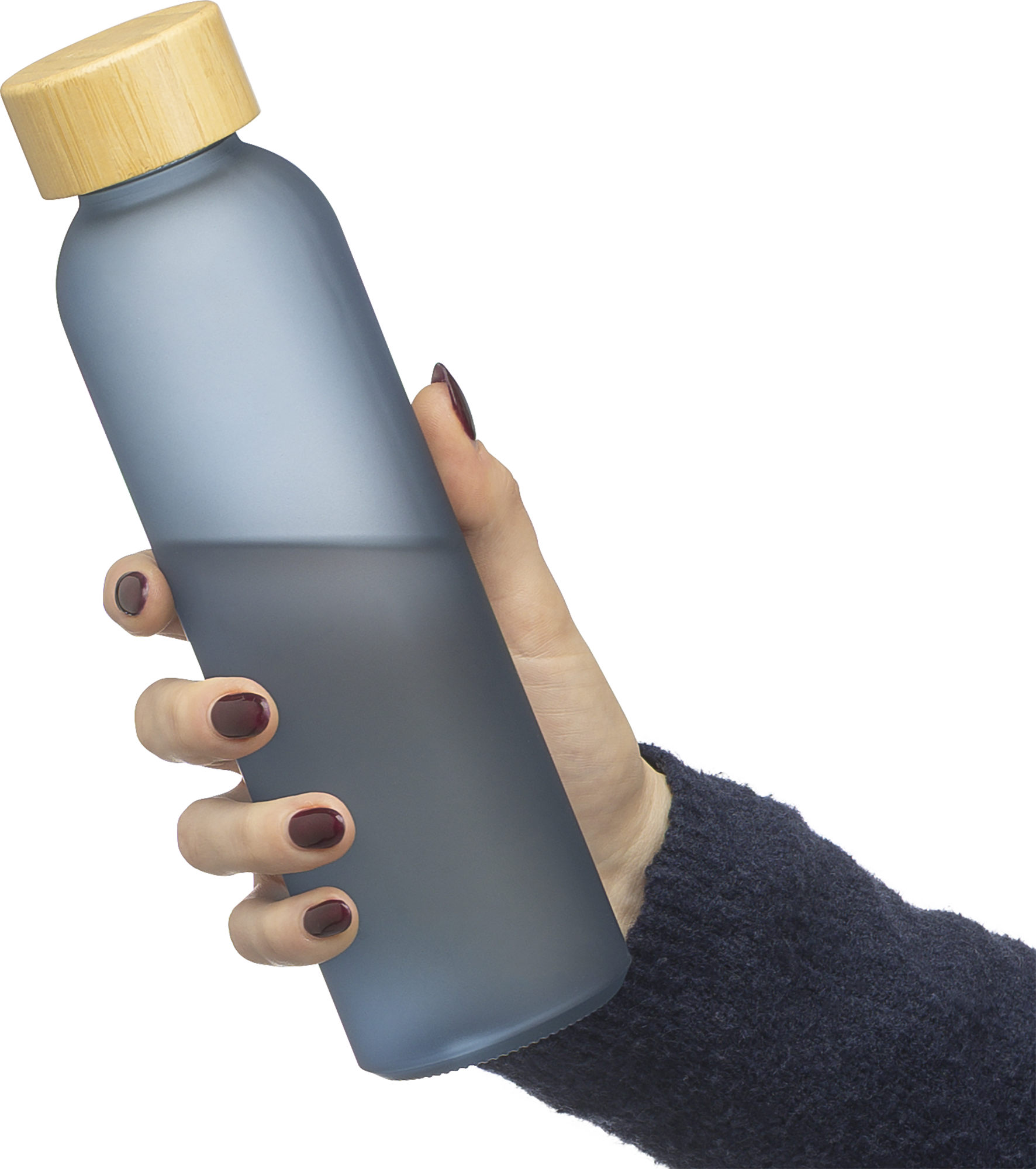 Glass drinking bottle (500ml) with a frosted coated body and bamboo screw lid. Made from sodium calcium glass, suitable for cold drinks only. Individually packaged in a brown cardboard box.
