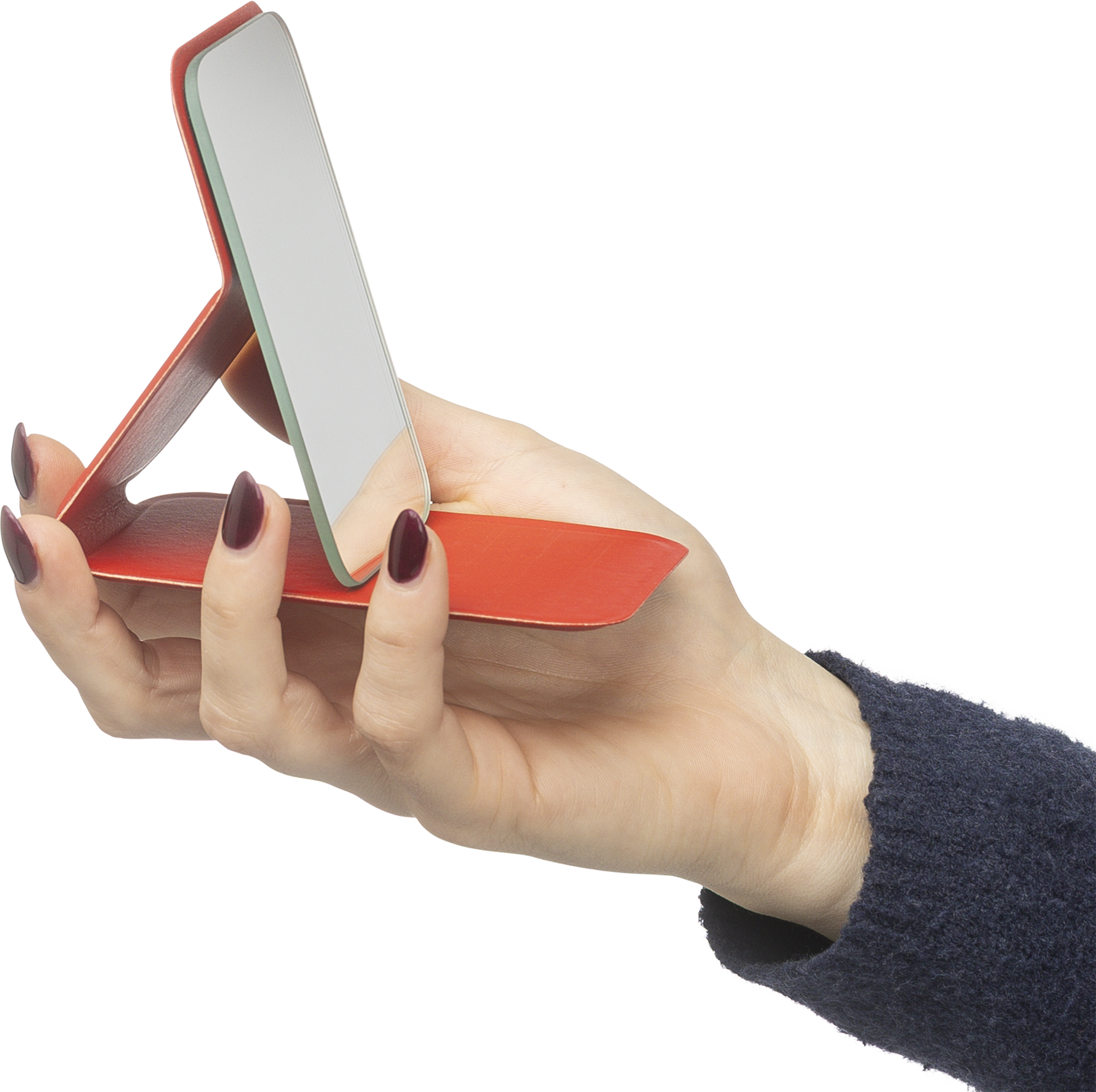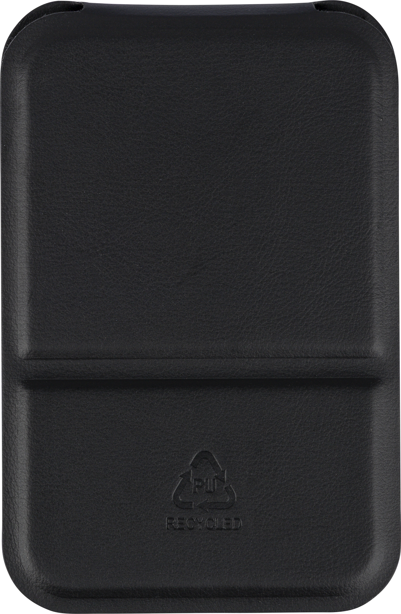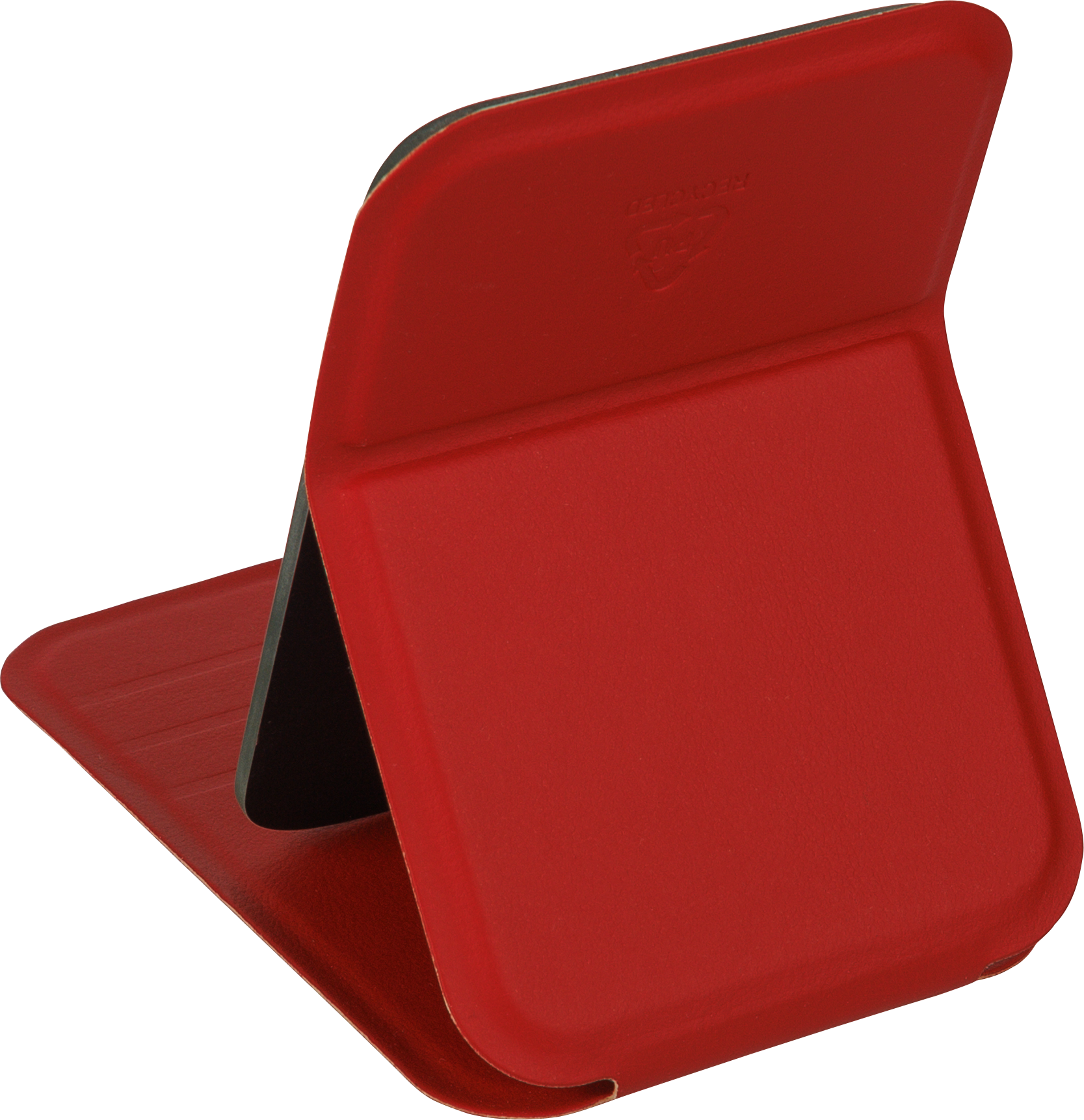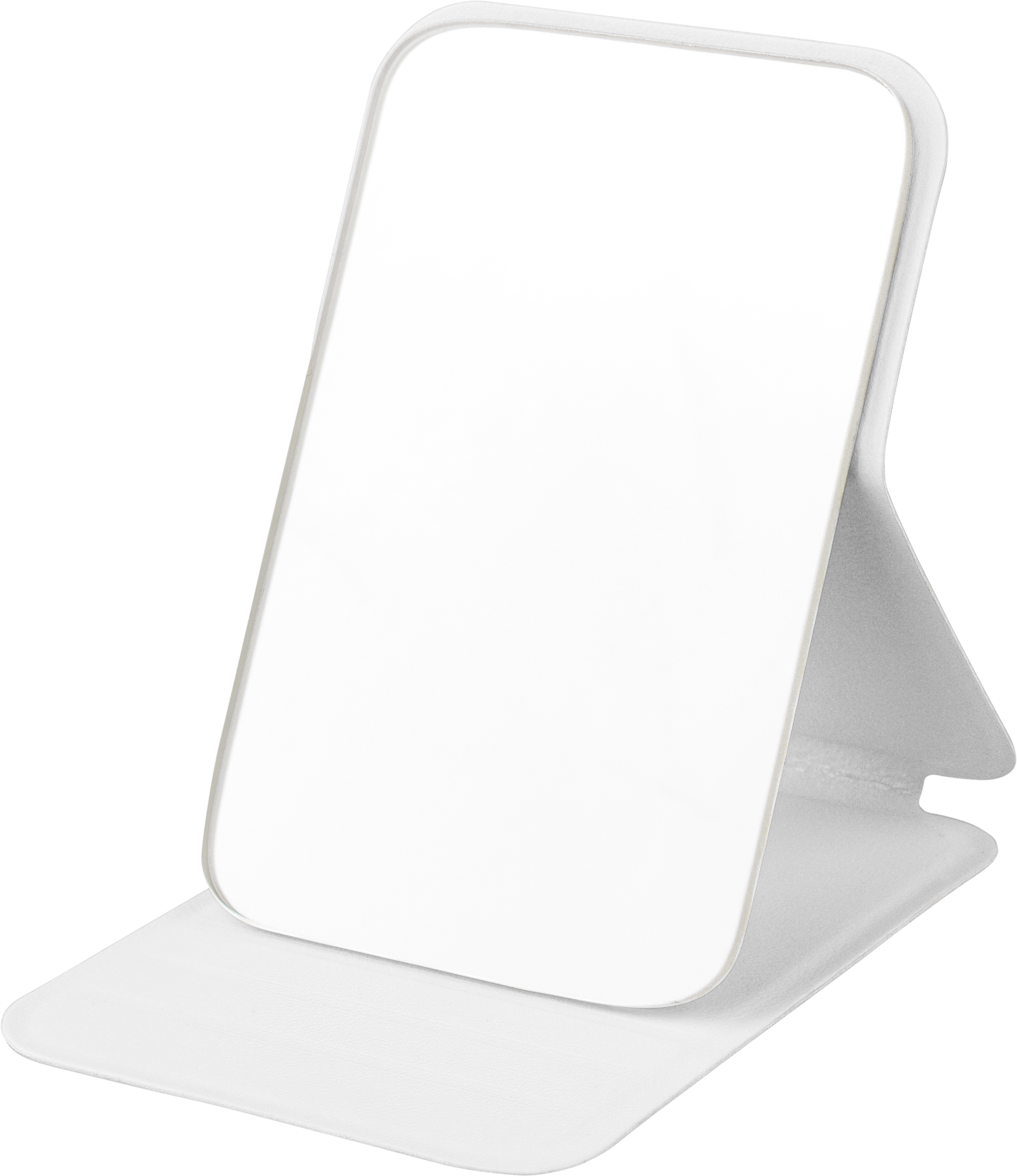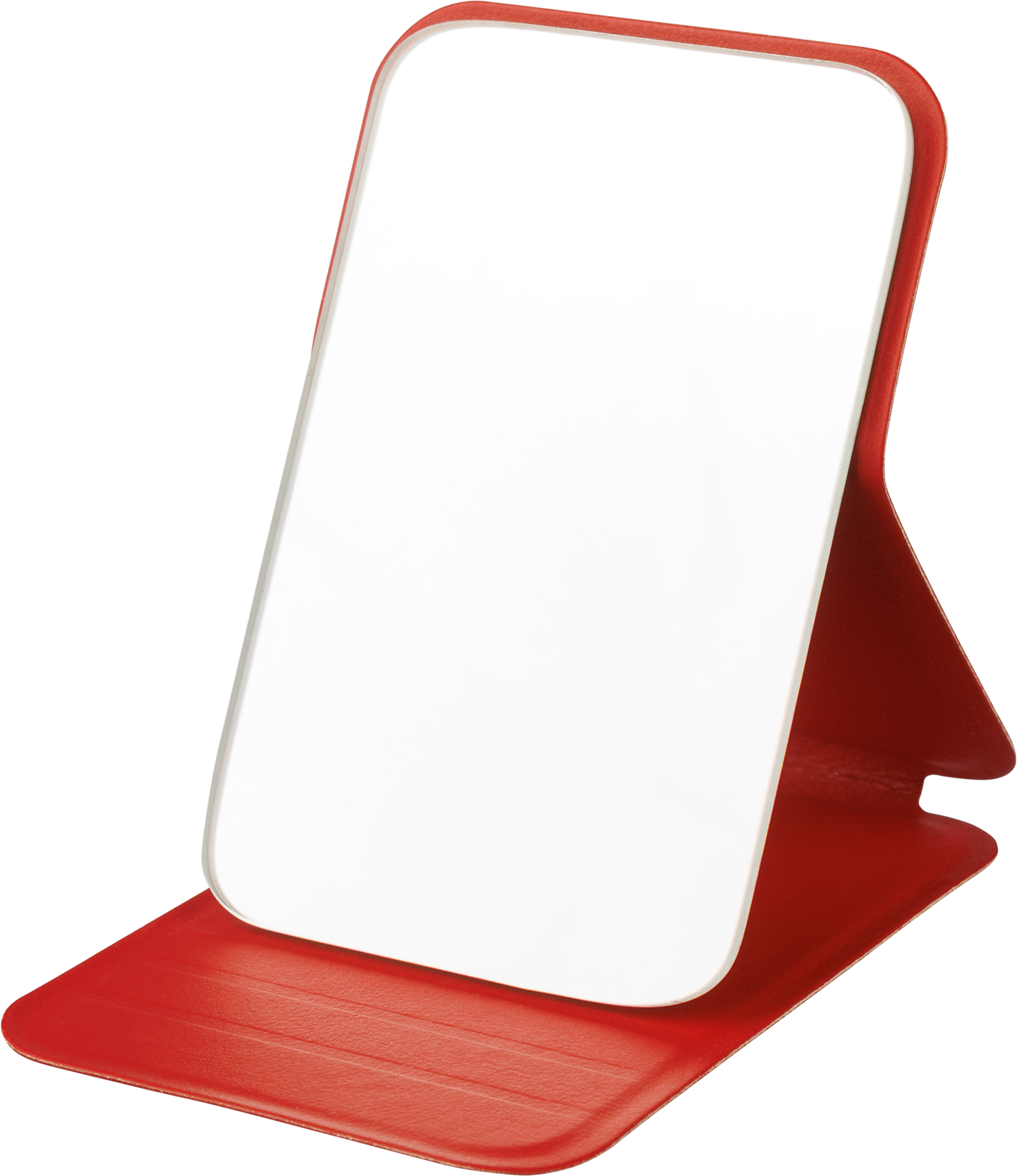 Glass mirror with folding recycled PU cover, designed to stand upright when opened. Includes an embossed recycled logo.