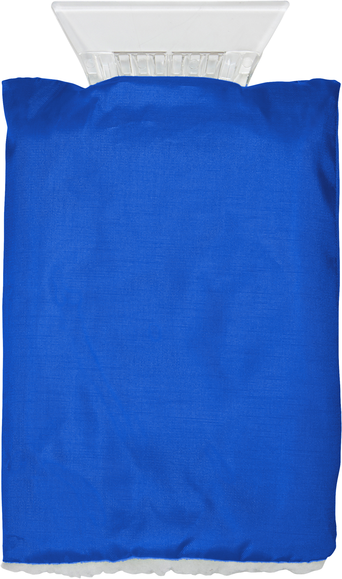 Plastic ice scraper in a nylon fleece glove.