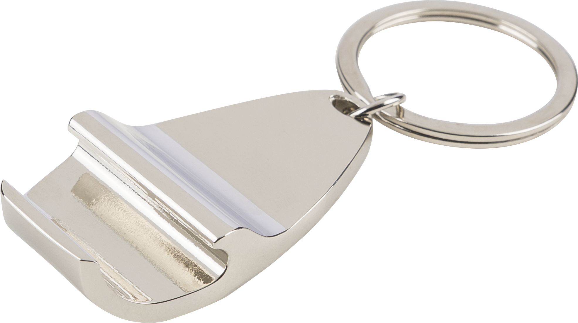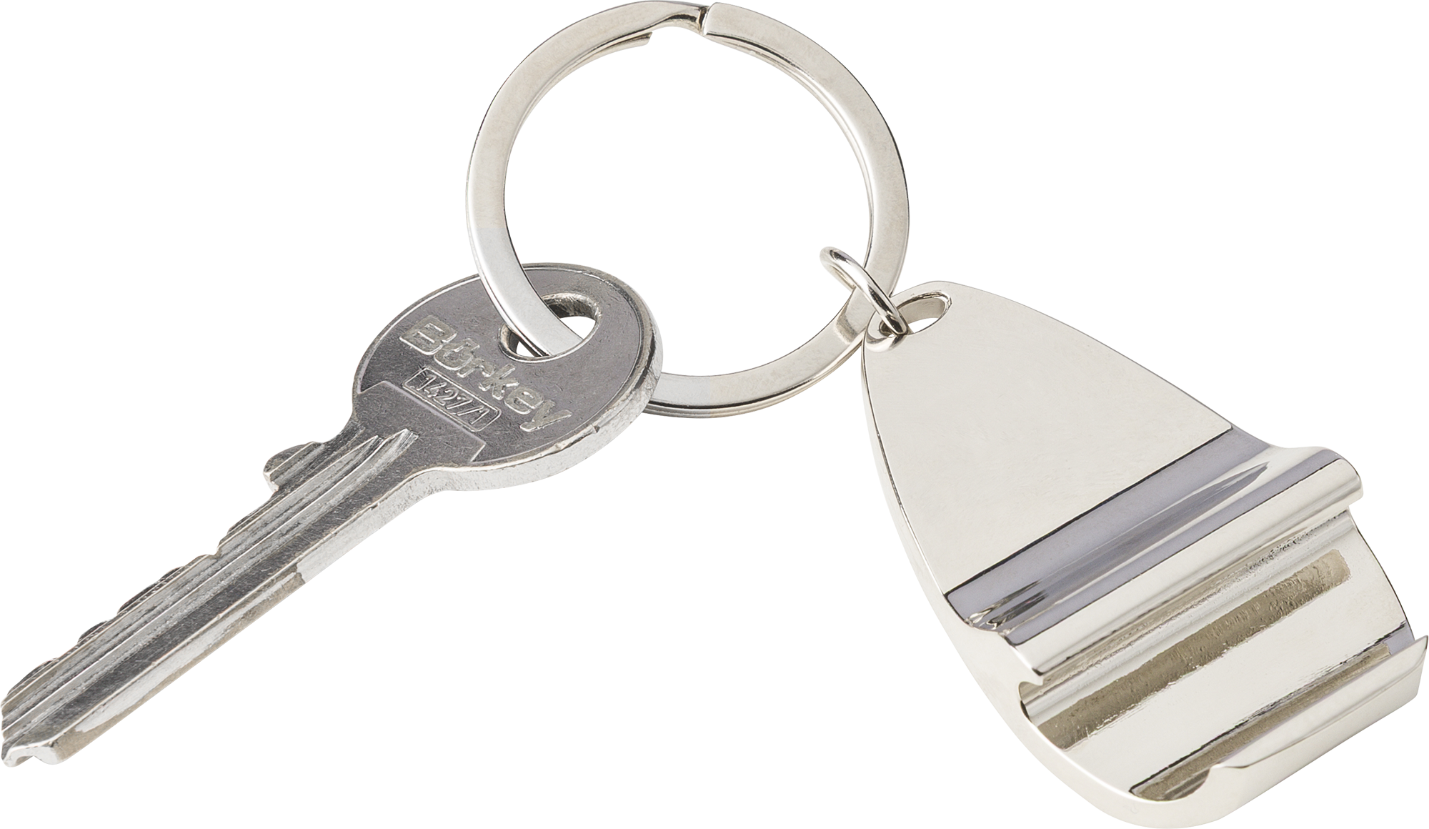Zinc alloy keychain with a bamboo inlay on the front and bottle opener function.