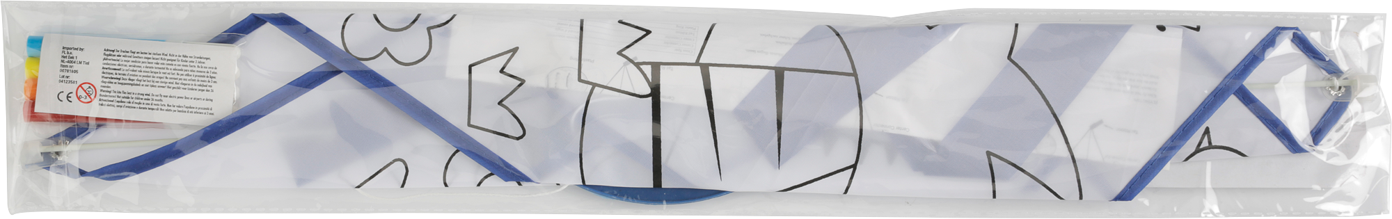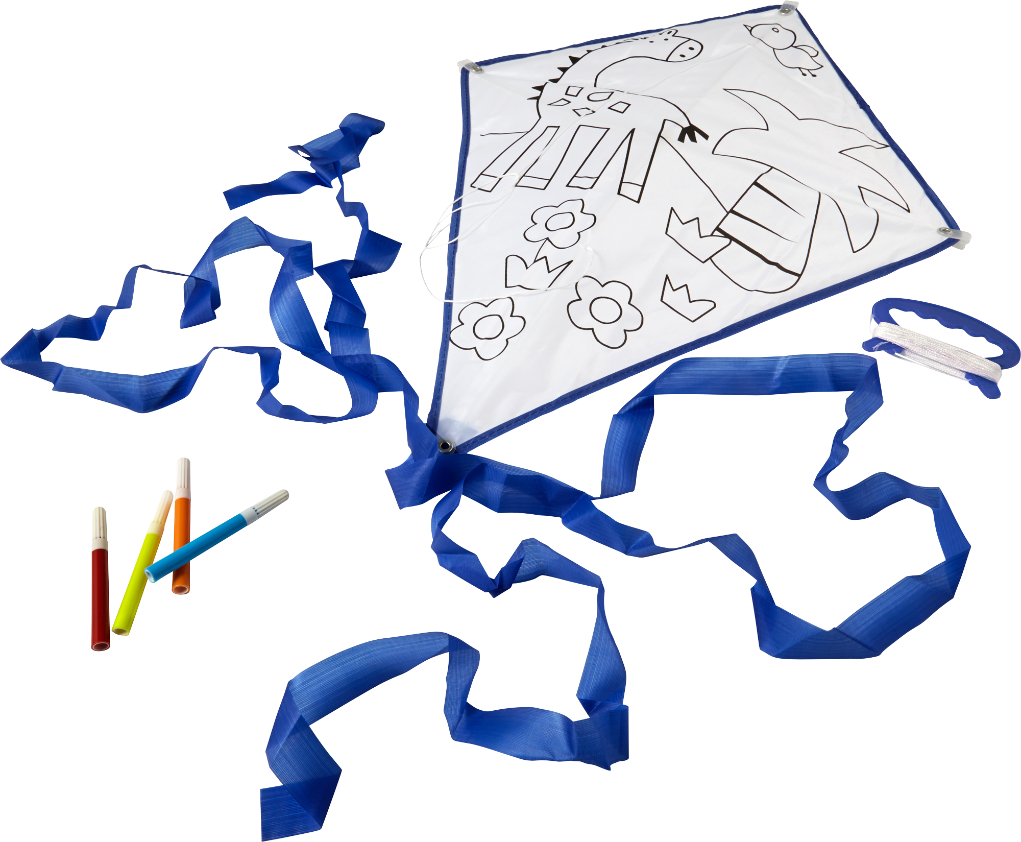 Polyester (190T) kite which can be coloured in, supplied with four felt tip pens, colours red, orange, yellow and light blue.