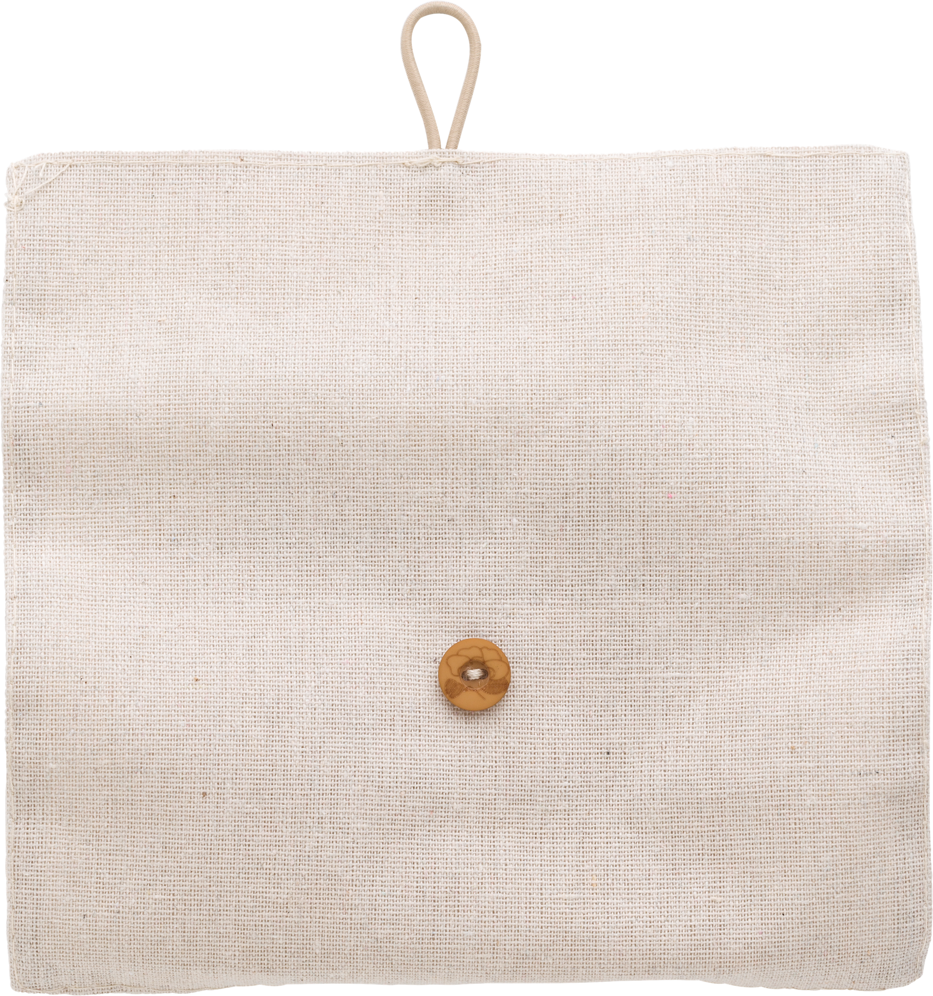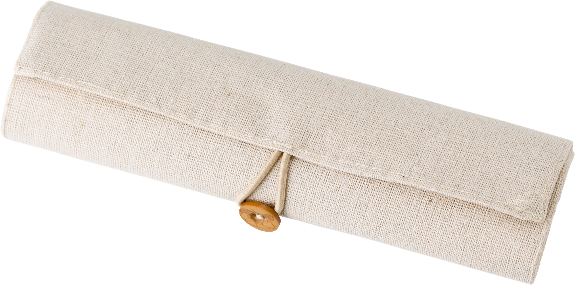 Linen and cotton sleeve with six colouring pencils, pencil sharpener and eraser. Colours of the pencils: royal blue, dark blue, green, yellow, orange and purple.