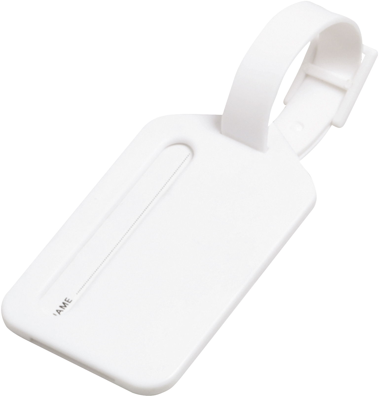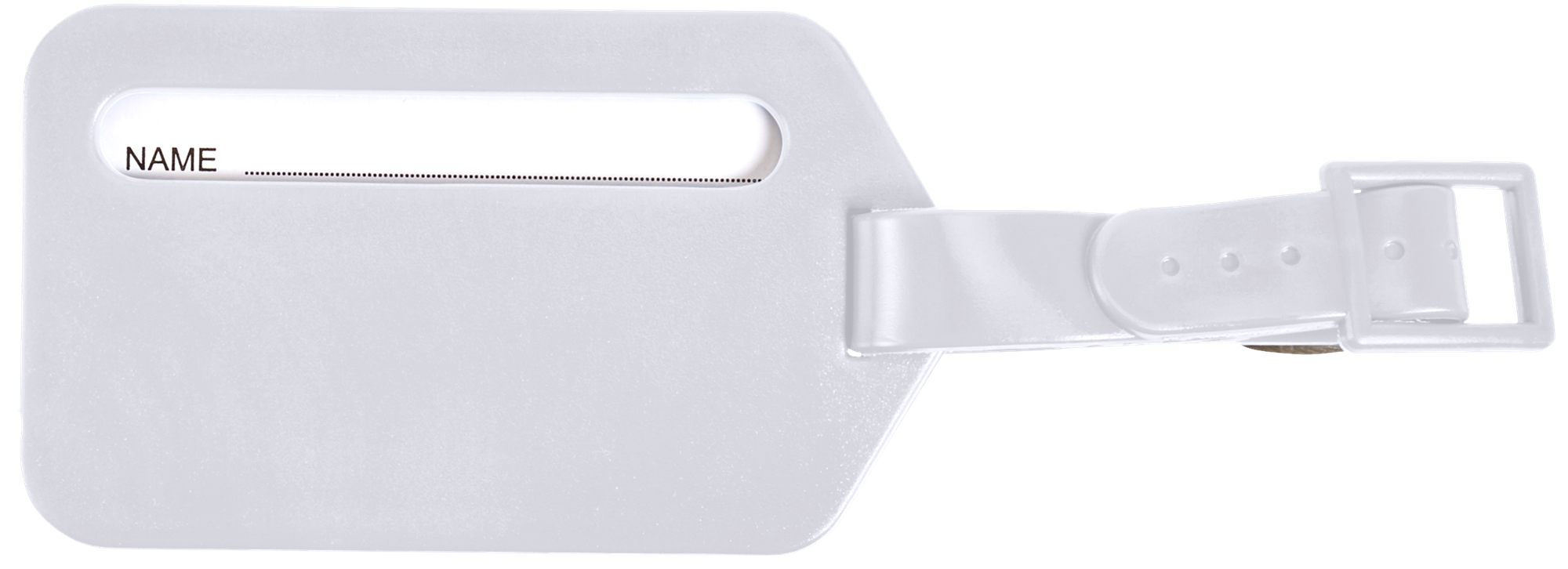 Plastic luggage tag with adjustable strap. Label: 4 x 7 cm.