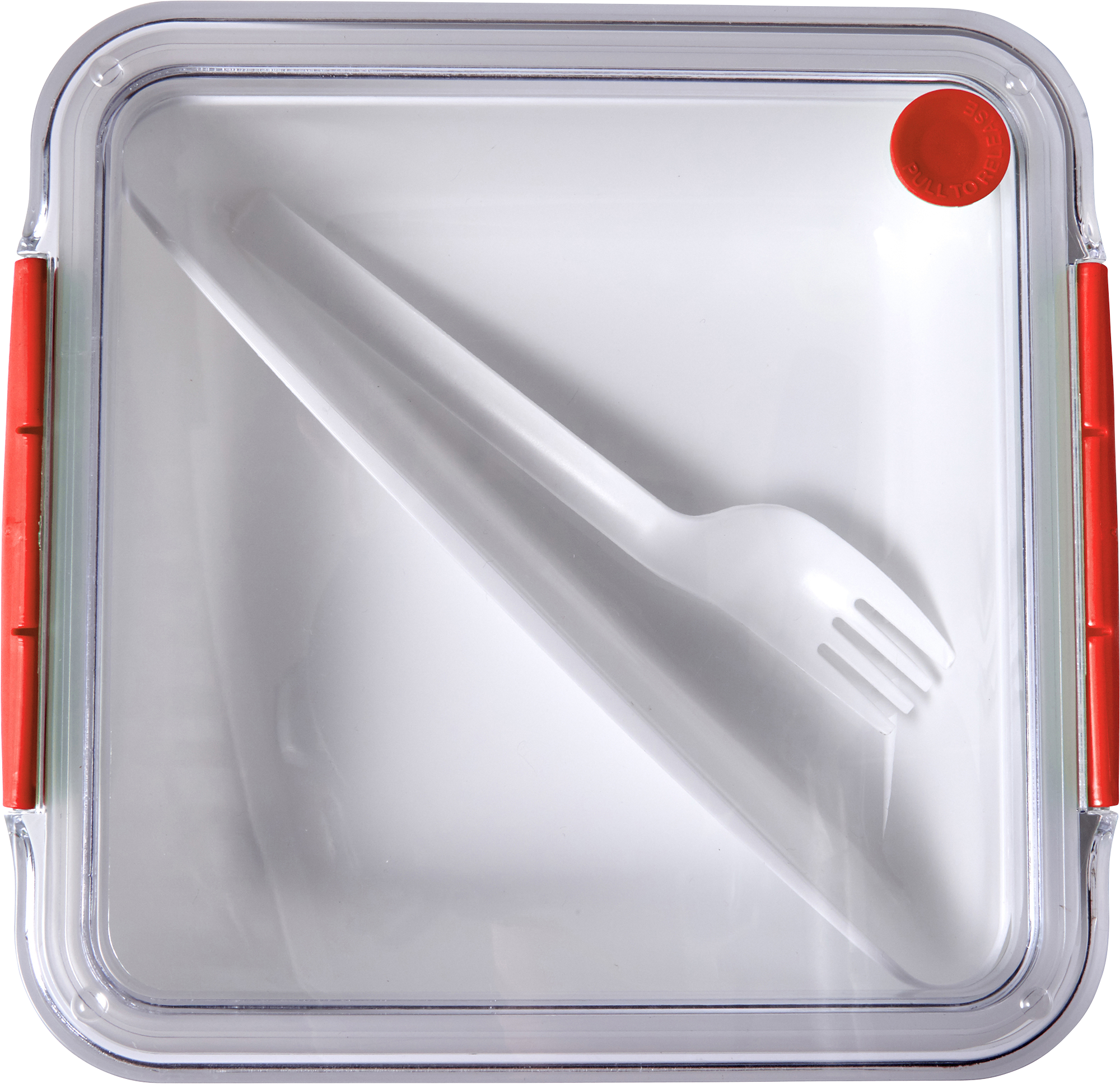 Lunch box (920 ml) with transparent lid and silicone closure with an loose triangular compartment and fork.