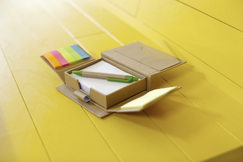 Memo holder including a plastic ruler in the lid, hundred fifty sticky notes, hundred sixty white pages and a pen loop with ballpen, blue ink.