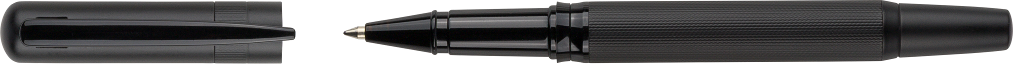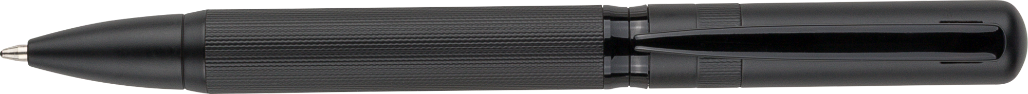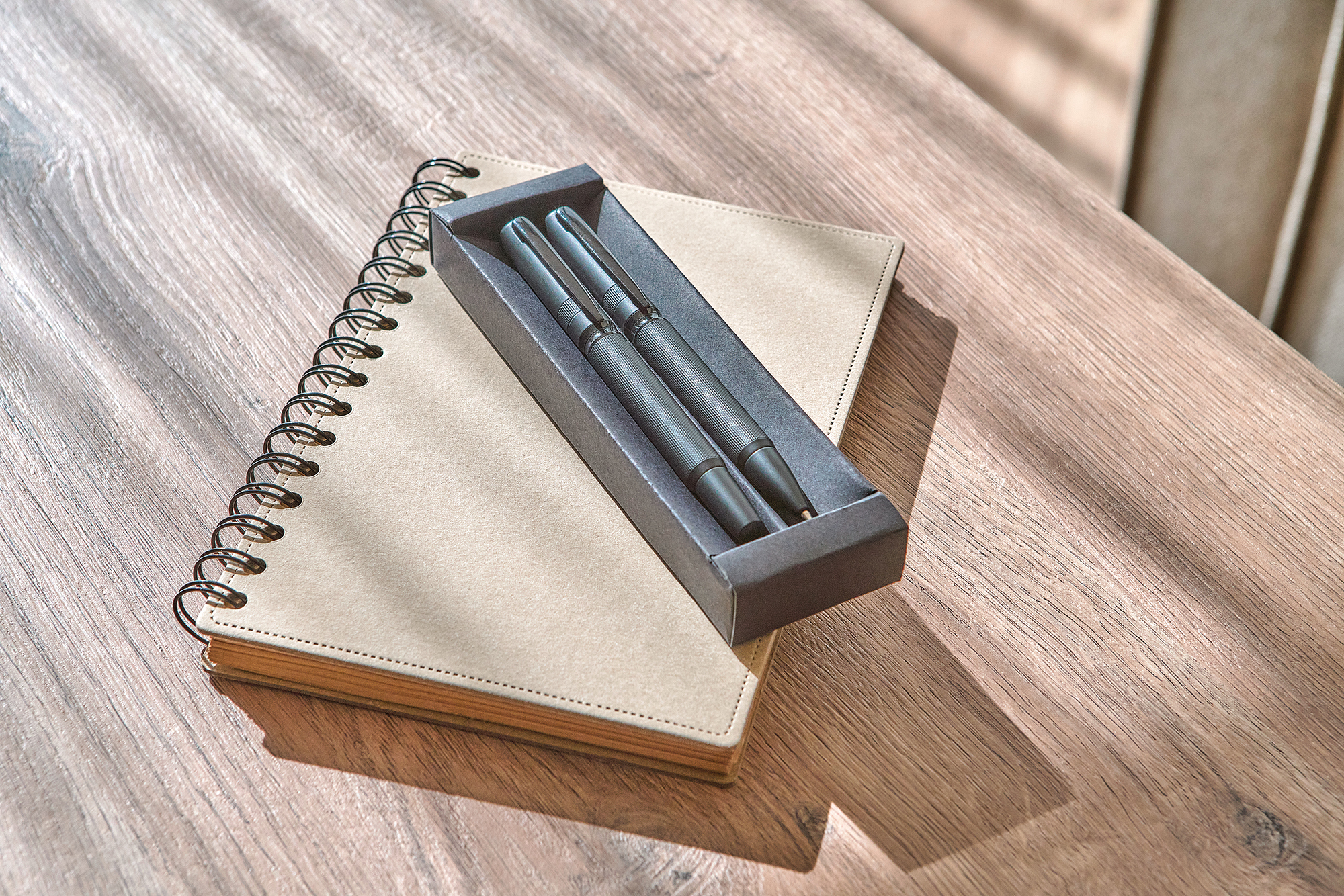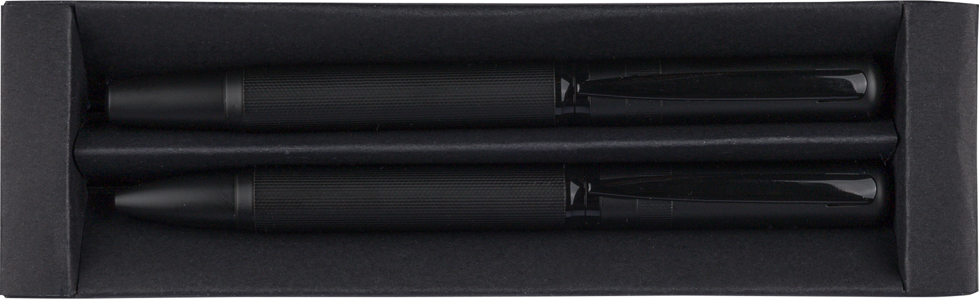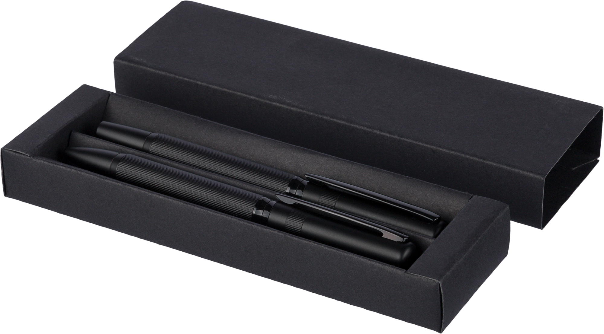 Stylish metal and eco brass pen set with a twist ballpen and rollerpen, both with blue German Dokumental ink. Packaged together in a black sliding box.