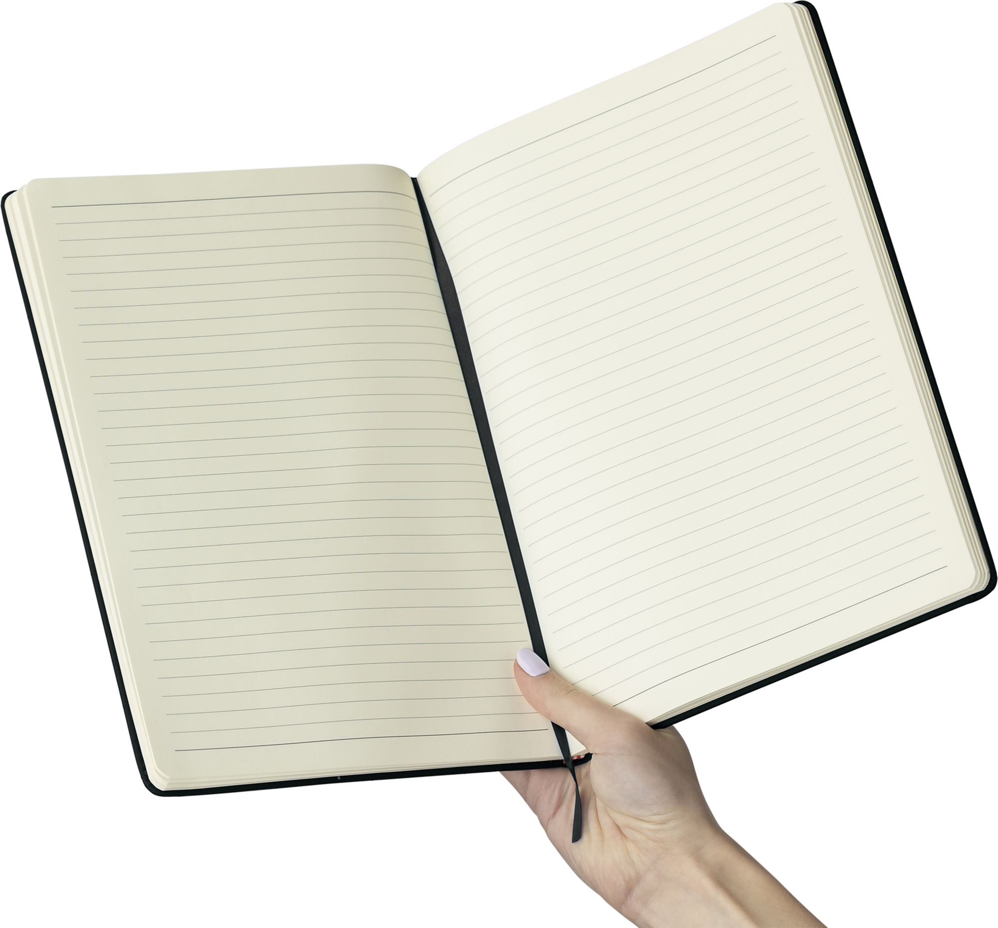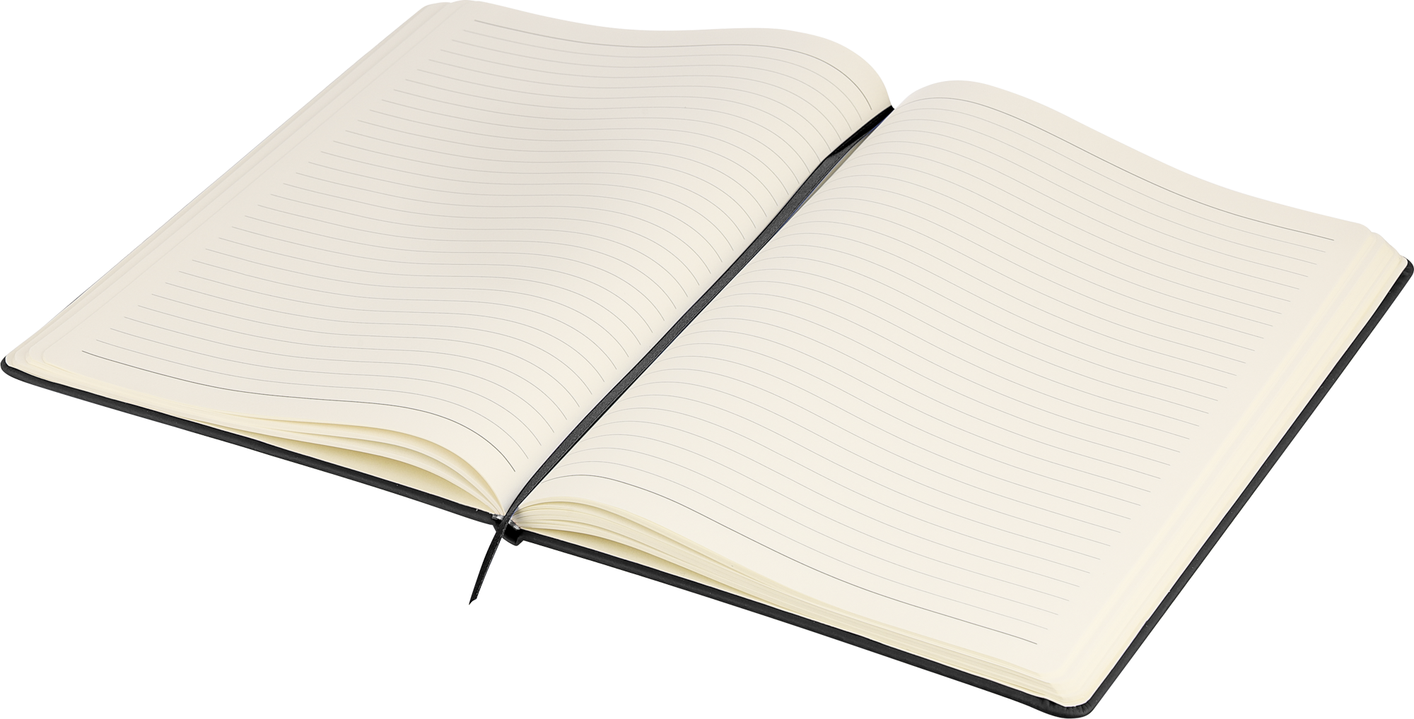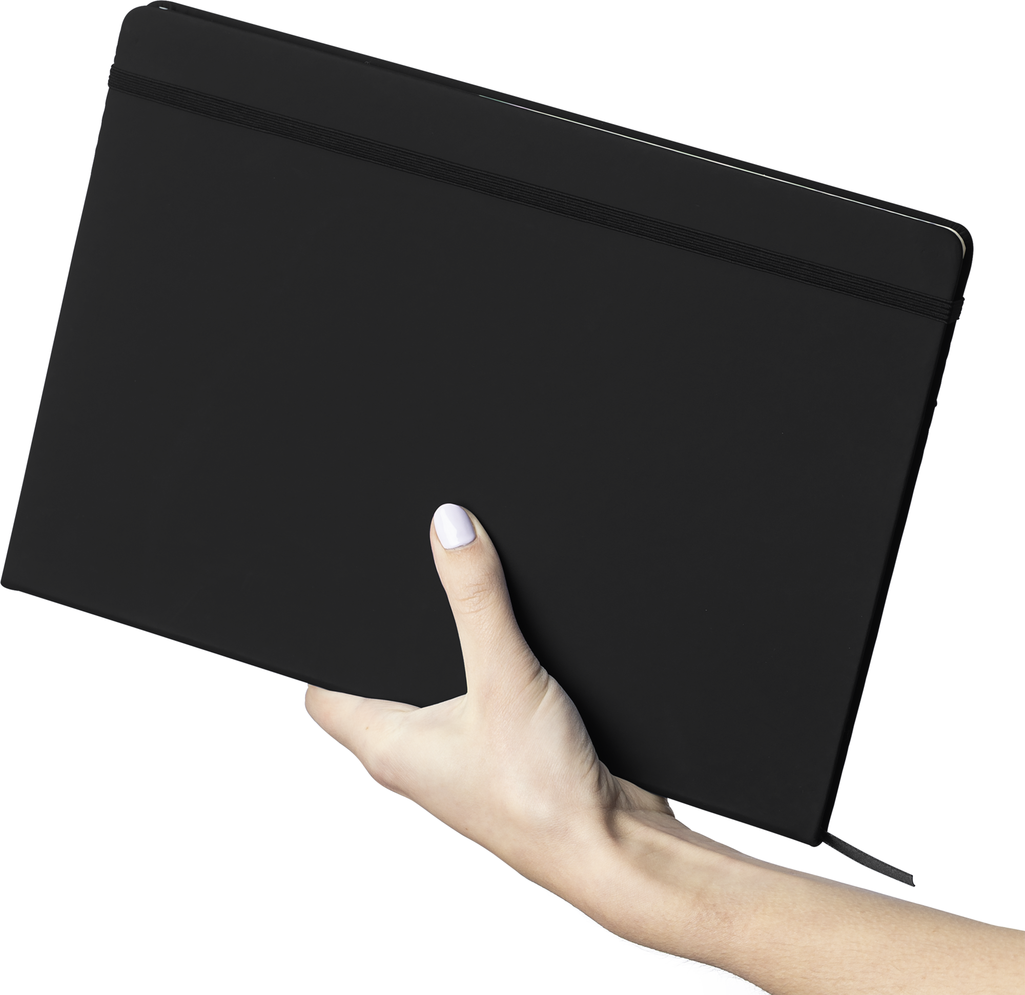 Notebook with hard cover made from brightly coloured recycled PU material. Includes 96 double-sided lined pages. The paper in this notebook is FSC® Mix certified. Features a matching coloured elastic band for closure, integrated ribbon marker, and embossed recycled PU logo on the back cover.