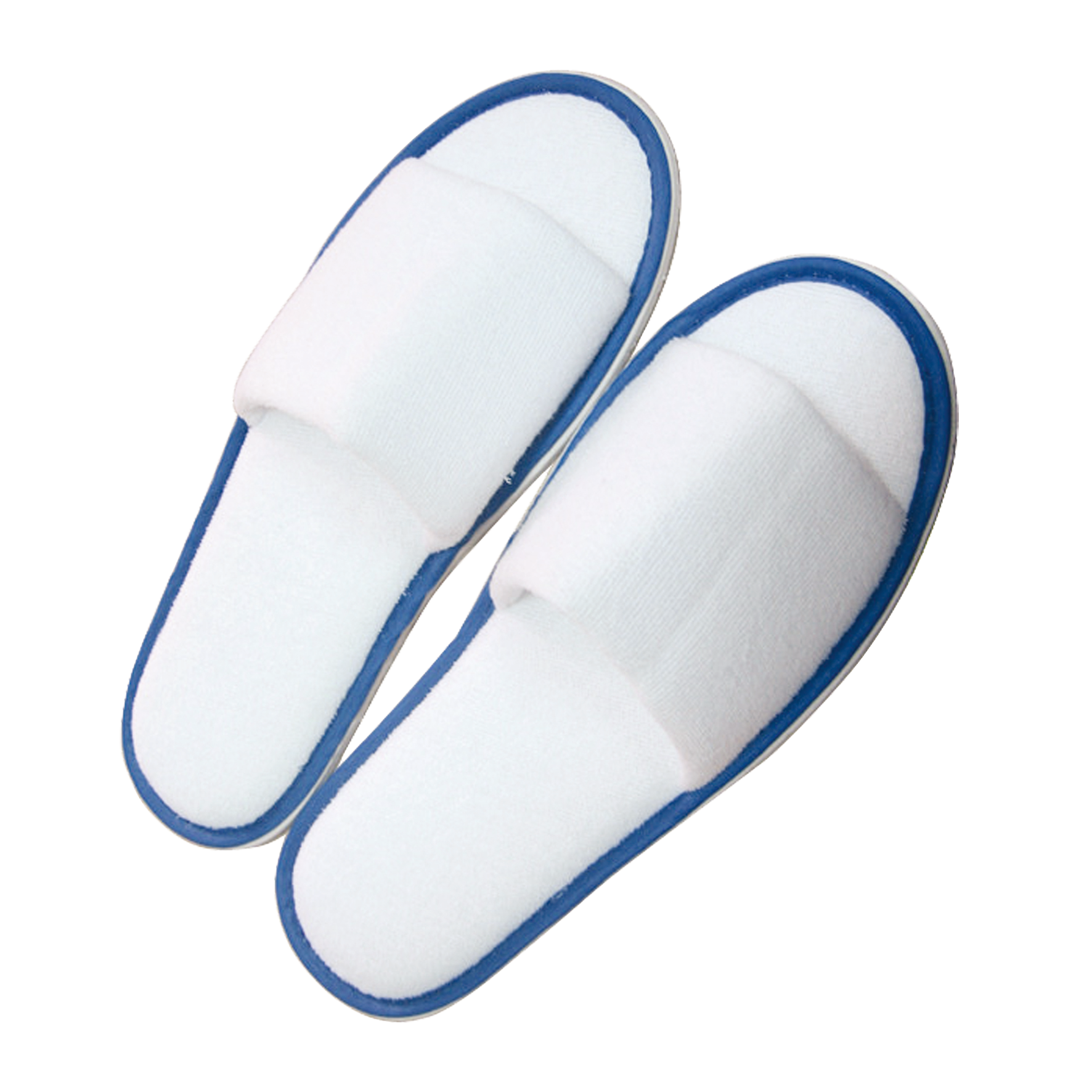 Pair of slippers, open toe, white terry with coloured band and with EVA sole.