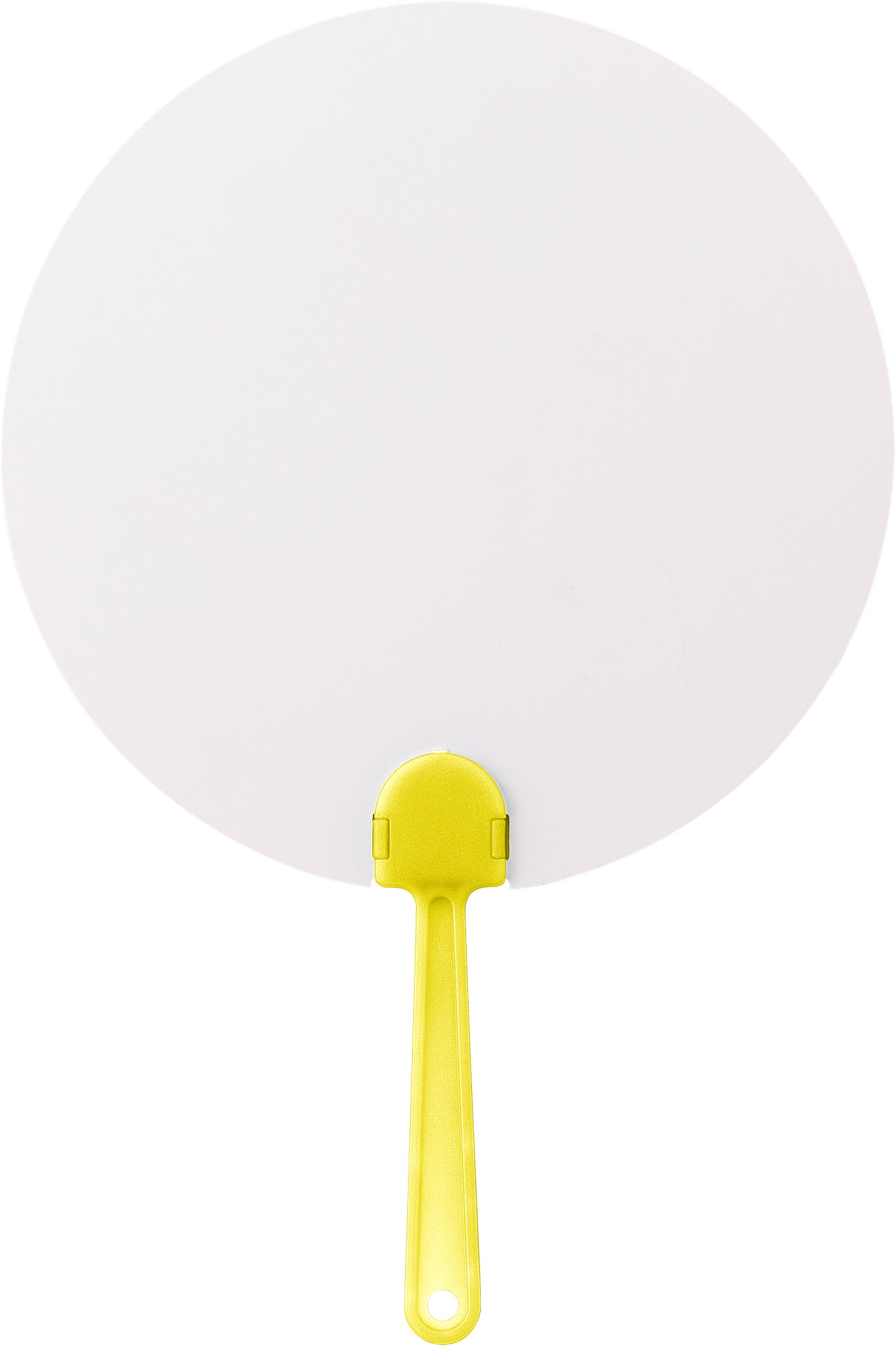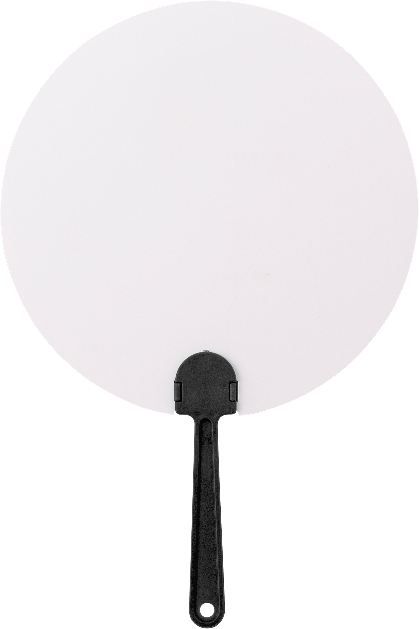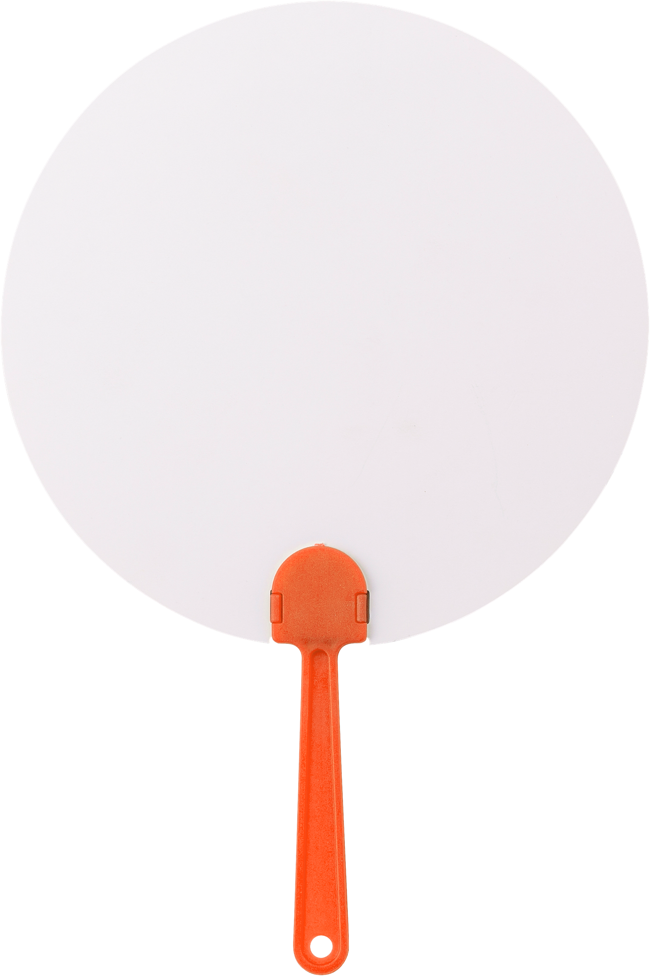Paper hand fan with plastic handle. Diameter 17 cm.