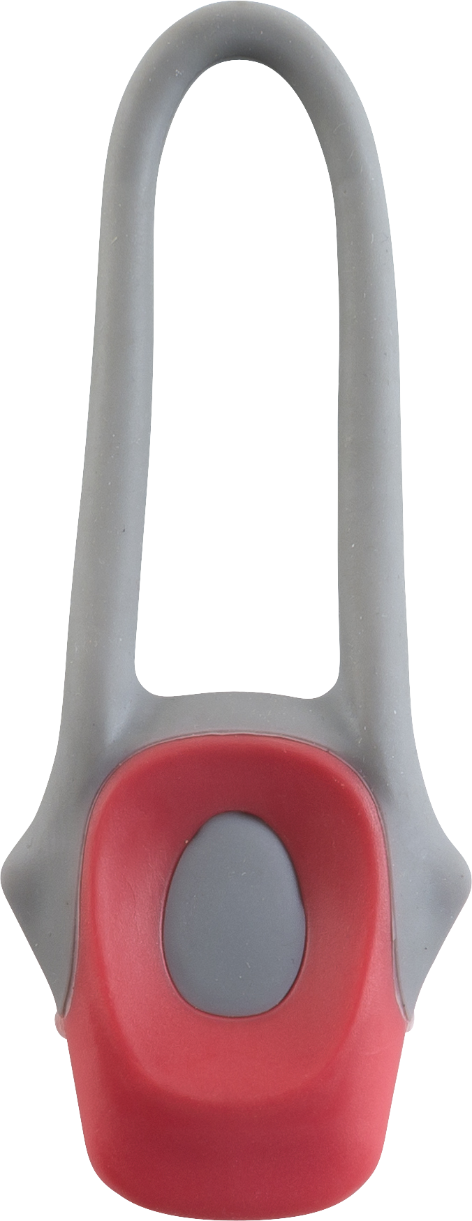 Plastic bicycle light with two LEDS with a silicone strap for attaching purposes, two blinking options, and an on/off switch. The white light is for the front of the bike and the red for the back. Batteries included.