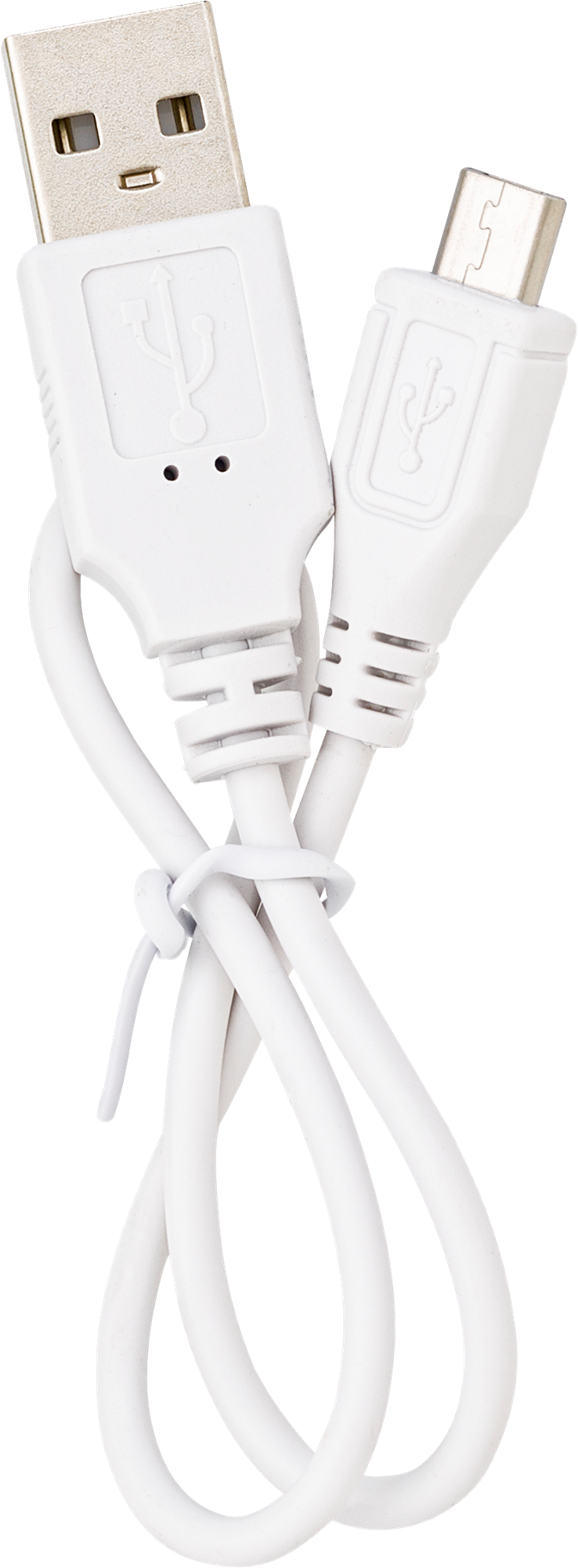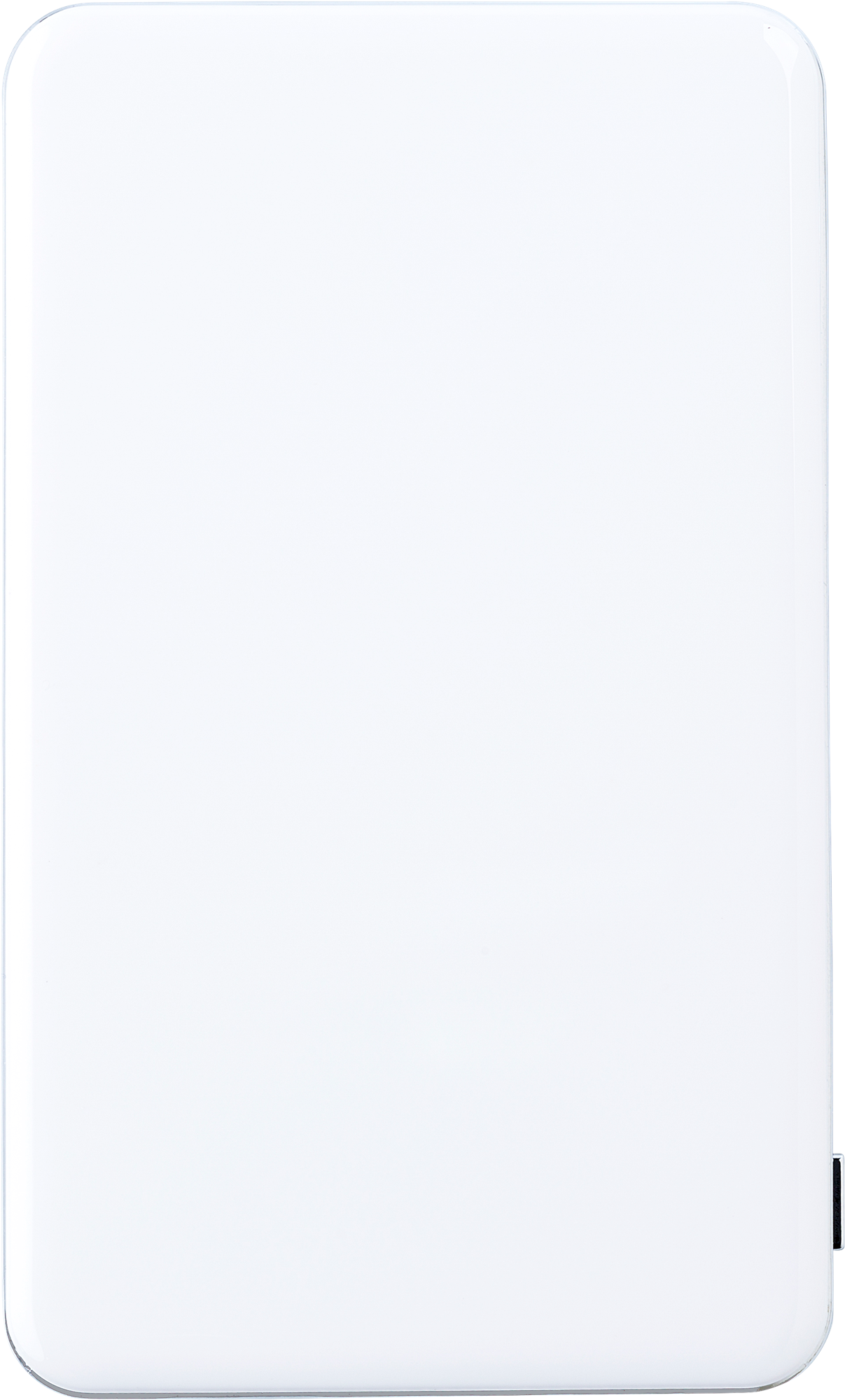 Plastic Li-polymer power bank with a capacity of 5000mAh, input of 5V/1000mA, and output of 1500mA/2100mA/5V. Both sides are shiny with a silver coloured rim. Includes 5 blue LED power indication lights and a white USB/micro USB cable (approx. 32 cm.).