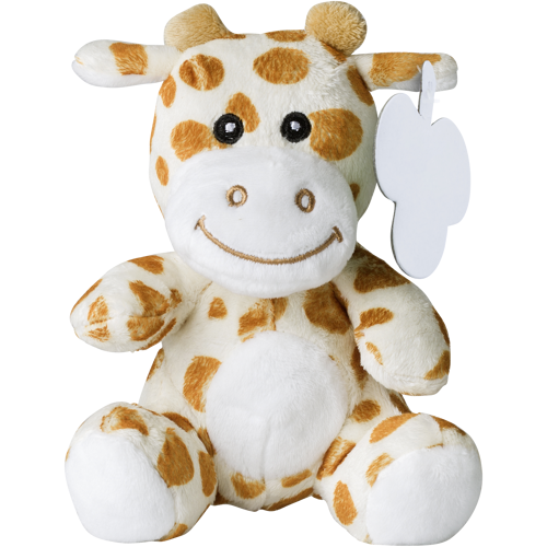 Plush dog with embroidered eyes. Includes a tag for printing purposes.