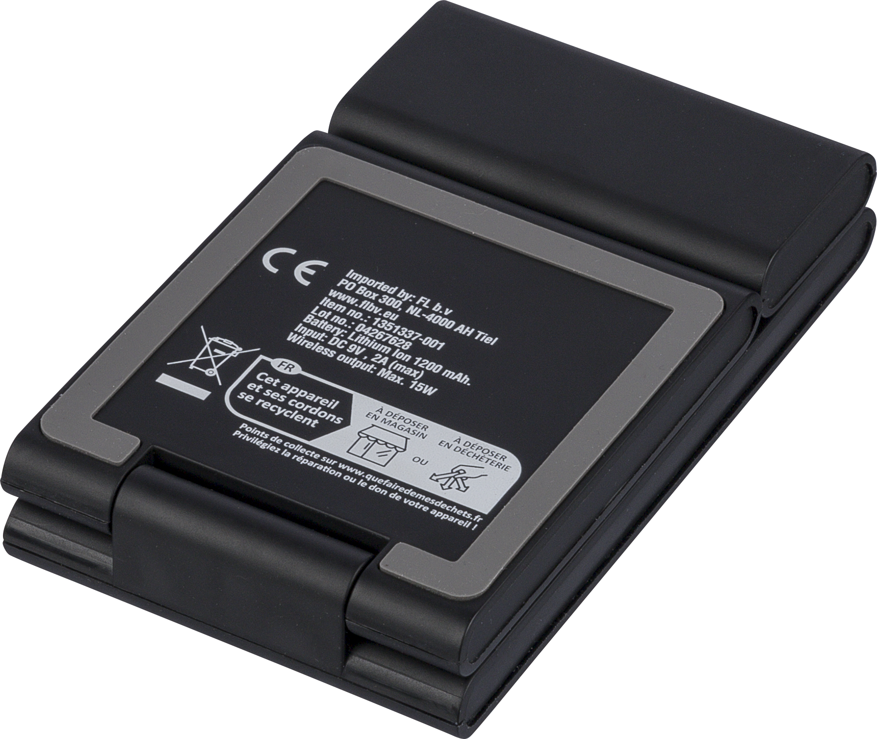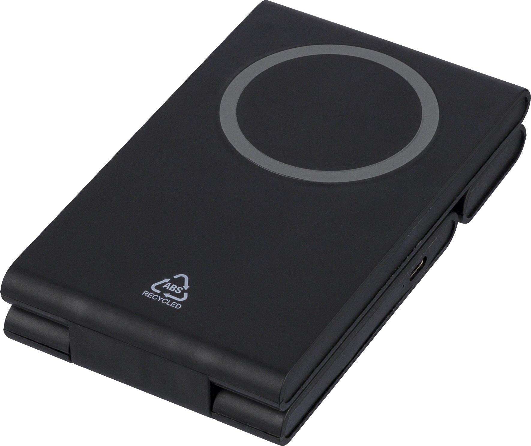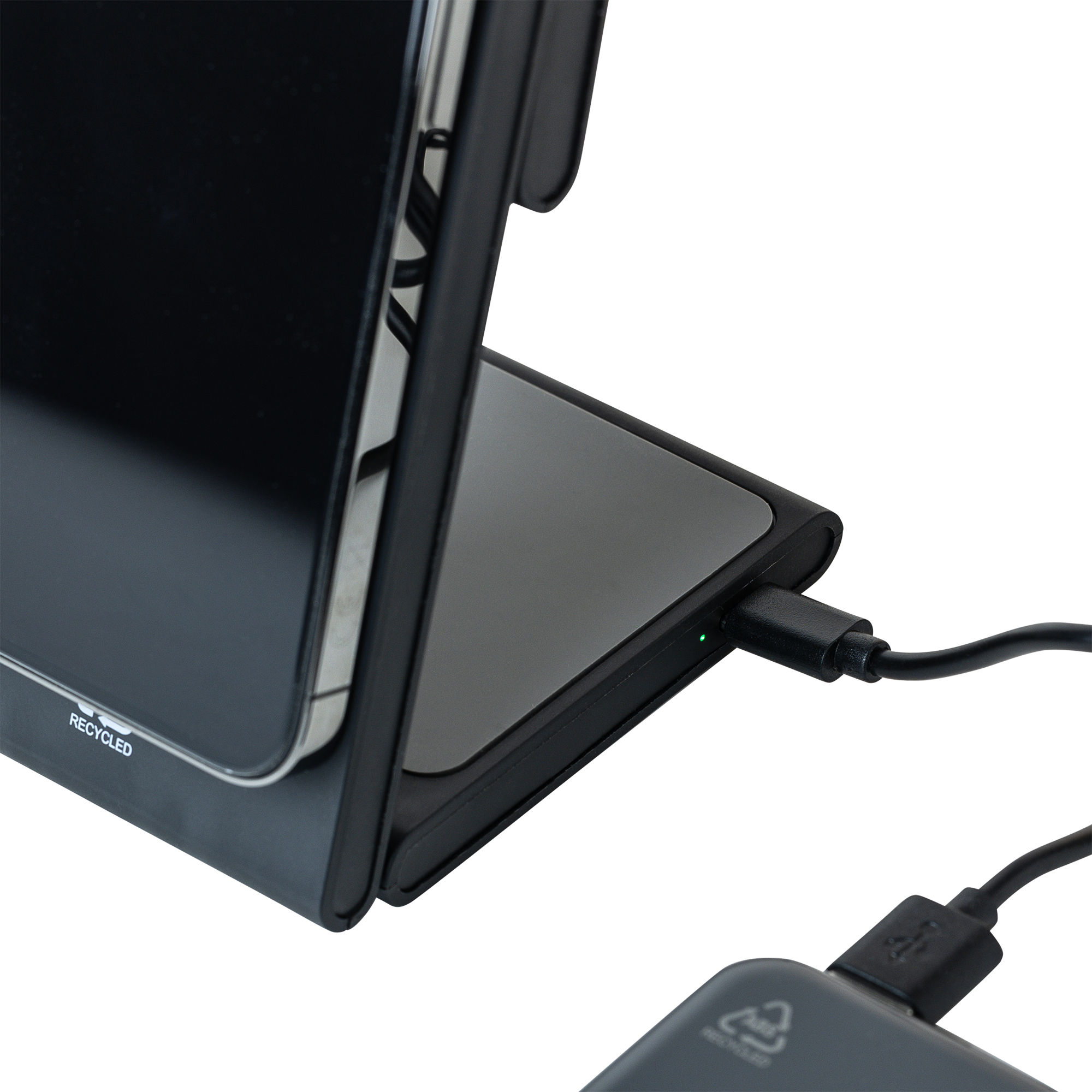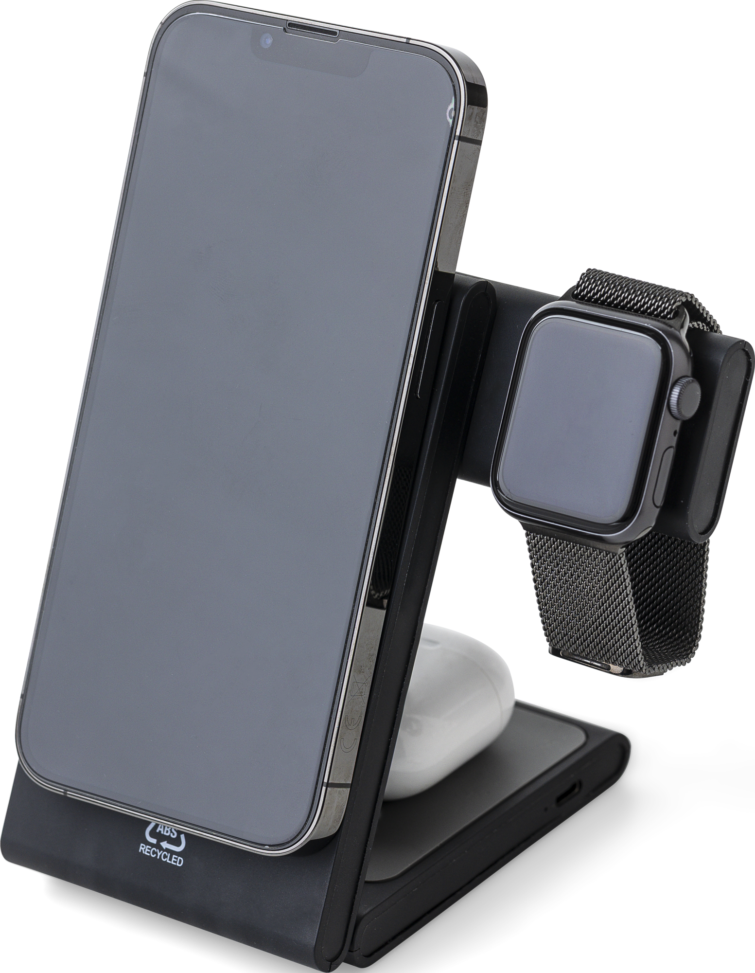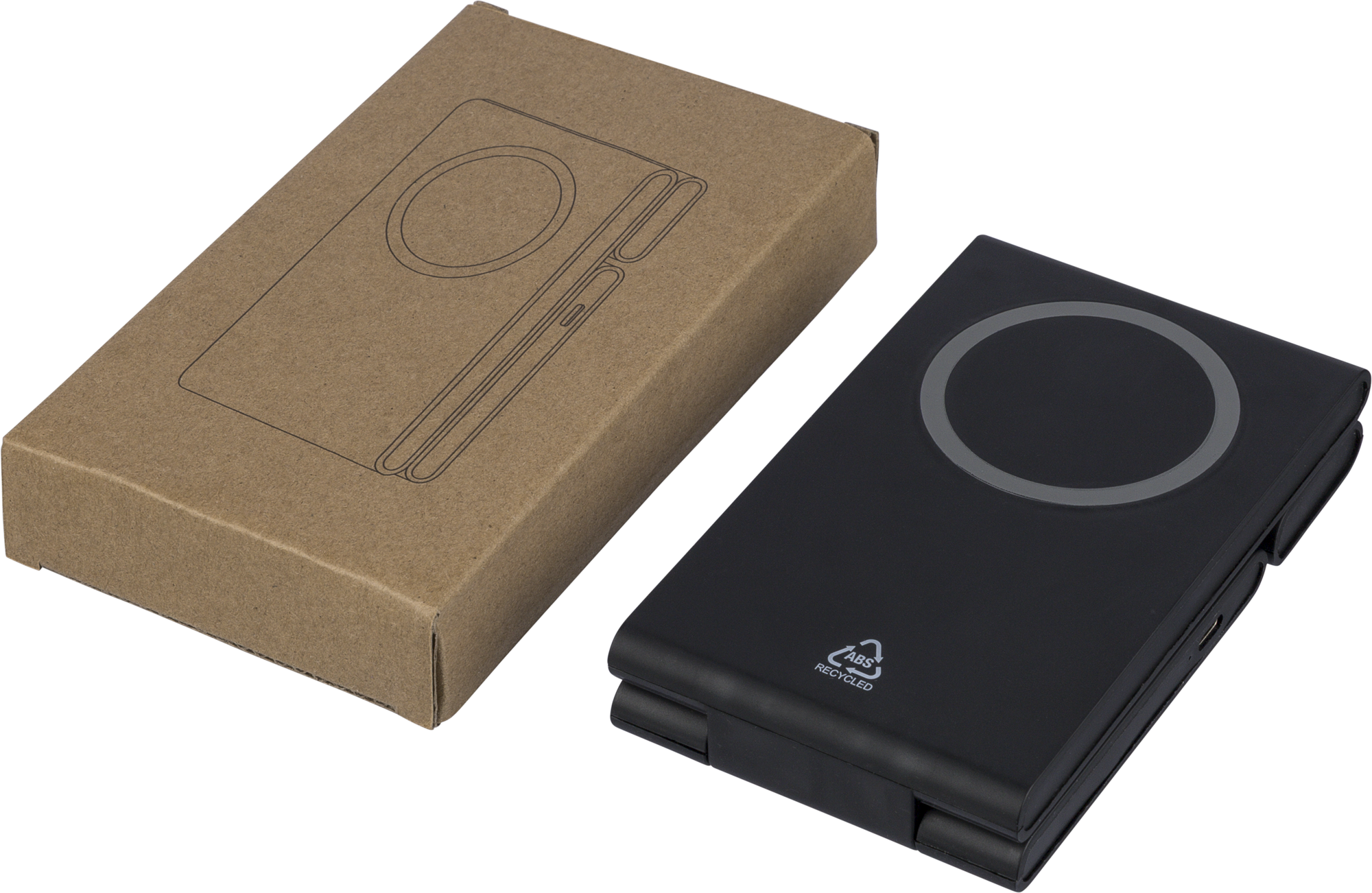 Recycled magnetic charger for phone (15W), AirPods (5W), and iWatch (2W). Ultra-flat with fold-up stand. Input: 5V/3A or 9V/3A. Recycled logo. Packed in a brown box.