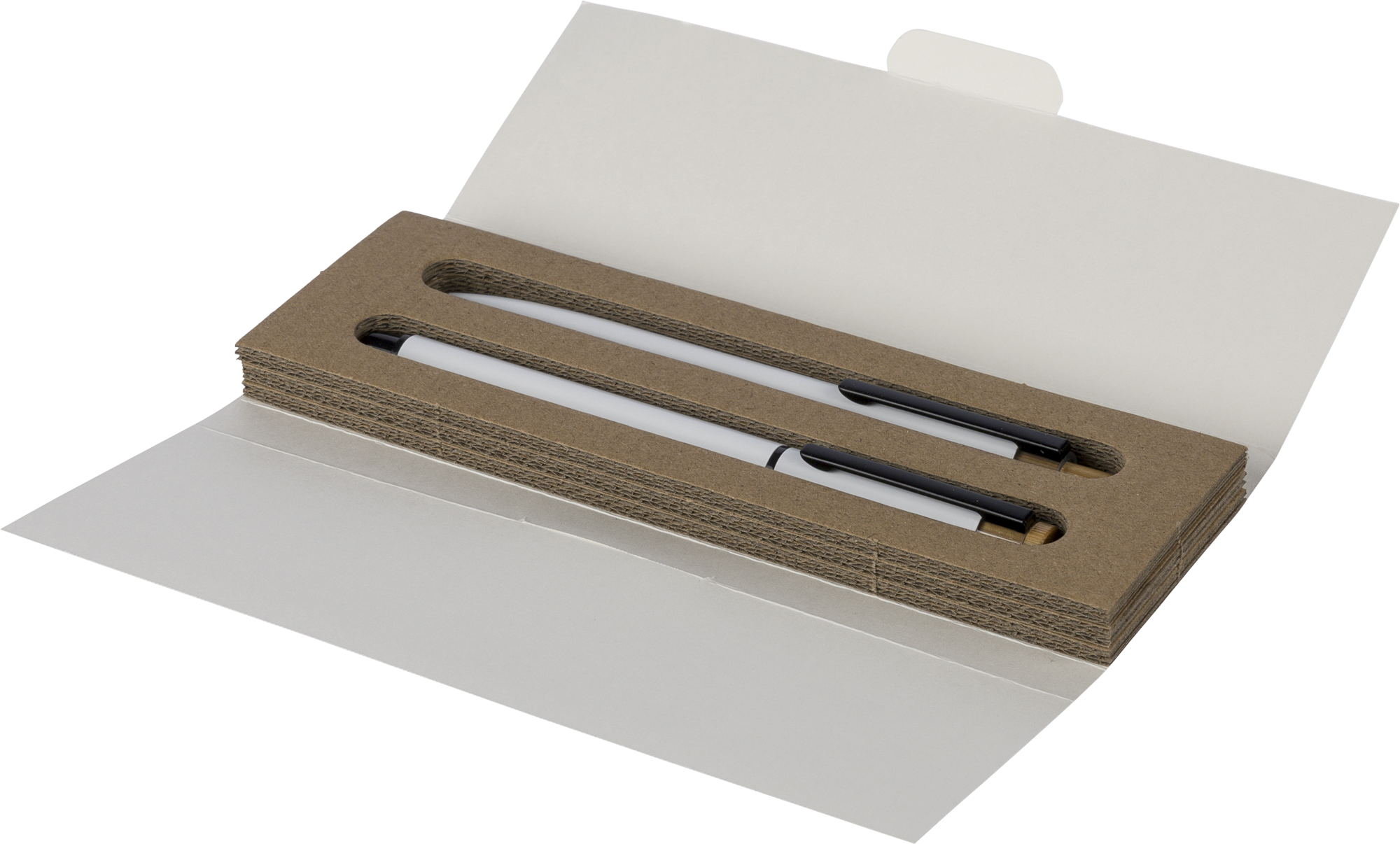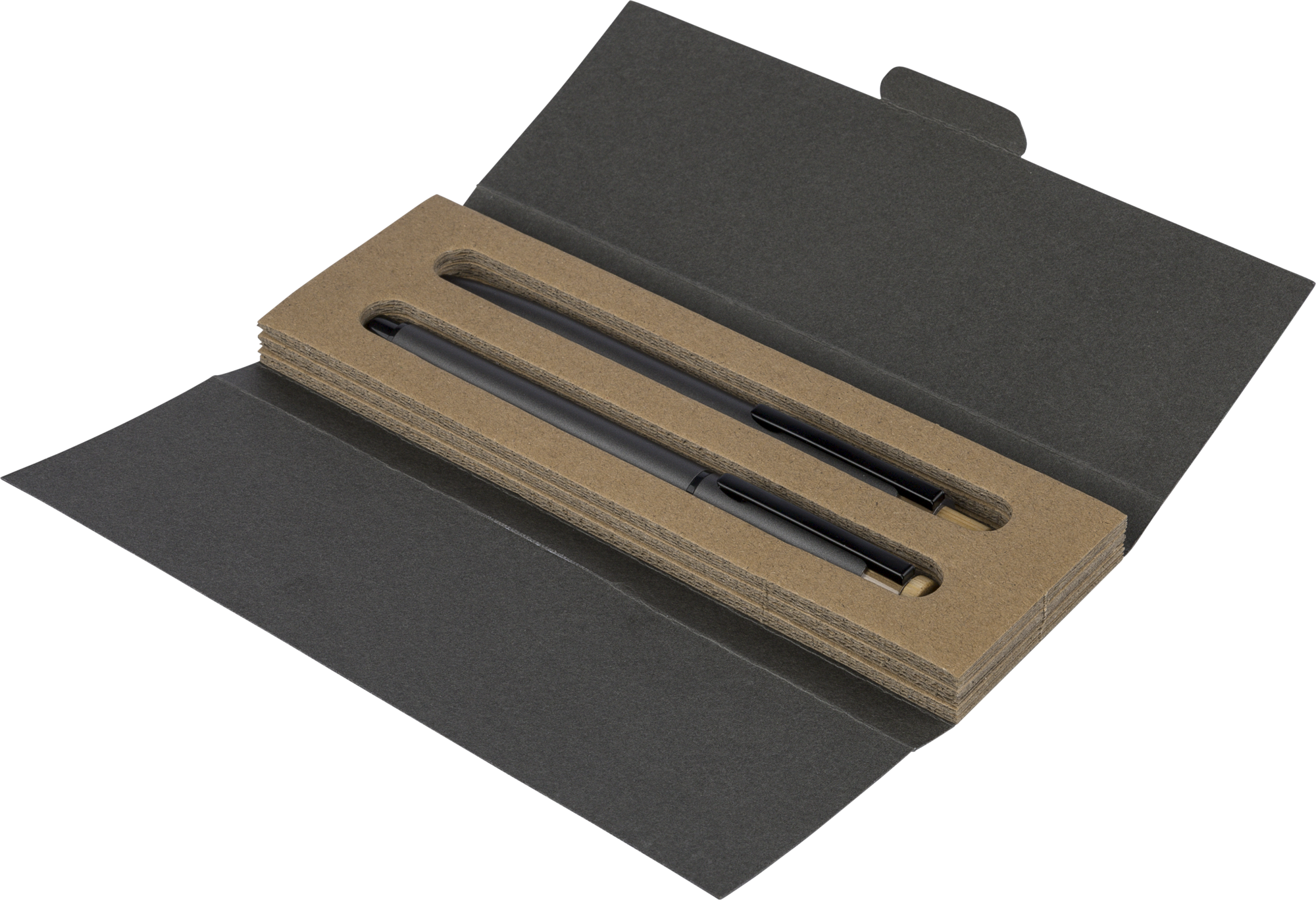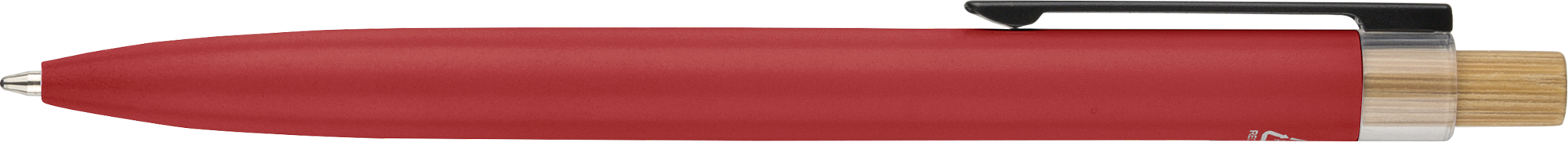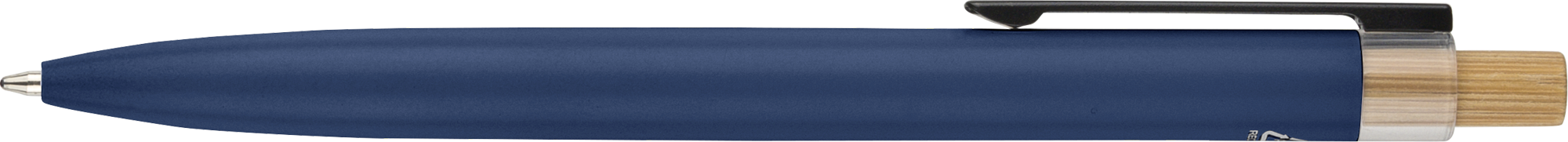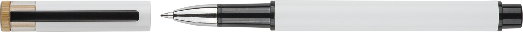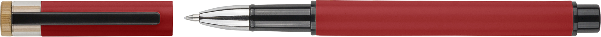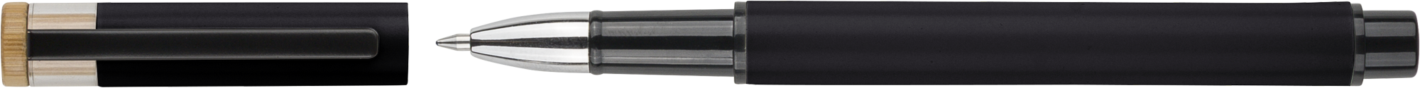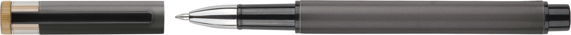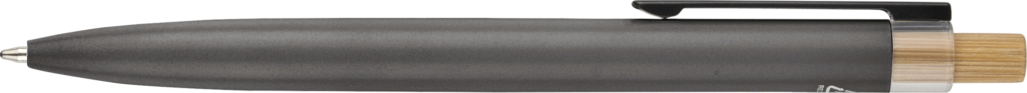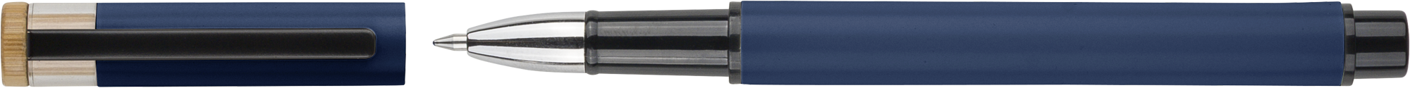 Recycled aluminium lacquered pen set with ballpen and rollerpen with blue ink. Both with engraved a recycled logo. Blue ink. Packed in a recycled cardboard gift box.
