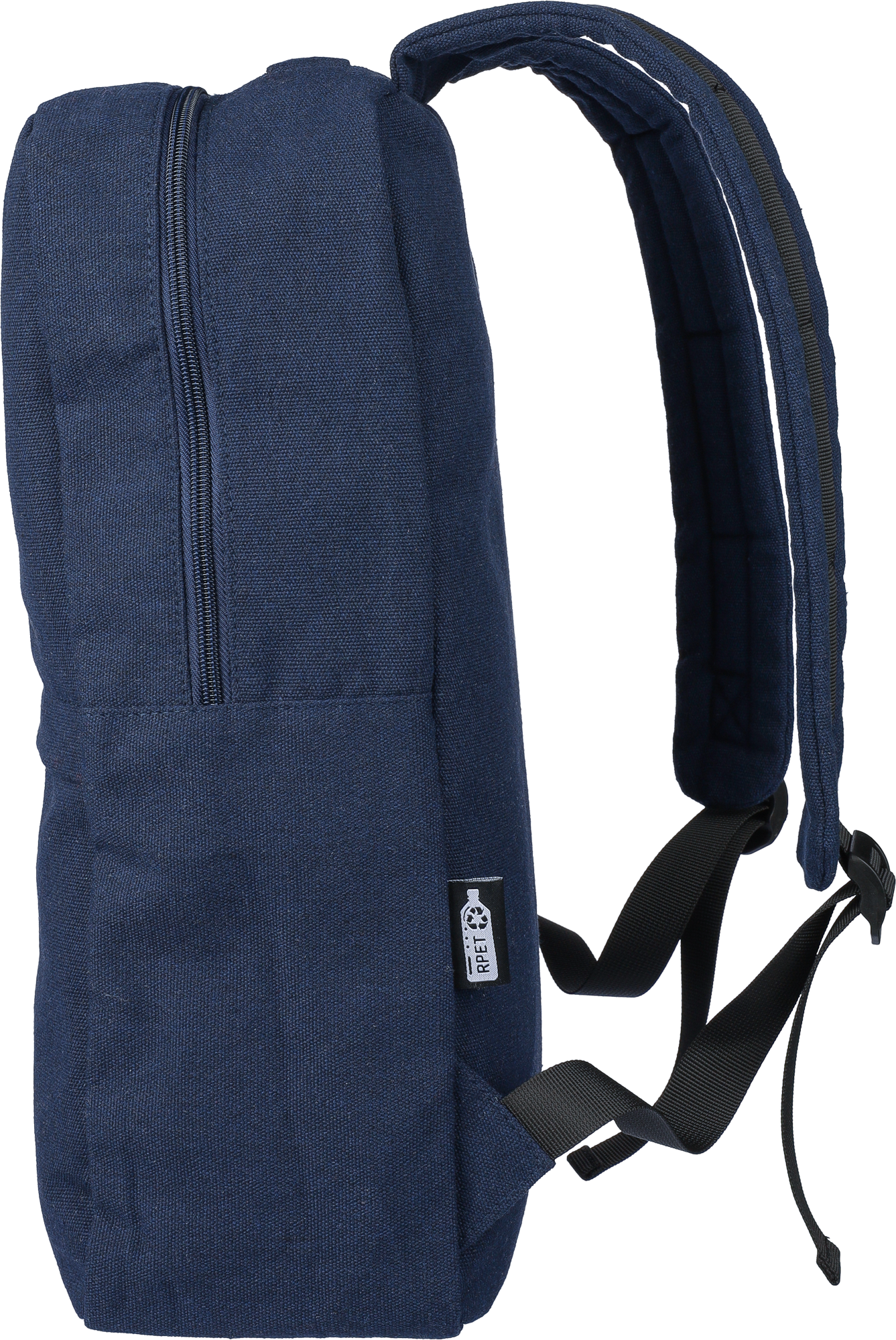 Recycled polycotton backpack with 210D polyester lining. Features a large zipped compartment with a padded 15-inch laptop pocket, and various other pockets. Includes padded adjustable shoulder straps and handle. Capacity: 14L. Carrying capacity: 13 kg.