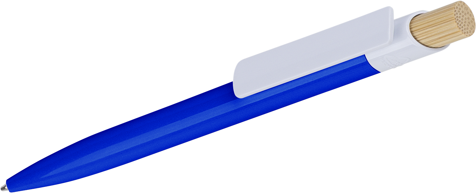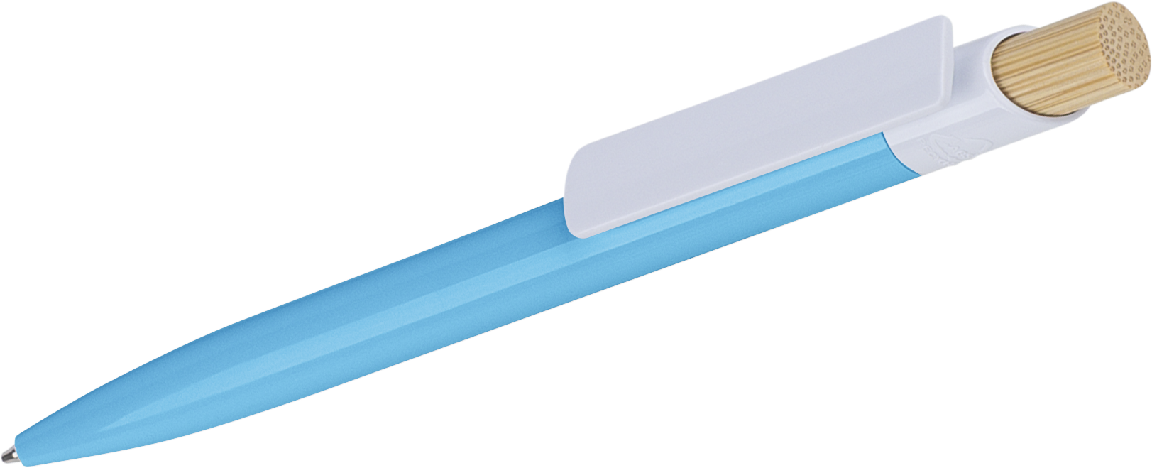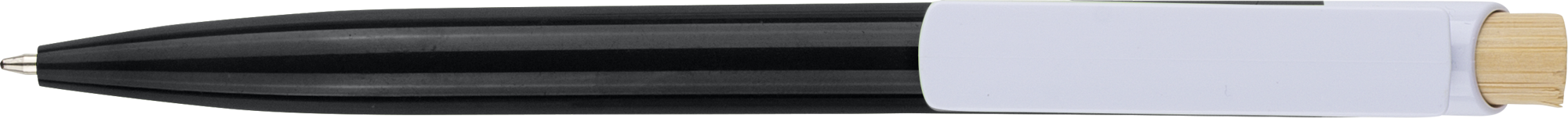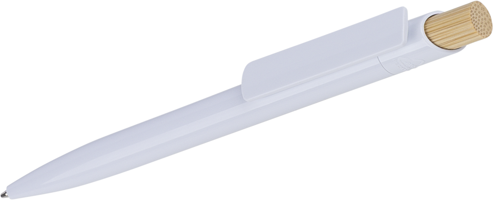 Recycled ballpen with bamboo push button and blue ink, suitable for digital printing. Features a recycled logo in the mould.