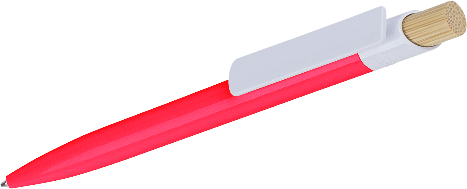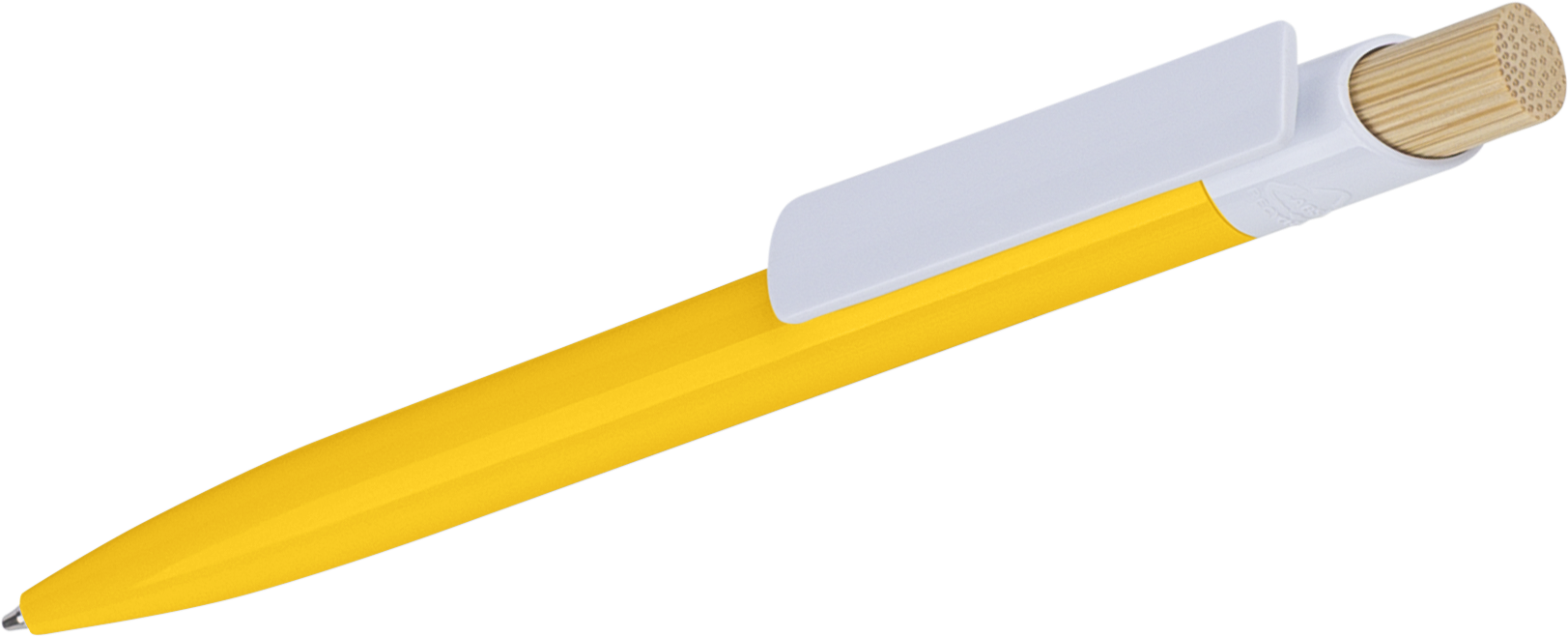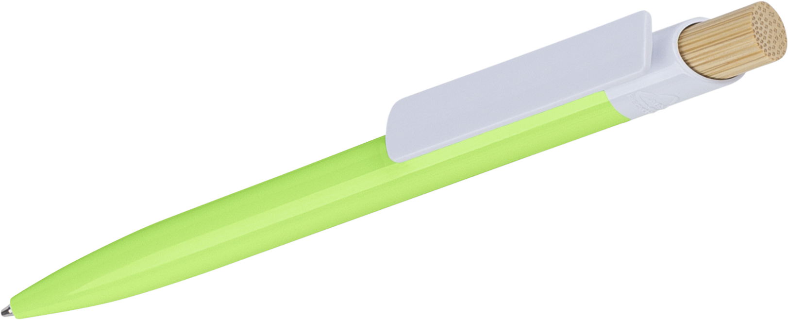 Recycled ballpen with bamboo push button and blue ink, suitable for digital printing. Features a recycled logo in the mould.