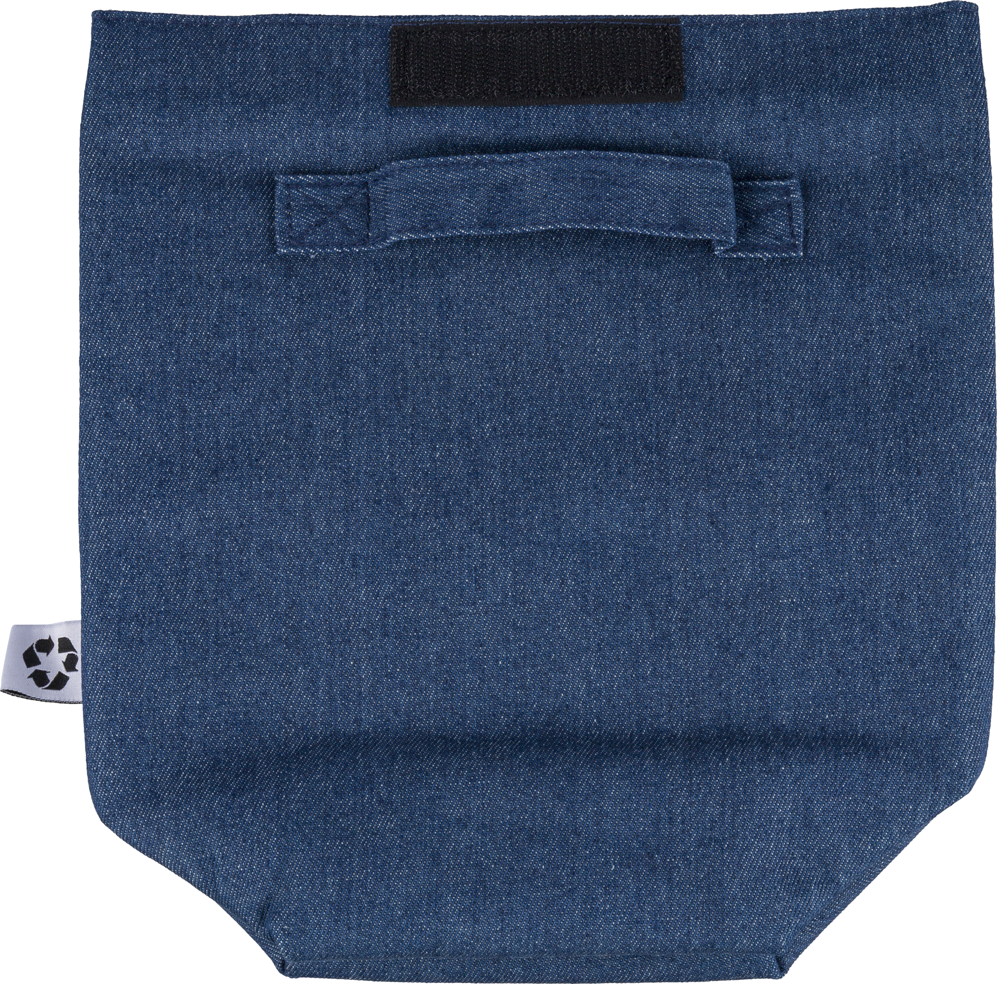 Recycled cooler roll-top bag with velcro closing, PEVA interior and a short carrying handle. Features a front pocket and a recycled label on the outside.