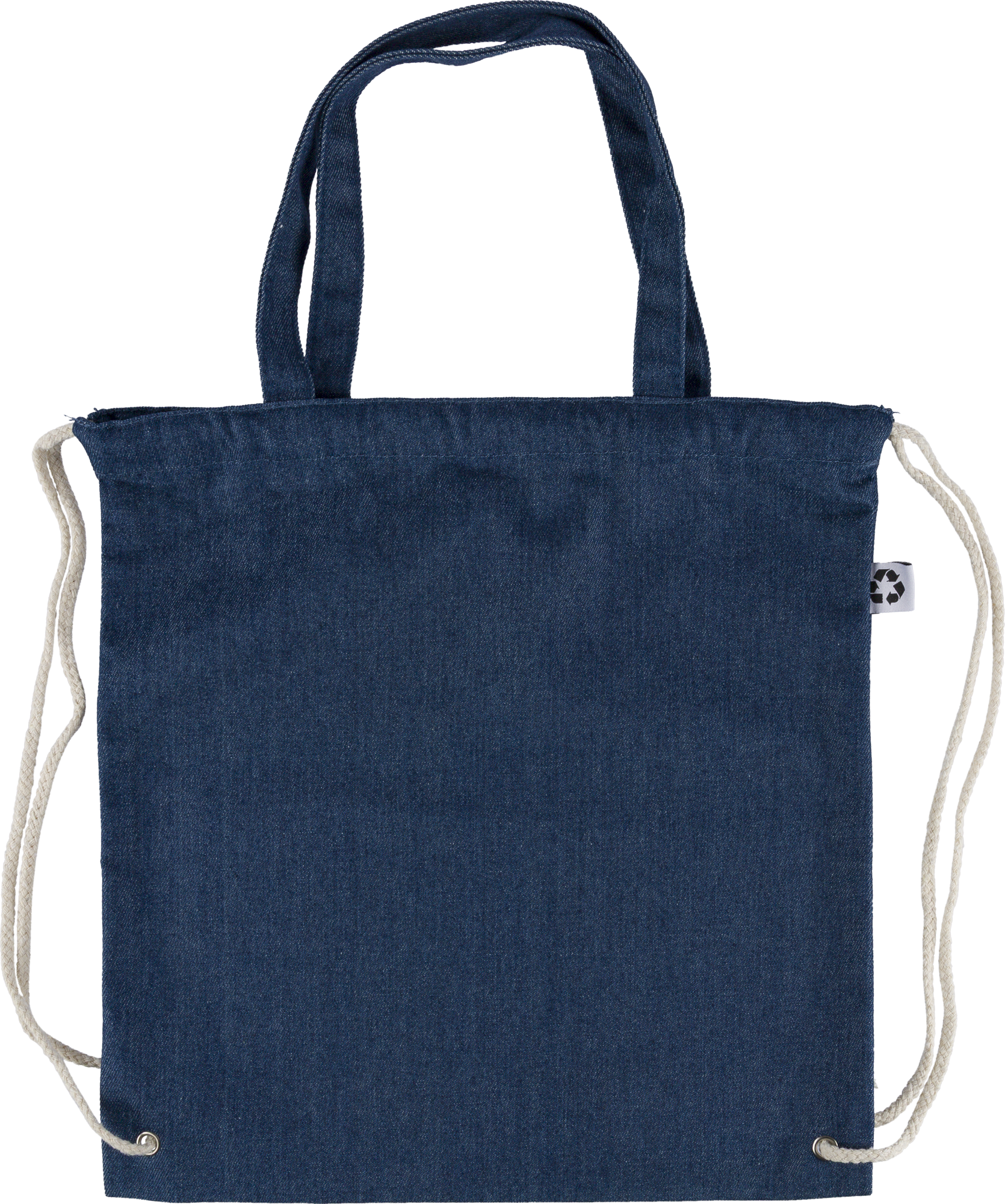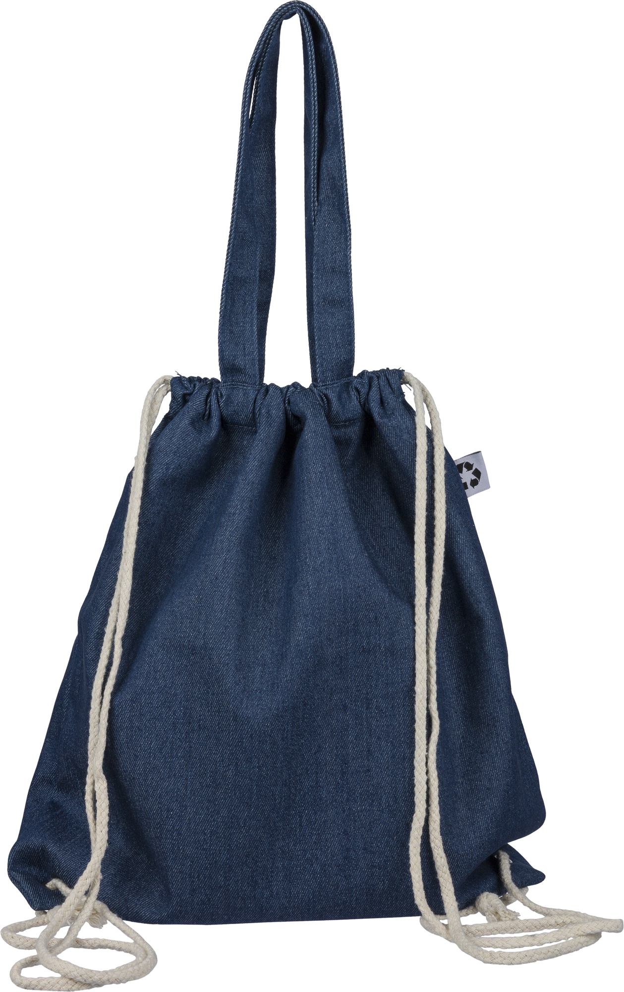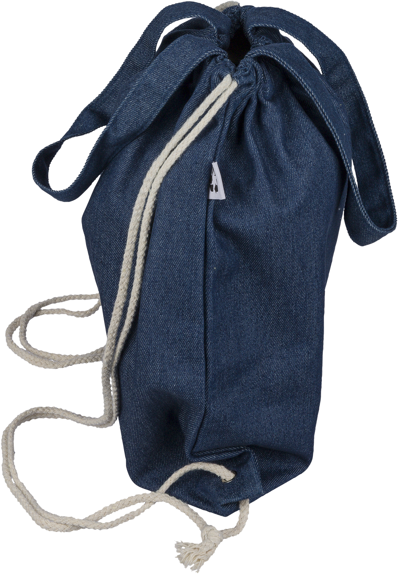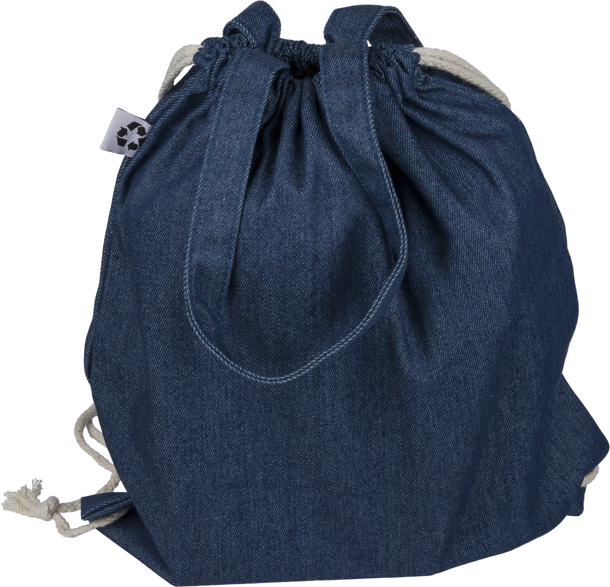 Recycled drawstring bag with carrying hand loop. Includes a recycled label on the outside.