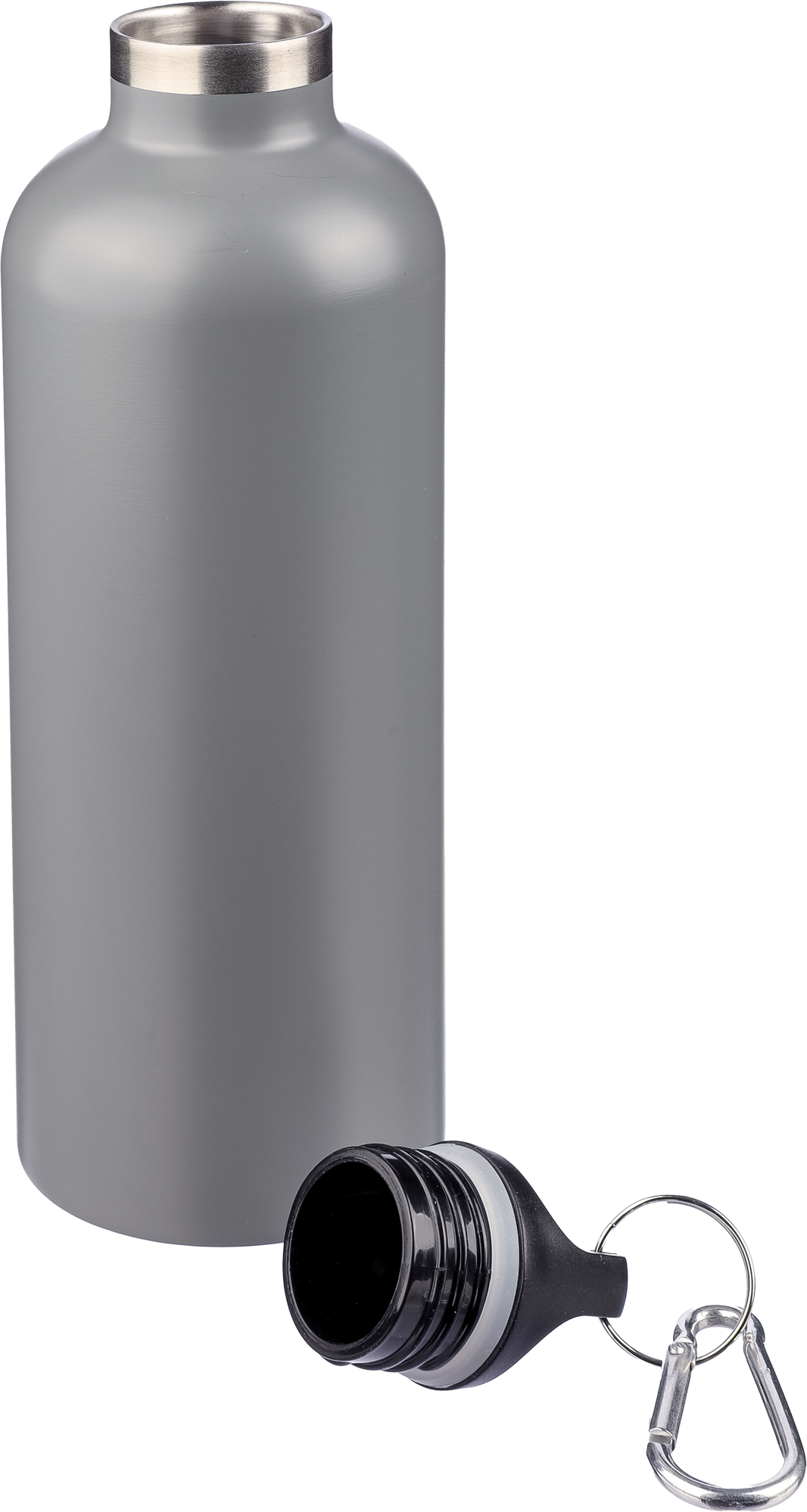 Recycled stainless steel double-walled bottle with a carabiner belt clip. Keeps beverages hot for 8 hours, and cold for 12 hours. The bottle features a matte finish (except for silver) and includes a recycled, lasered logo. Individually packaged in a cardboard box. Not dishwasher safe.