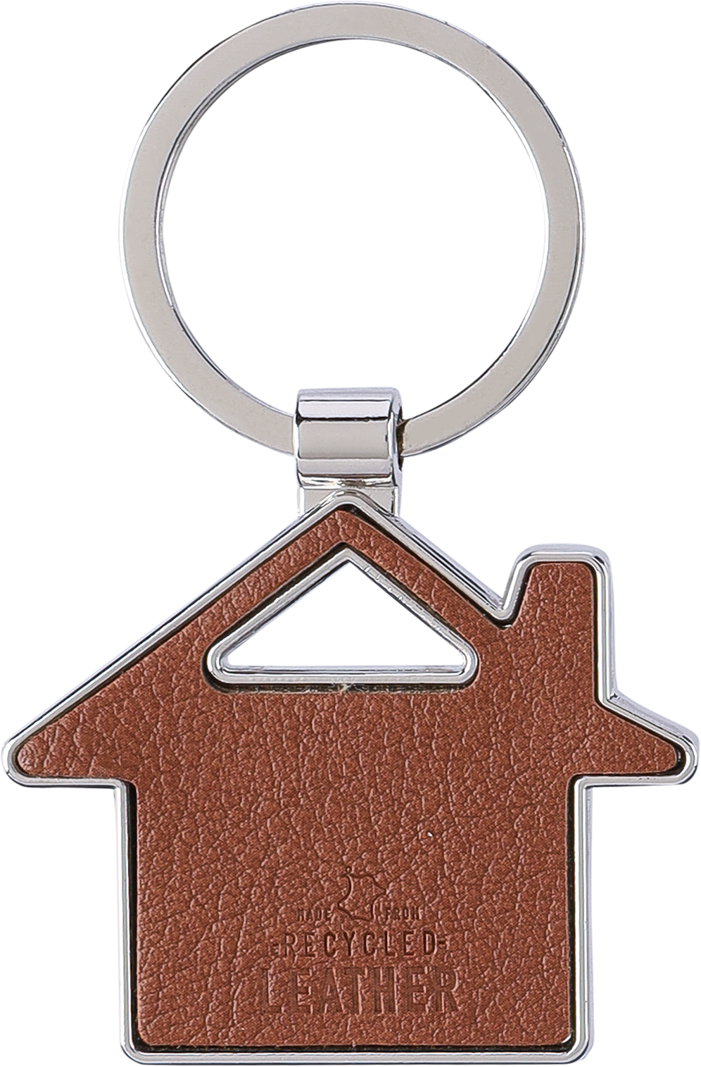 Metal house shaped keyring with a recycled leather inlay and embossed recycled leather logo on one side.