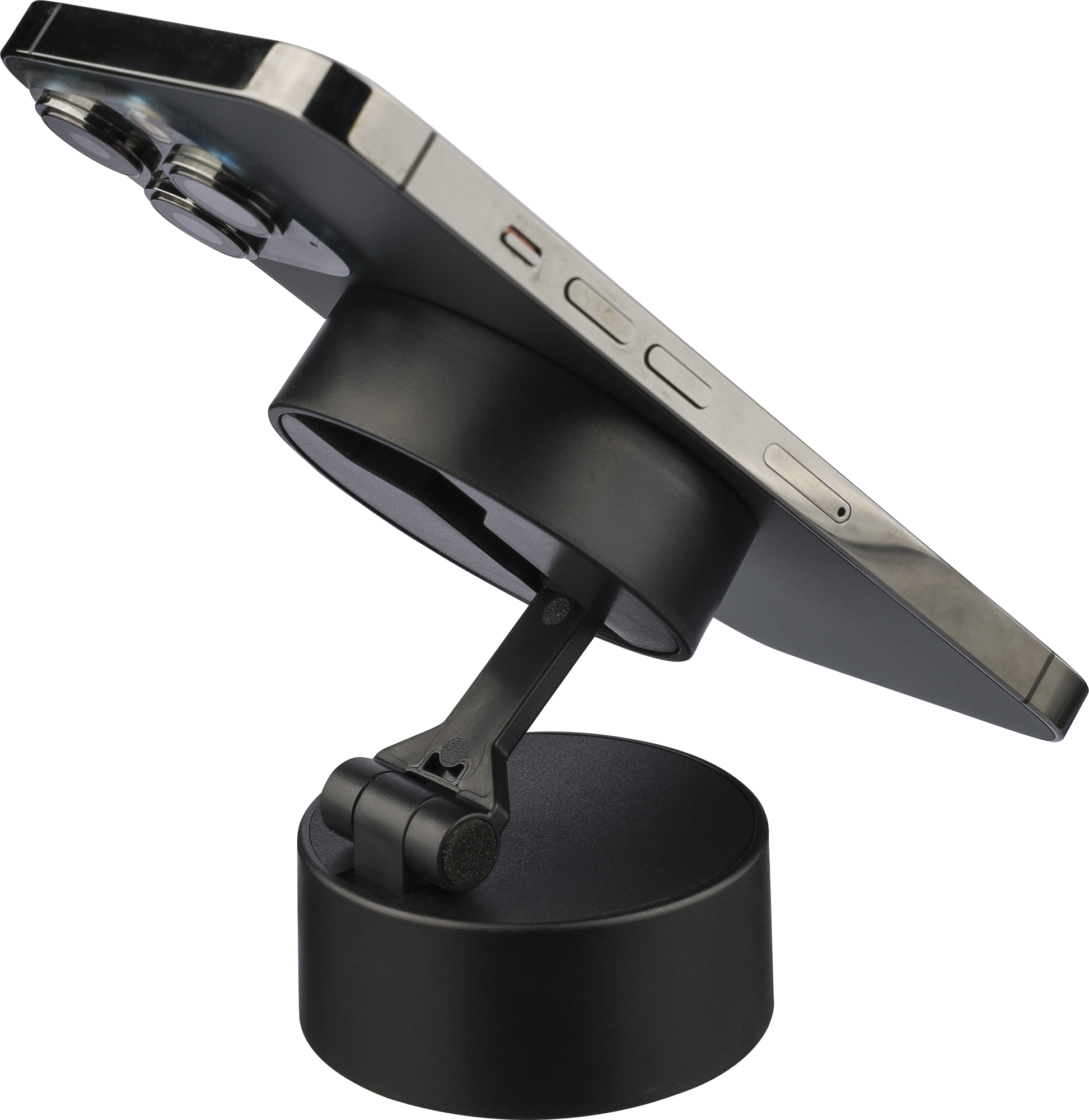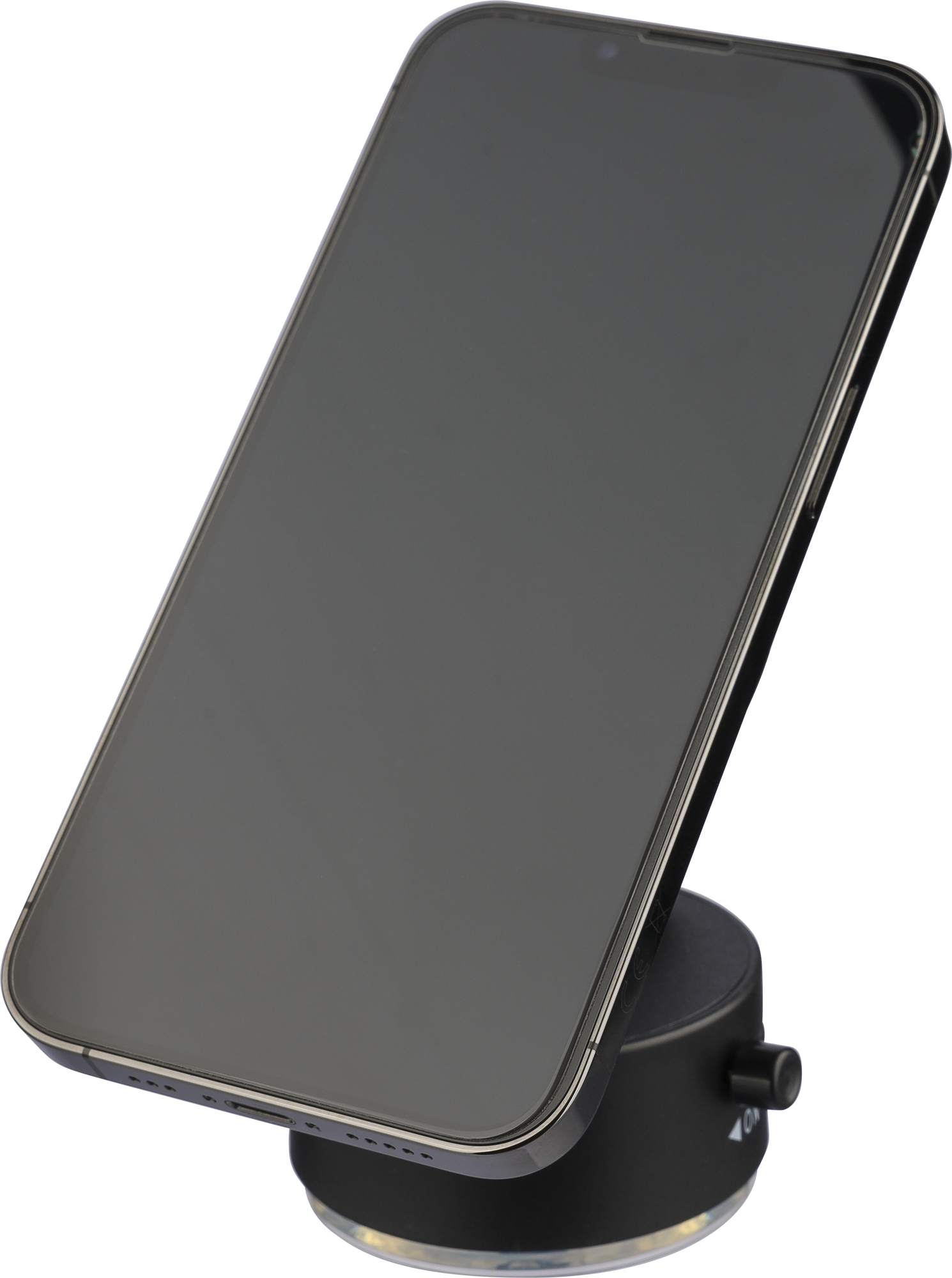 Recycled MagSafe magnetic phone stand with suction cup base, lock function for secure use on smooth surfaces and metal ring for universal phone compatibility. Packed in a brown box.