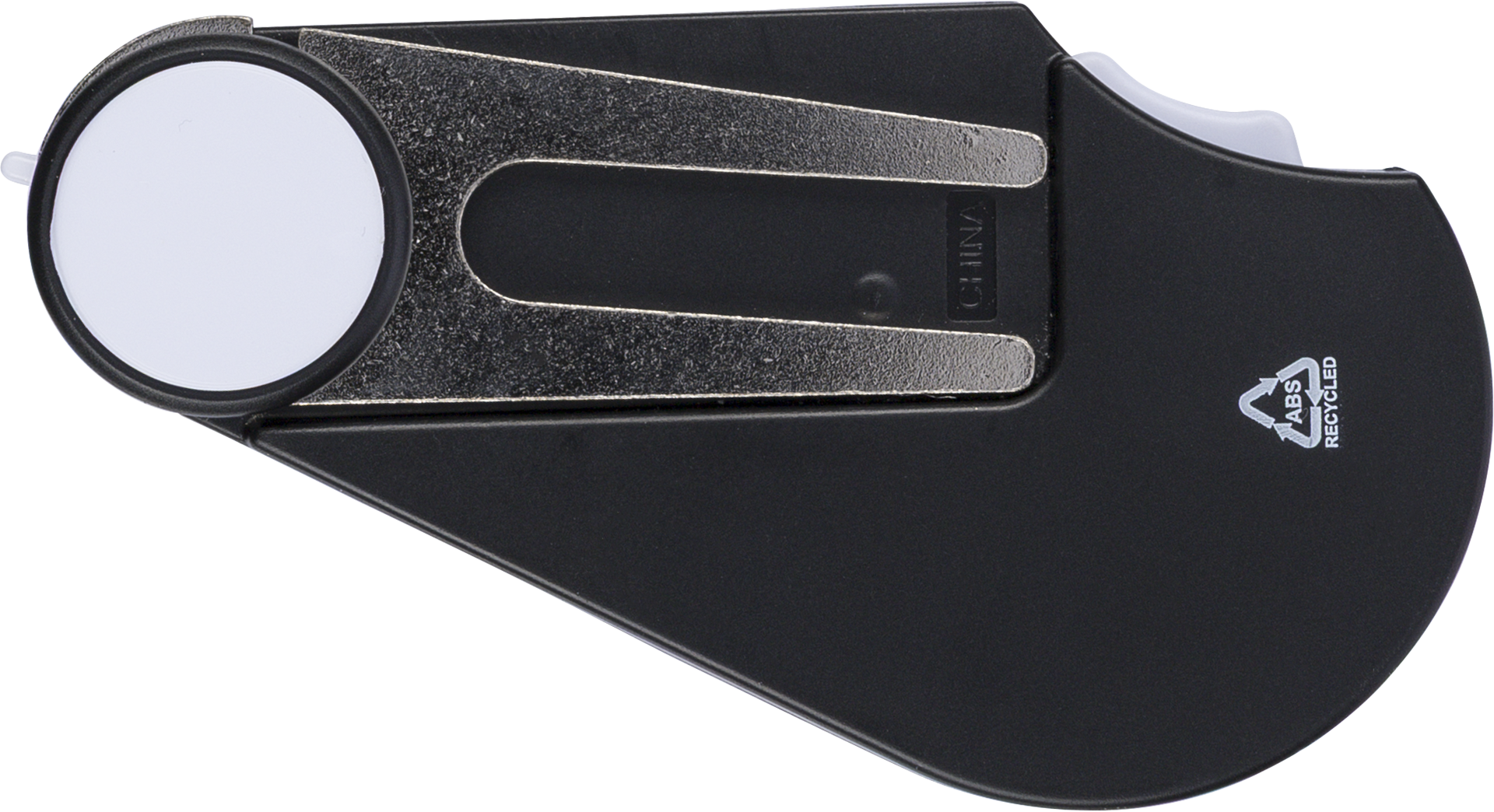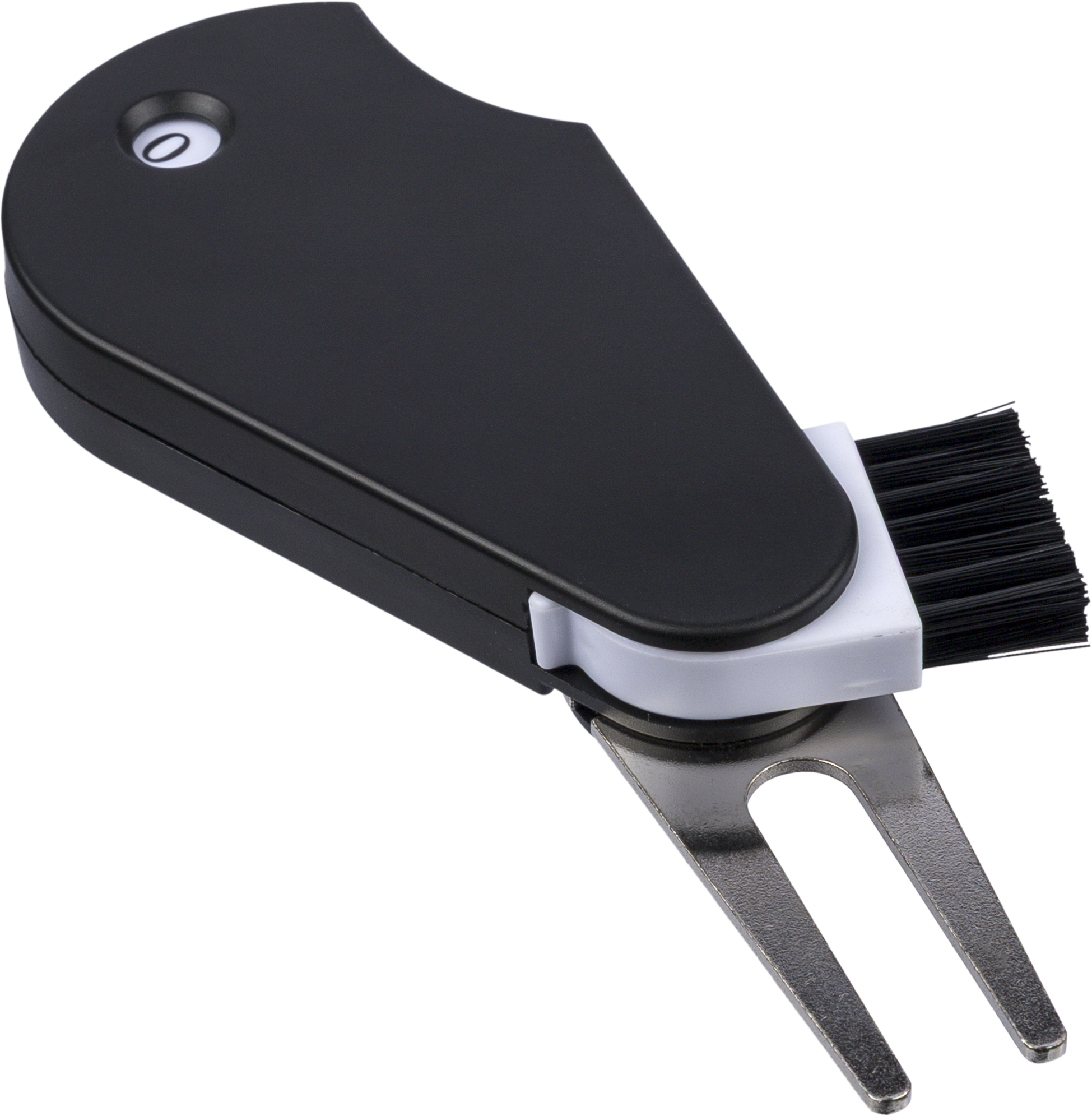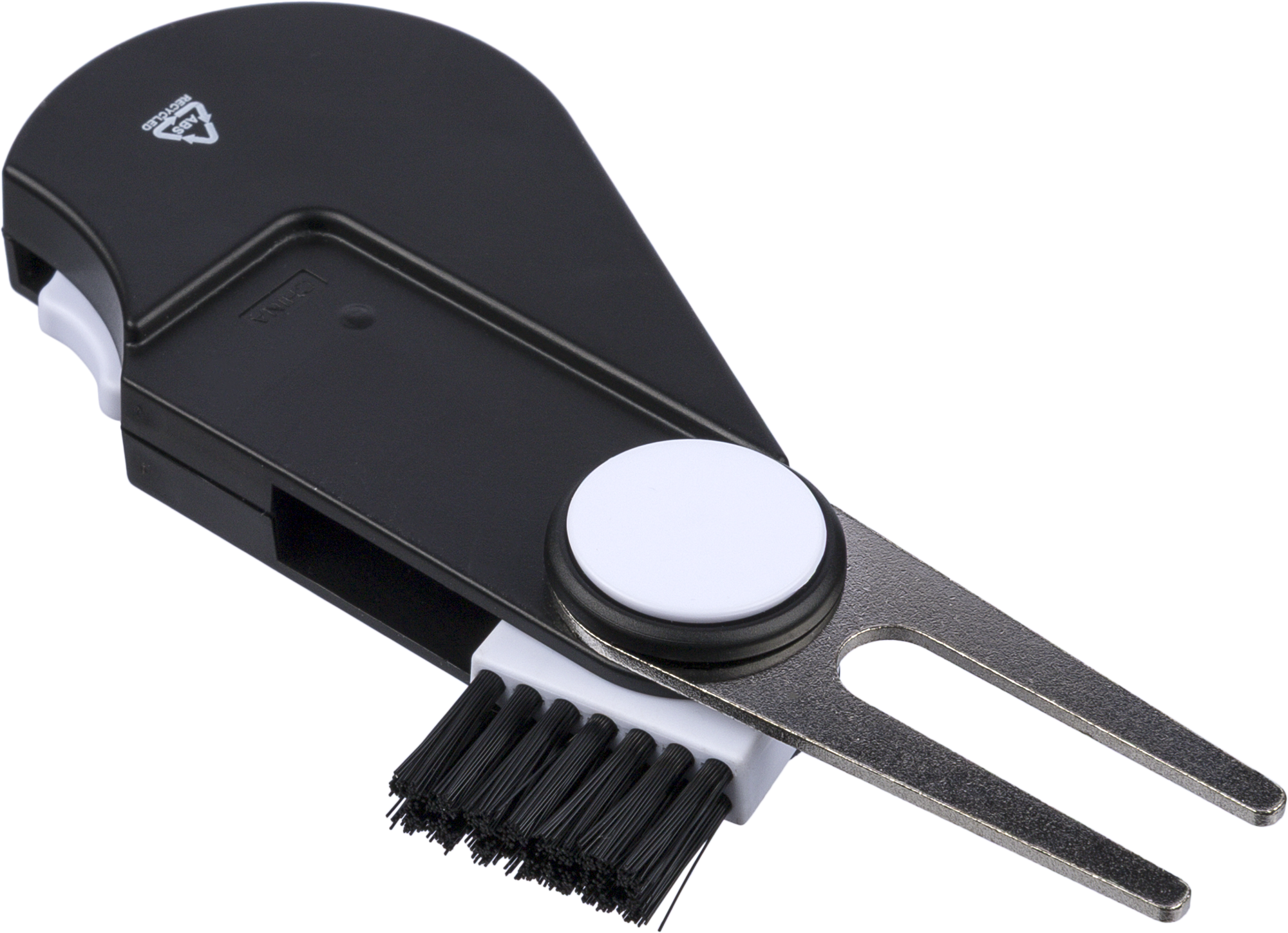 Recycled multi-functional golf tool with integrated marker, pitch fork, cleaning brush and score counter. Features a Recycled logo on the reverse.
