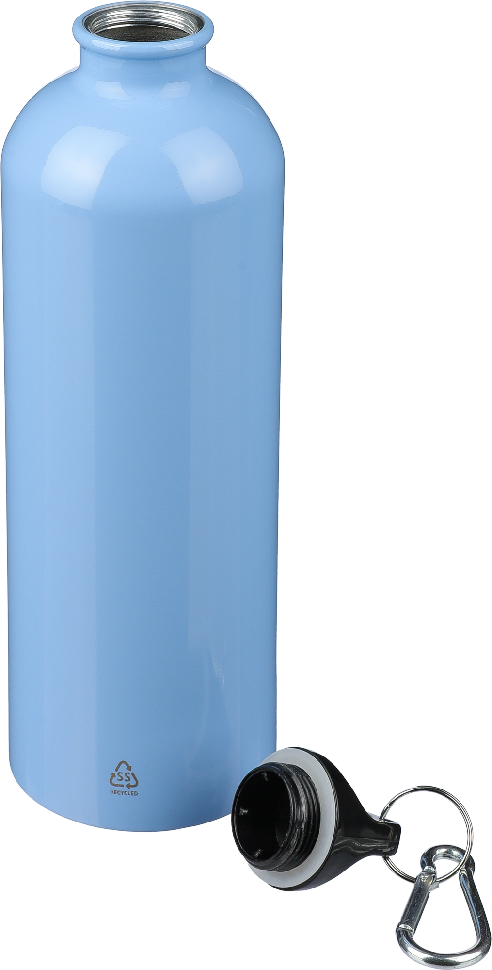 Recycled stainless steel single-walled bottle with a carabiner belt clip. Features a recycled engraved logo on the front. Not dishwasher safe.