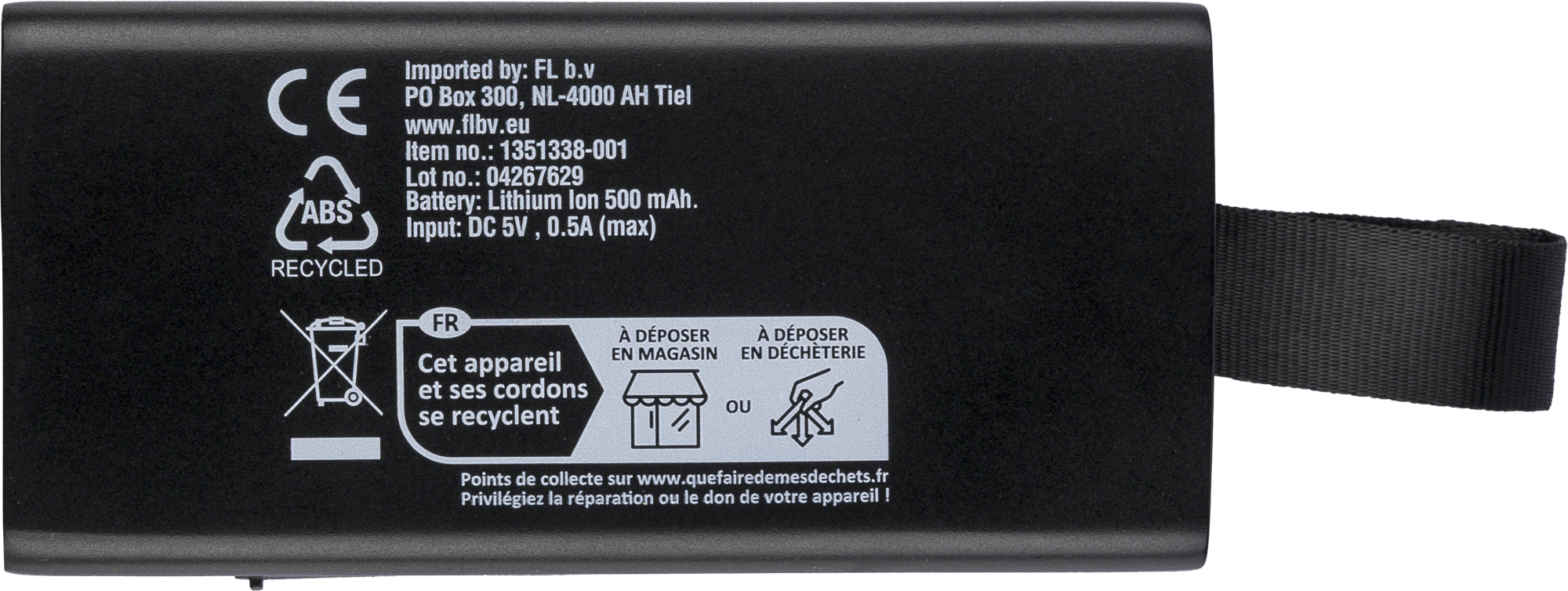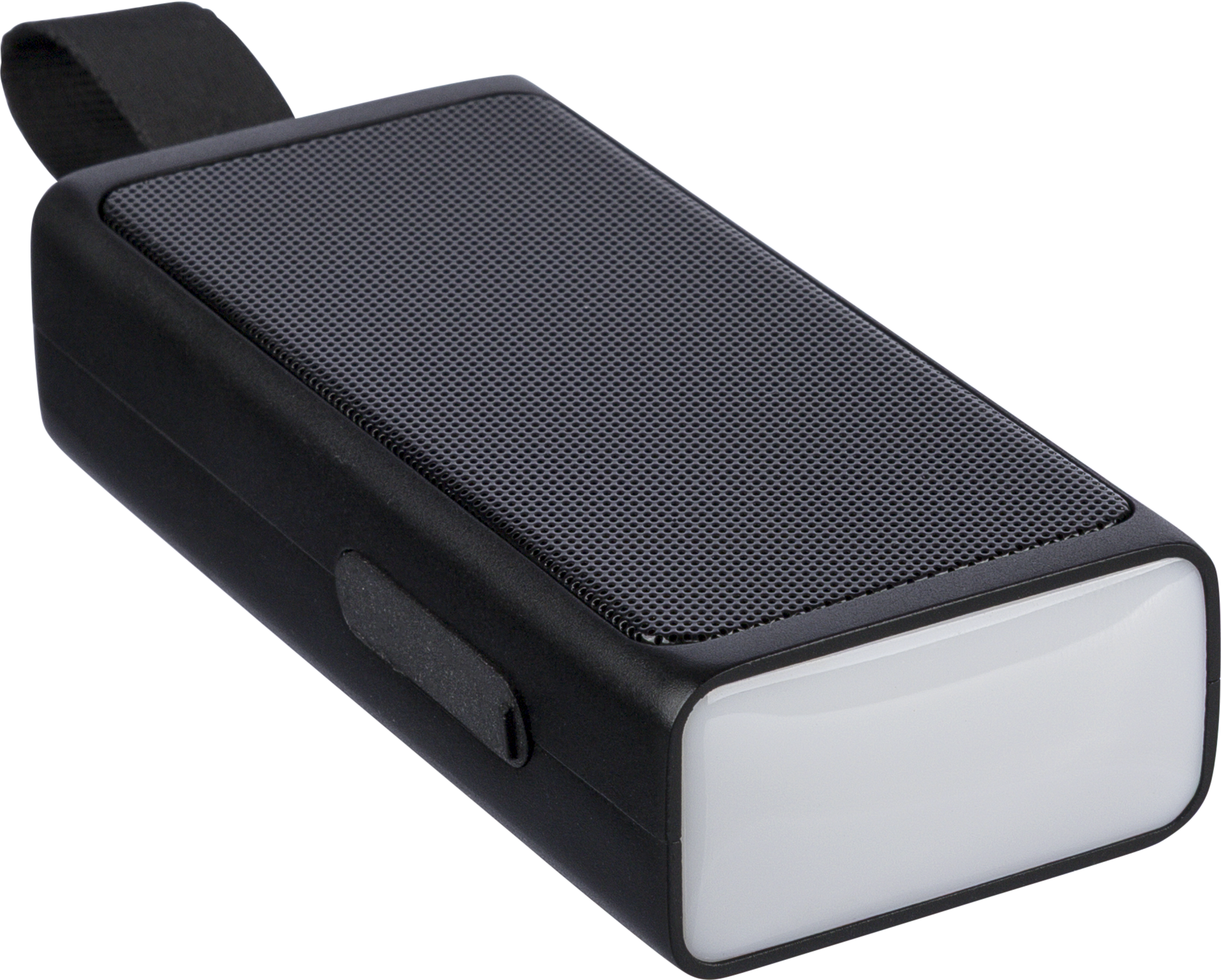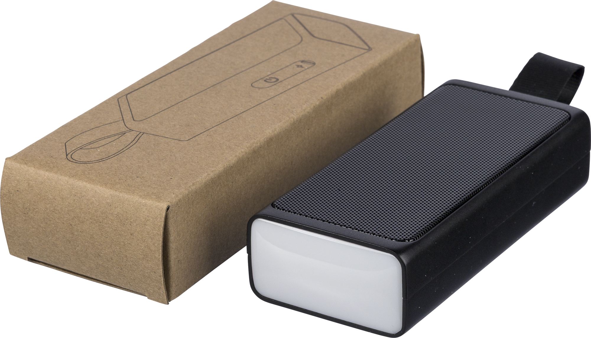 Recycled 5W speaker with a COB LED flashlight, silicone carry loop and wireless tech 5.4. 500 mAh battery, 5V/500 mA input. Outdoor design with recycled logo. Packed in brown box.