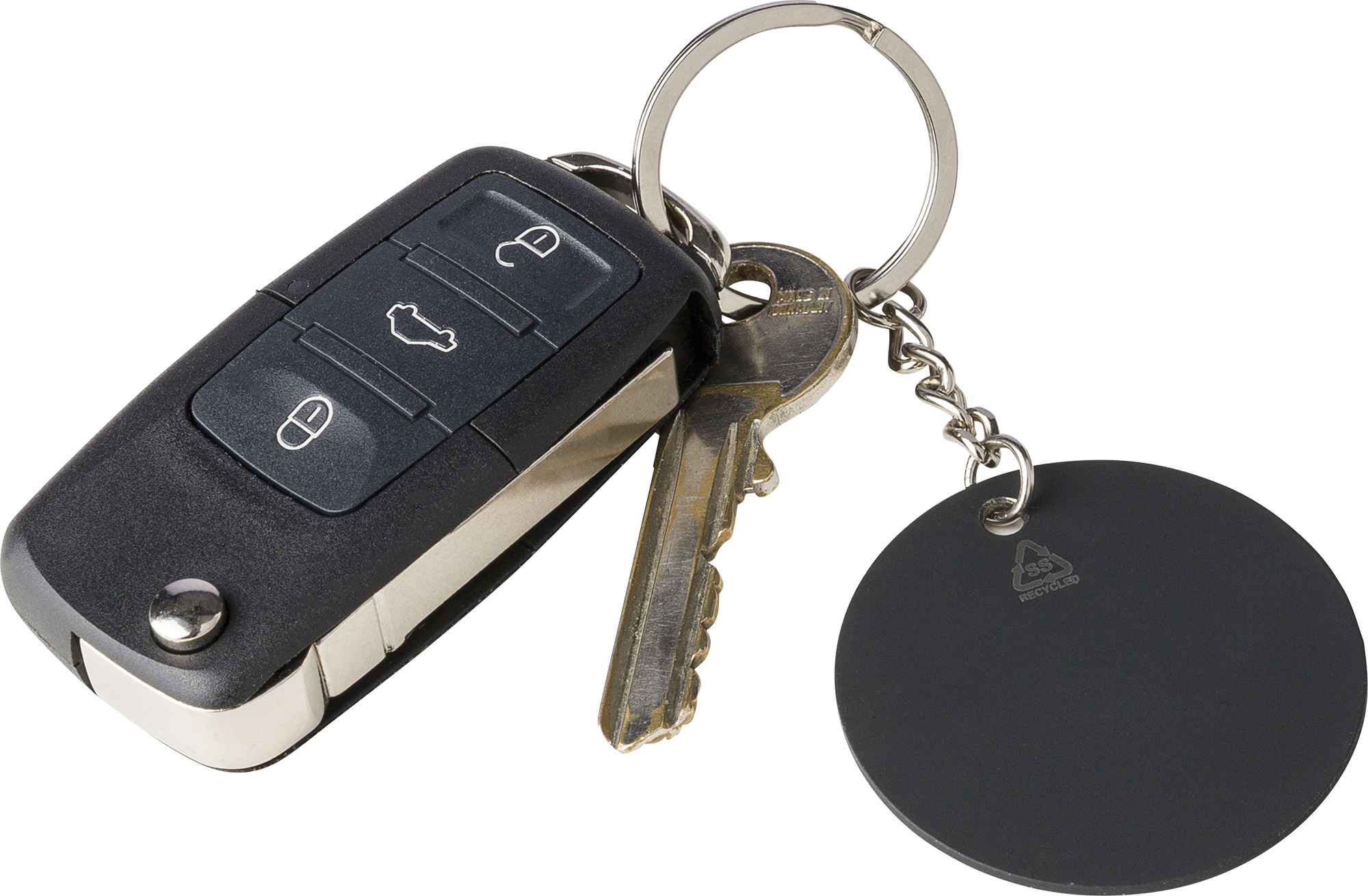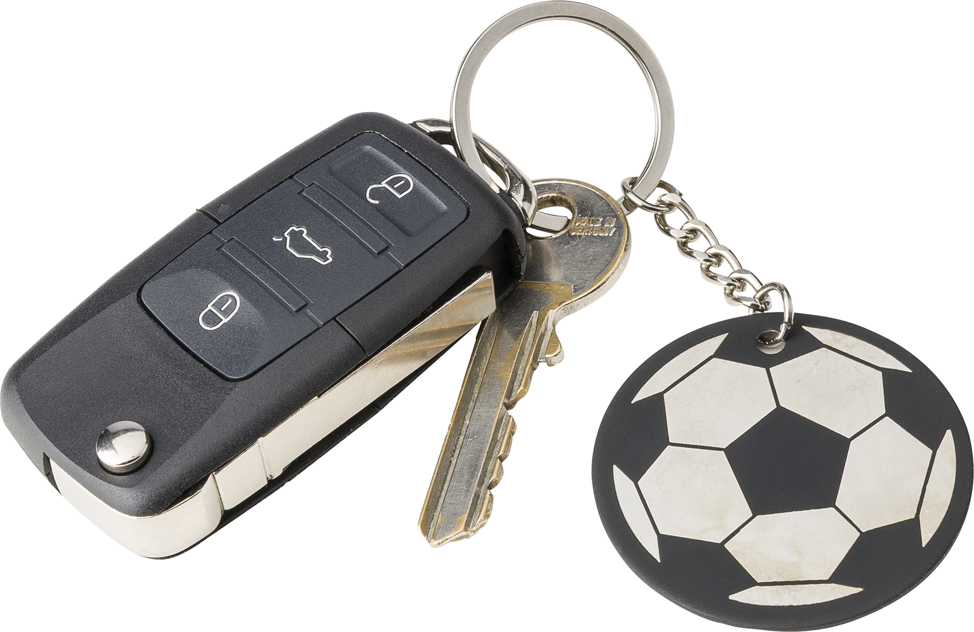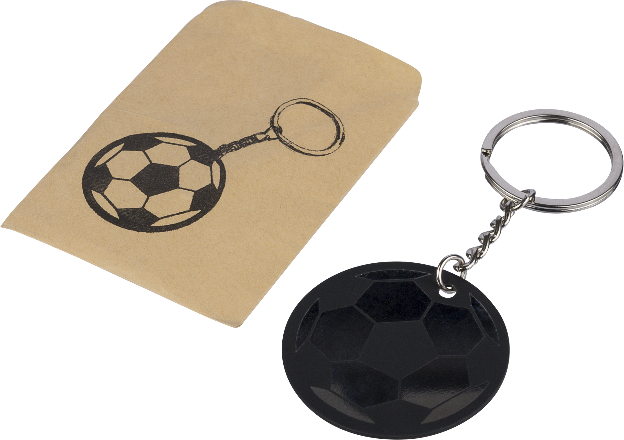 Recycled round stainless steel rubberized keychain with a football design. When engraved it appears in a shiny mirror effect.