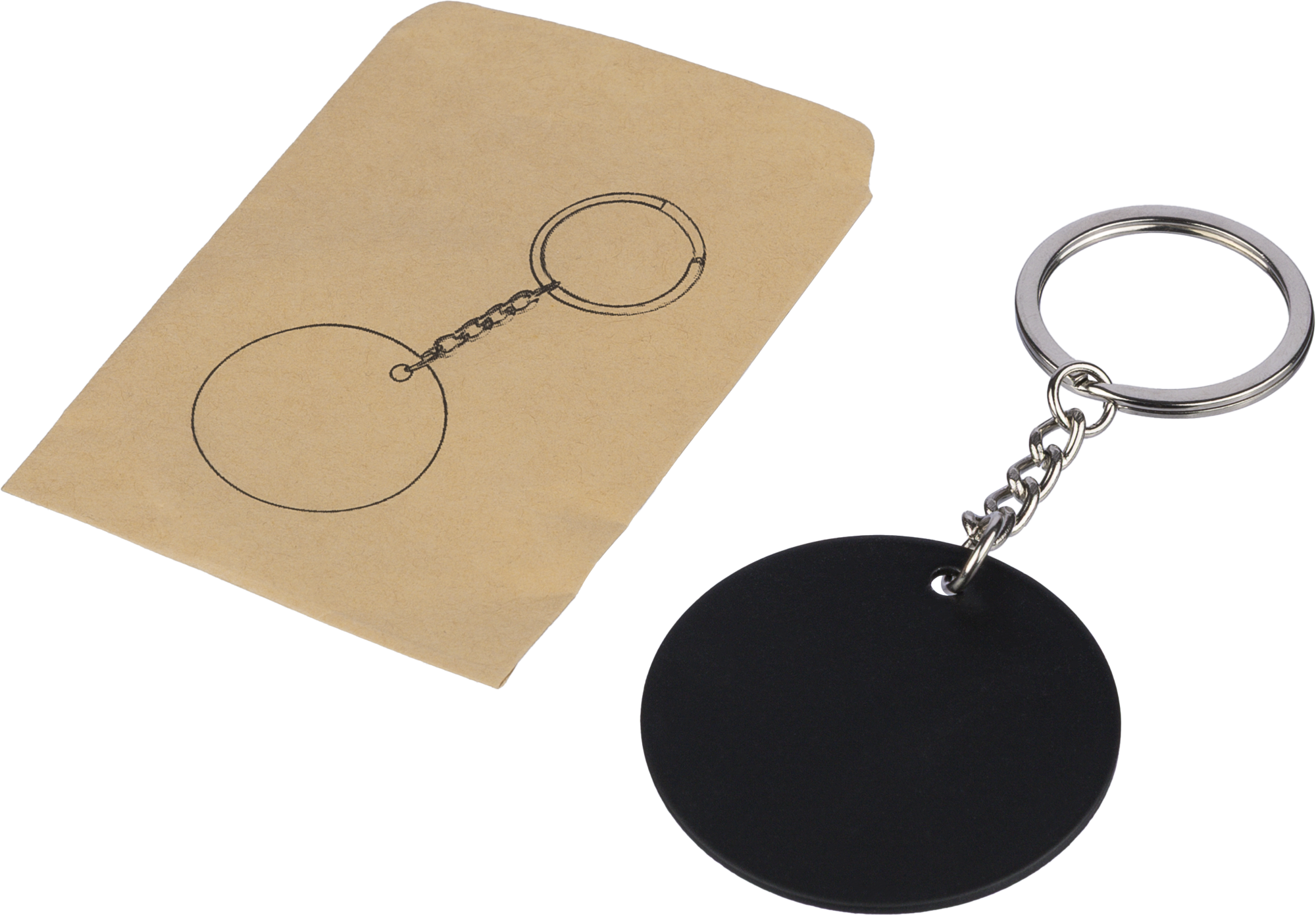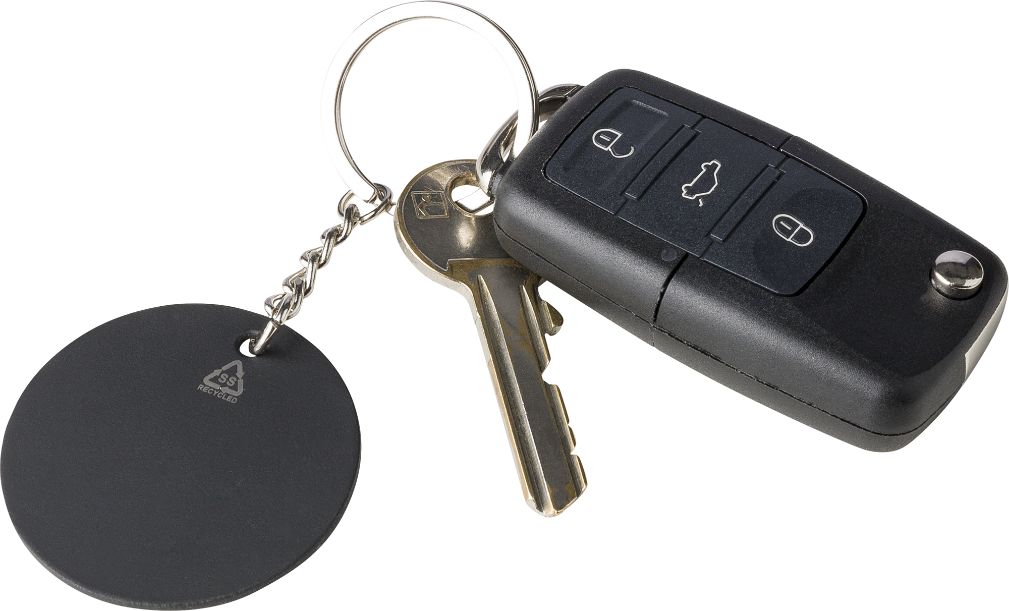 Recycled round stainless steel rubberized keychain. Features an engraved recycled logo. When engraved it appears in a shiny mirror effect.