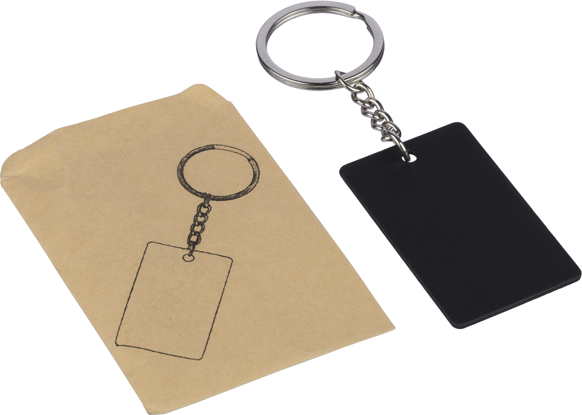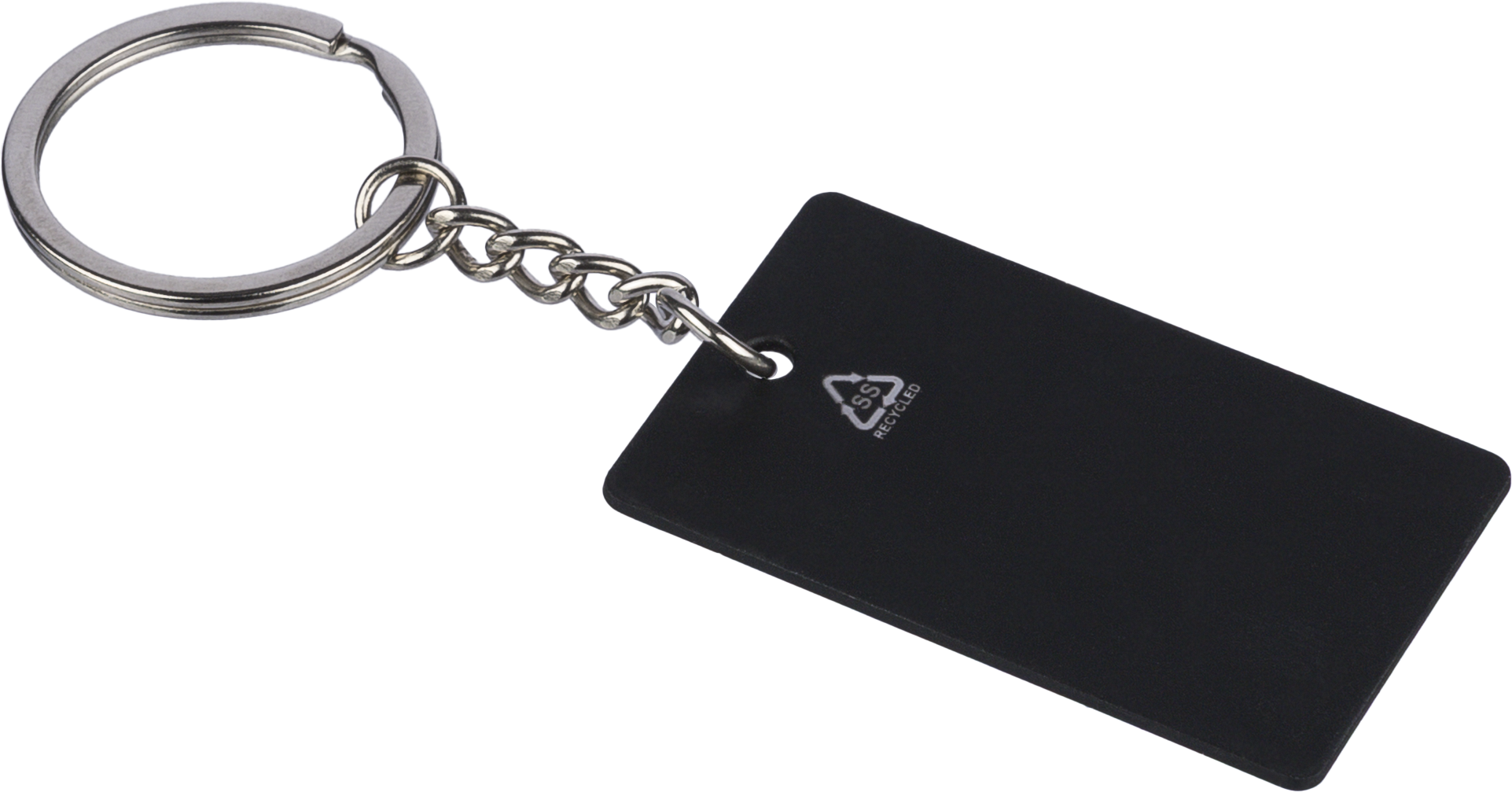 Recycled rectangular stainless steel rubberized keychain. Features an engraved recycled logo. When engraved it appears in a shiny mirror effect.